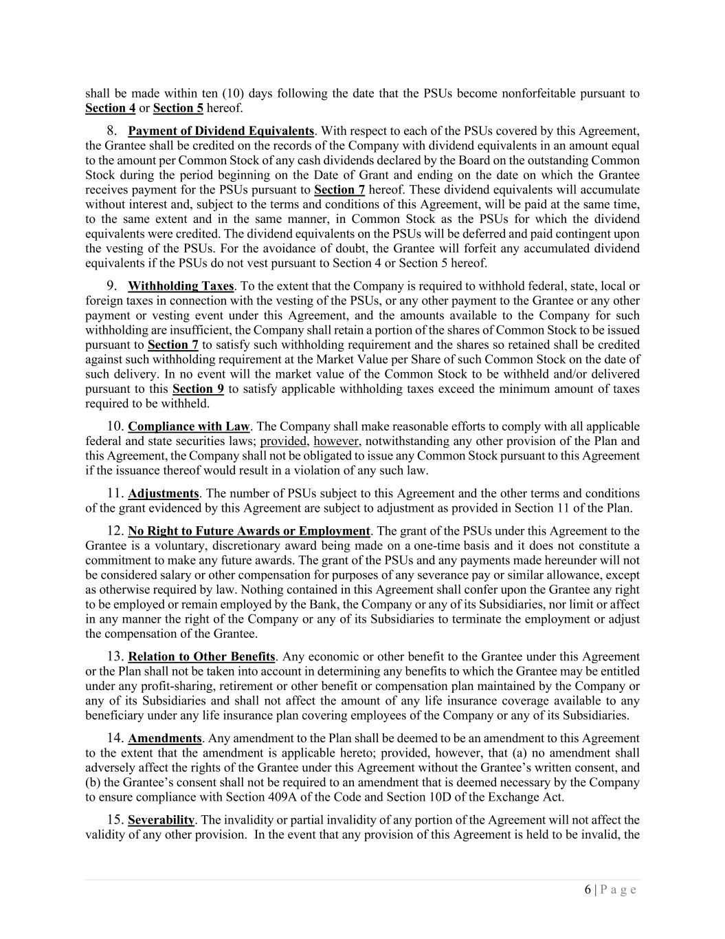 6 | P a g e shall be made within ten (10) days following the date that the PSUs become nonforfeitable pursuant to Section 4 or Section 5 hereof. 8. Payment of Dividend Equivalents. With respect to each of the PSUs covered by this Agreement, the Grantee shall be credited on the records of the Company with dividend equivalents in an amount equal to the amount per Common Stock of any cash dividends declared by the Board on the outstanding Common Stock during the period beginning on the Date of Grant and ending on the date on which the Grantee receives payment for the PSUs pursuant to Section 7 hereof. These dividend equivalents will accumulate without interest and, subject to the terms and conditions of this Agreement, will be paid at the same time, to the same extent and in the same manner, in Common Stock as the PSUs for which the dividend equivalents were credited. The dividend equivalents on the PSUs will be deferred and paid contingent upon the vesting of the PSUs. For the avoidance of doubt, the Grantee will forfeit any accumulated dividend equivalents if the PSUs do not vest pursuant to Section 4 or Section 5 hereof. 9. Withholding Taxes. To the extent that the Company is required to withhold federal, state, local or foreign taxes in connection with the vesting of the PSUs, or any other payment to the Grantee or any other payment or vesting event under this Agreement, and the amounts available to the Company for such withholding are insufficient, the Company shall retain a portion of the shares of Common Stock to be issued pursuant to Section 7 to satisfy such withholding requirement and the shares so retained shall be credited against such withholding requirement at the Market Value per Share of such Common Stock on the date of such delivery. In no event will the market value of the Common Stock to be withheld and/or delivered pursuant to this Section 9 to satisfy applicable withholding taxes exceed the minimum amount of taxes required to be withheld. 10. Compliance with Law. The Company shall make reasonable efforts to comply with all applicable federal and state securities laws; provided, however, notwithstanding any other provision of the Plan and this Agreement, the Company shall not be obligated to issue any Common Stock pursuant to this Agreement if the issuance thereof would result in a violation of any such law. 11. Adjustments. The number of PSUs subject to this Agreement and the other terms and conditions of the grant evidenced by this Agreement are subject to adjustment as provided in Section 11 of the Plan. 12. No Right to Future Awards or Employment. The grant of the PSUs under this Agreement to the Grantee is a voluntary, discretionary award being made on a one-time basis and it does not constitute a commitment to make any future awards. The grant of the PSUs and any payments made hereunder will not be considered salary or other compensation for purposes of any severance pay or similar allowance, except as otherwise required by law. Nothing contained in this Agreement shall confer upon the Grantee any right to be employed or remain employed by the Bank, the Company or any of its Subsidiaries, nor limit or affect in any manner the right of the Company or any of its Subsidiaries to terminate the employment or adjust the compensation of the Grantee. 13. Relation to Other Benefits. Any economic or other benefit to the Grantee under this Agreement or the Plan shall not be taken into account in determining any benefits to which the Grantee may be entitled under any profit-sharing, retirement or other benefit or compensation plan maintained by the Company or any of its Subsidiaries and shall not affect the amount of any life insurance coverage available to any beneficiary under any life insurance plan covering employees of the Company or any of its Subsidiaries. 14. Amendments. Any amendment to the Plan shall be deemed to be an amendment to this Agreement to the extent that the amendment is applicable hereto; provided, however, that (a) no amendment shall adversely affect the rights of the Grantee under this Agreement without the Grantee’s written consent, and (b) the Grantee’s consent shall not be required to an amendment that is deemed necessary by the Company to ensure compliance with Section 409A of the Code and Section 10D of the Exchange Act. 15. Severability. The invalidity or partial invalidity of any portion of the Agreement will not affect the validity of any other provision. In the event that any provision of this Agreement is held to be invalid, the