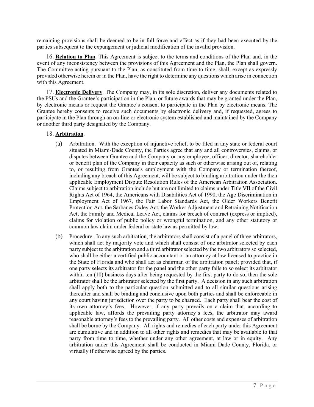 7 | P a g e remaining provisions shall be deemed to be in full force and effect as if they had been executed by the parties subsequent to the expungement or judicial modification of the invalid provision. 16. Relation to Plan. This Agreement is subject to the terms and conditions of the Plan and, in the event of any inconsistency between the provisions of this Agreement and the Plan, the Plan shall govern. The Committee acting pursuant to the Plan, as constituted from time to time, shall, except as expressly provided otherwise herein or in the Plan, have the right to determine any questions which arise in connection with this Agreement. 17. Electronic Delivery. The Company may, in its sole discretion, deliver any documents related to the PSUs and the Grantee’s participation in the Plan, or future awards that may be granted under the Plan, by electronic means or request the Grantee’s consent to participate in the Plan by electronic means. The Grantee hereby consents to receive such documents by electronic delivery and, if requested, agrees to participate in the Plan through an on-line or electronic system established and maintained by the Company or another third party designated by the Company. 18. Arbitration. (a) Arbitration. With the exception of injunctive relief, to be filed in any state or federal court situated in Miami-Dade County, the Parties agree that any and all controversies, claims, or disputes between Grantee and the Company or any employee, officer, director, shareholder or benefit plan of the Company in their capacity as such or otherwise arising out of, relating to, or resulting from Grantee's employment with the Company or termination thereof, including any breach of this Agreement, will be subject to binding arbitration under the then applicable Employment Dispute Resolution Rules of the American Arbitration Association. Claims subject to arbitration include but are not limited to claims under Title VII of the Civil Rights Act of 1964, the Americans with Disabilities Act of 1990, the Age Discrimination in Employment Act of 1967, the Fair Labor Standards Act, the Older Workers Benefit Protection Act, the Sarbanes Oxley Act, the Worker Adjustment and Retraining Notification Act, the Family and Medical Leave Act, claims for breach of contract (express or implied), claims for violation of public policy or wrongful termination, and any other statutory or common law claim under federal or state law as permitted by law. (b) Procedure. In any such arbitration, the arbitrators shall consist of a panel of three arbitrators, which shall act by majority vote and which shall consist of one arbitrator selected by each party subject to the arbitration and a third arbitrator selected by the two arbitrators so selected, who shall be either a certified public accountant or an attorney at law licensed to practice in the State of Florida and who shall act as chairman of the arbitration panel; provided that, if one party selects its arbitrator for the panel and the other party fails to so select its arbitrator within ten (10) business days after being requested by the first party to do so, then the sole arbitrator shall be the arbitrator selected by the first party. A decision in any such arbitration shall apply both to the particular question submitted and to all similar questions arising thereafter and shall be binding and conclusive upon both parties and shall be enforceable in any court having jurisdiction over the party to be charged. Each party shall bear the cost of its own attorney’s fees. However, if any party prevails on a claim that, according to applicable law, affords the prevailing party attorney’s fees, the arbitrator may award reasonable attorney’s fees to the prevailing party. All other costs and expenses of arbitration shall be borne by the Company. All rights and remedies of each party under this Agreement are cumulative and in addition to all other rights and remedies that may be available to that party from time to time, whether under any other agreement, at law or in equity. Any arbitration under this Agreement shall be conducted in Miami Dade County, Florida, or virtually if otherwise agreed by the parties.