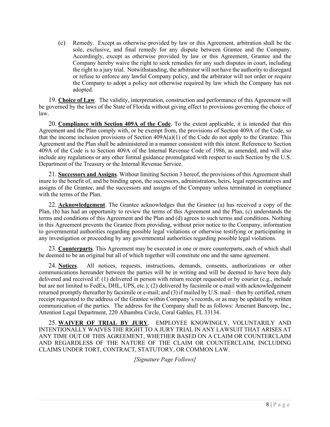 8 | P a g e (c) Remedy. Except as otherwise provided by law or this Agreement, arbitration shall be the sole, exclusive, and final remedy for any dispute between Grantee and the Company. Accordingly, except as otherwise provided by law or this Agreement, Grantee and the Company hereby waive the right to seek remedies for any such disputes in court, including the right to a jury trial. Notwithstanding, the arbitrator will not have the authority to disregard or refuse to enforce any lawful Company policy, and the arbitrator will not order or require the Company to adopt a policy not otherwise required by law which the Company has not adopted. 19. Choice of Law. The validity, interpretation, construction and performance of this Agreement will be governed by the laws of the State of Florida without giving effect to provisions governing the choice of law. 20. Compliance with Section 409A of the Code. To the extent applicable, it is intended that this Agreement and the Plan comply with, or be exempt from, the provisions of Section 409A of the Code, so that the income inclusion provisions of Section 409A(a)(1) of the Code do not apply to the Grantee. This Agreement and the Plan shall be administered in a manner consistent with this intent. Reference to Section 409A of the Code is to Section 409A of the Internal Revenue Code of 1986, as amended, and will also include any regulations or any other formal guidance promulgated with respect to such Section by the U.S. Department of the Treasury or the Internal Revenue Service. 21. Successors and Assigns. Without limiting Section 3 hereof, the provisions of this Agreement shall inure to the benefit of, and be binding upon, the successors, administrators, heirs, legal representatives and assigns of the Grantee, and the successors and assigns of the Company unless terminated in compliance with the terms of the Plan. 22. Acknowledgement. The Grantee acknowledges that the Grantee (a) has received a copy of the Plan, (b) has had an opportunity to review the terms of this Agreement and the Plan, (c) understands the terms and conditions of this Agreement and the Plan and (d) agrees to such terms and conditions. Nothing in this Agreement prevents the Grantee from providing, without prior notice to the Company, information to governmental authorities regarding possible legal violations or otherwise testifying or participating in any investigation or proceeding by any governmental authorities regarding possible legal violations. 23. Counterparts. This Agreement may be executed in one or more counterparts, each of which shall be deemed to be an original but all of which together will constitute one and the same agreement. 24. Notices. All notices, requests, instructions, demands, consents, authorizations or other communications hereunder between the parties will be in writing and will be deemed to have been duly delivered and received if: (1) delivered in person with return receipt requested or by courier (e.g., include but are not limited to FedEx, DHL, UPS, etc.); (2) delivered by facsimile or e-mail with acknowledgement returned promptly thereafter by facsimile or e-mail; and (3) if mailed by U.S. mail – then by certified, return receipt requested to the address of the Grantee within Company’s records, or as may be updated by written communication of the parties. The address for the Company shall be as follows: Amerant Bancorp, Inc., Attention Legal Department, 220 Alhambra Circle, Coral Gables, FL 33134. 25. WAIVER OF TRIAL BY JURY. EMPLOYEE KNOWINGLY, VOLUNTARILY AND INTENTIONALLY WAIVES THE RIGHT TO A JURY TRIAL IN ANY LAWSUIT THAT ARISES AT ANY TIME OUT OF THIS AGREEMENT, WHETHER BASED ON A CLAIM OR COUNTERCLAIM AND REGARDLESS OF THE NATURE OF THE CLAIM OR COUNTERCLAIM, INCLUDING CLAIMS UNDER TORT, CONTRACT, STATUTORY, OR COMMON LAW. [Signature Page Follows]