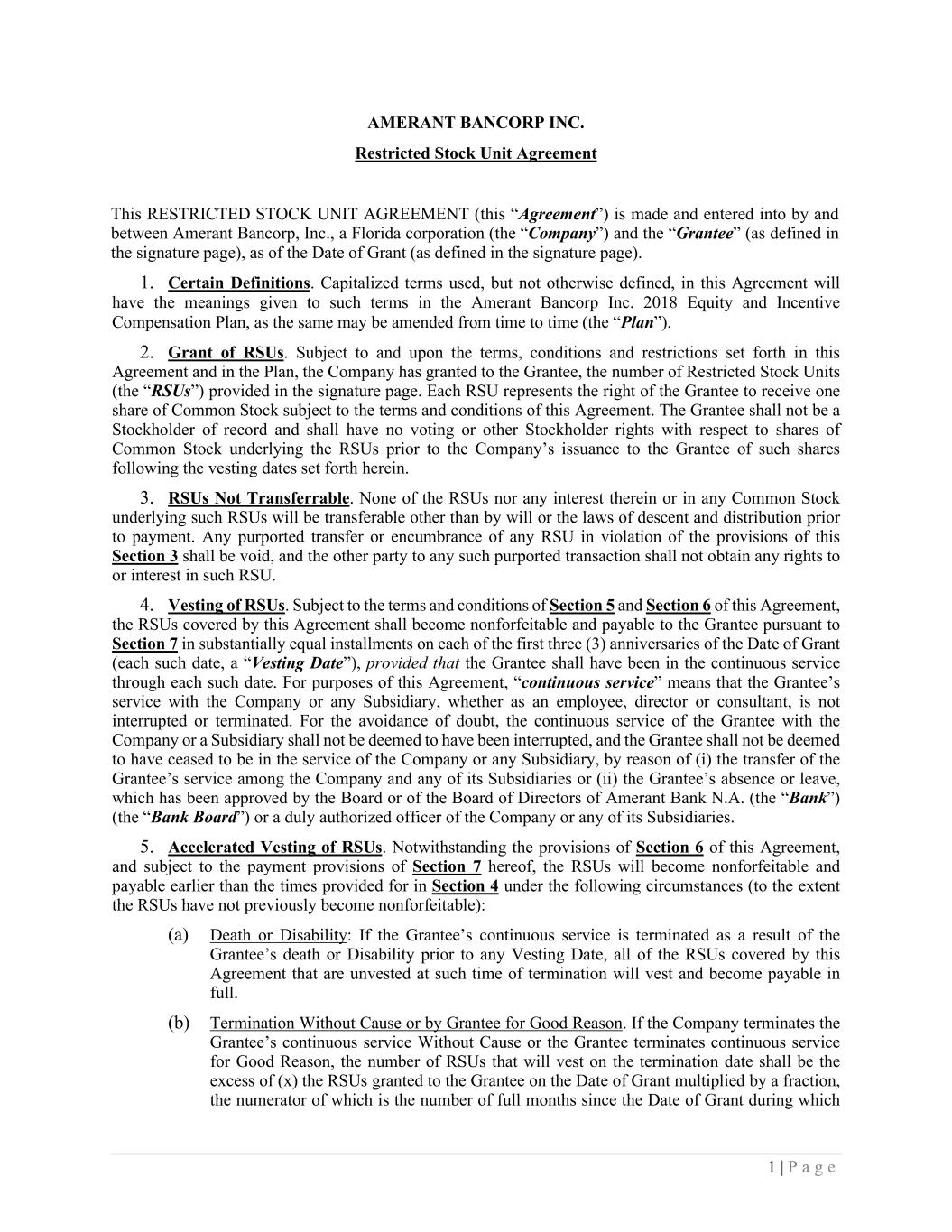 1 | P a g e AMERANT BANCORP INC. Restricted Stock Unit Agreement This RESTRICTED STOCK UNIT AGREEMENT (this “Agreement”) is made and entered into by and between Amerant Bancorp, Inc., a Florida corporation (the “Company”) and the “Grantee” (as defined in the signature page), as of the Date of Grant (as defined in the signature page). 1. Certain Definitions. Capitalized terms used, but not otherwise defined, in this Agreement will have the meanings given to such terms in the Amerant Bancorp Inc. 2018 Equity and Incentive Compensation Plan, as the same may be amended from time to time (the “Plan”). 2. Grant of RSUs. Subject to and upon the terms, conditions and restrictions set forth in this Agreement and in the Plan, the Company has granted to the Grantee, the number of Restricted Stock Units (the “RSUs”) provided in the signature page. Each RSU represents the right of the Grantee to receive one share of Common Stock subject to the terms and conditions of this Agreement. The Grantee shall not be a Stockholder of record and shall have no voting or other Stockholder rights with respect to shares of Common Stock underlying the RSUs prior to the Company’s issuance to the Grantee of such shares following the vesting dates set forth herein. 3. RSUs Not Transferrable. None of the RSUs nor any interest therein or in any Common Stock underlying such RSUs will be transferable other than by will or the laws of descent and distribution prior to payment. Any purported transfer or encumbrance of any RSU in violation of the provisions of this Section 3 shall be void, and the other party to any such purported transaction shall not obtain any rights to or interest in such RSU. 4. Vesting of RSUs. Subject to the terms and conditions of Section 5 and Section 6 of this Agreement, the RSUs covered by this Agreement shall become nonforfeitable and payable to the Grantee pursuant to Section 7 in substantially equal installments on each of the first three (3) anniversaries of the Date of Grant (each such date, a “Vesting Date”), provided that the Grantee shall have been in the continuous service through each such date. For purposes of this Agreement, “continuous service” means that the Grantee’s service with the Company or any Subsidiary, whether as an employee, director or consultant, is not interrupted or terminated. For the avoidance of doubt, the continuous service of the Grantee with the Company or a Subsidiary shall not be deemed to have been interrupted, and the Grantee shall not be deemed to have ceased to be in the service of the Company or any Subsidiary, by reason of (i) the transfer of the Grantee’s service among the Company and any of its Subsidiaries or (ii) the Grantee’s absence or leave, which has been approved by the Board or of the Board of Directors of Amerant Bank N.A. (the “Bank”) (the “Bank Board”) or a duly authorized officer of the Company or any of its Subsidiaries. 5. Accelerated Vesting of RSUs. Notwithstanding the provisions of Section 6 of this Agreement, and subject to the payment provisions of Section 7 hereof, the RSUs will become nonforfeitable and payable earlier than the times provided for in Section 4 under the following circumstances (to the extent the RSUs have not previously become nonforfeitable): (a) Death or Disability: If the Grantee’s continuous service is terminated as a result of the Grantee’s death or Disability prior to any Vesting Date, all of the RSUs covered by this Agreement that are unvested at such time of termination will vest and become payable in full. (b) Termination Without Cause or by Grantee for Good Reason. If the Company terminates the Grantee’s continuous service Without Cause or the Grantee terminates continuous service for Good Reason, the number of RSUs that will vest on the termination date shall be the excess of (x) the RSUs granted to the Grantee on the Date of Grant multiplied by a fraction, the numerator of which is the number of full months since the Date of Grant during which