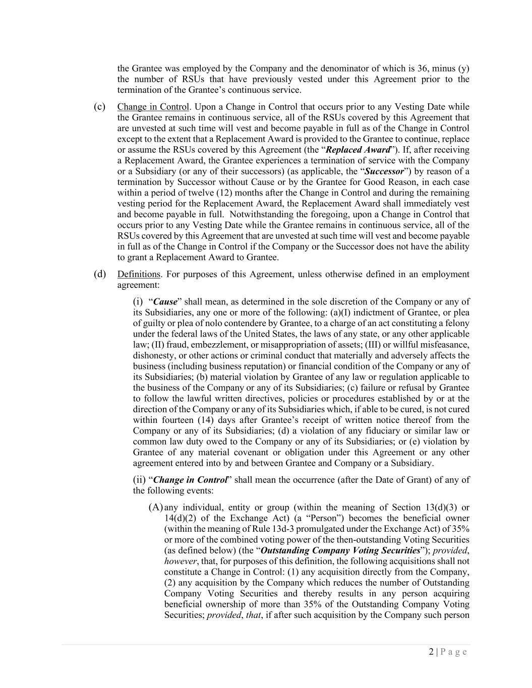 2 | P a g e the Grantee was employed by the Company and the denominator of which is 36, minus (y) the number of RSUs that have previously vested under this Agreement prior to the termination of the Grantee’s continuous service. (c) Change in Control. Upon a Change in Control that occurs prior to any Vesting Date while the Grantee remains in continuous service, all of the RSUs covered by this Agreement that are unvested at such time will vest and become payable in full as of the Change in Control except to the extent that a Replacement Award is provided to the Grantee to continue, replace or assume the RSUs covered by this Agreement (the “Replaced Award”). If, after receiving a Replacement Award, the Grantee experiences a termination of service with the Company or a Subsidiary (or any of their successors) (as applicable, the “Successor”) by reason of a termination by Successor without Cause or by the Grantee for Good Reason, in each case within a period of twelve (12) months after the Change in Control and during the remaining vesting period for the Replacement Award, the Replacement Award shall immediately vest and become payable in full. Notwithstanding the foregoing, upon a Change in Control that occurs prior to any Vesting Date while the Grantee remains in continuous service, all of the RSUs covered by this Agreement that are unvested at such time will vest and become payable in full as of the Change in Control if the Company or the Successor does not have the ability to grant a Replacement Award to Grantee. (d) Definitions. For purposes of this Agreement, unless otherwise defined in an employment agreement: (i) “Cause” shall mean, as determined in the sole discretion of the Company or any of its Subsidiaries, any one or more of the following: (a)(I) indictment of Grantee, or plea of guilty or plea of nolo contendere by Grantee, to a charge of an act constituting a felony under the federal laws of the United States, the laws of any state, or any other applicable law; (II) fraud, embezzlement, or misappropriation of assets; (III) or willful misfeasance, dishonesty, or other actions or criminal conduct that materially and adversely affects the business (including business reputation) or financial condition of the Company or any of its Subsidiaries; (b) material violation by Grantee of any law or regulation applicable to the business of the Company or any of its Subsidiaries; (c) failure or refusal by Grantee to follow the lawful written directives, policies or procedures established by or at the direction of the Company or any of its Subsidiaries which, if able to be cured, is not cured within fourteen (14) days after Grantee’s receipt of written notice thereof from the Company or any of its Subsidiaries; (d) a violation of any fiduciary or similar law or common law duty owed to the Company or any of its Subsidiaries; or (e) violation by Grantee of any material covenant or obligation under this Agreement or any other agreement entered into by and between Grantee and Company or a Subsidiary. (ii) “Change in Control” shall mean the occurrence (after the Date of Grant) of any of the following events: (A) any individual, entity or group (within the meaning of Section 13(d)(3) or 14(d)(2) of the Exchange Act) (a “Person”) becomes the beneficial owner (within the meaning of Rule 13d-3 promulgated under the Exchange Act) of 35% or more of the combined voting power of the then-outstanding Voting Securities (as defined below) (the “Outstanding Company Voting Securities”); provided, however, that, for purposes of this definition, the following acquisitions shall not constitute a Change in Control: (1) any acquisition directly from the Company, (2) any acquisition by the Company which reduces the number of Outstanding Company Voting Securities and thereby results in any person acquiring beneficial ownership of more than 35% of the Outstanding Company Voting Securities; provided, that, if after such acquisition by the Company such person
