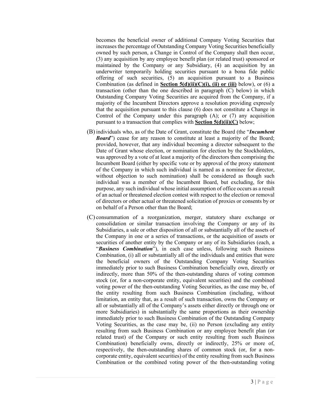 3 | P a g e becomes the beneficial owner of additional Company Voting Securities that increases the percentage of Outstanding Company Voting Securities beneficially owned by such person, a Change in Control of the Company shall then occur, (3) any acquisition by any employee benefit plan (or related trust) sponsored or maintained by the Company or any Subsidiary, (4) an acquisition by an underwriter temporarily holding securities pursuant to a bona fide public offering of such securities, (5) an acquisition pursuant to a Business Combination (as defined in Section 5(d)(ii)(C)(i), (ii) or (iii) below), or (6) a transaction (other than the one described in paragraph (C) below) in which Outstanding Company Voting Securities are acquired from the Company, if a majority of the Incumbent Directors approve a resolution providing expressly that the acquisition pursuant to this clause (6) does not constitute a Change in Control of the Company under this paragraph (A); or (7) any acquisition pursuant to a transaction that complies with Section 5(d)(ii)(C) below; (B) individuals who, as of the Date of Grant, constitute the Board (the “Incumbent Board”) cease for any reason to constitute at least a majority of the Board; provided, however, that any individual becoming a director subsequent to the Date of Grant whose election, or nomination for election by the Stockholders, was approved by a vote of at least a majority of the directors then comprising the Incumbent Board (either by specific vote or by approval of the proxy statement of the Company in which such individual is named as a nominee for director, without objection to such nomination) shall be considered as though such individual was a member of the Incumbent Board, but excluding, for this purpose, any such individual whose initial assumption of office occurs as a result of an actual or threatened election contest with respect to the election or removal of directors or other actual or threatened solicitation of proxies or consents by or on behalf of a Person other than the Board; (C) consummation of a reorganization, merger, statutory share exchange or consolidation or similar transaction involving the Company or any of its Subsidiaries, a sale or other disposition of all or substantially all of the assets of the Company in one or a series of transactions, or the acquisition of assets or securities of another entity by the Company or any of its Subsidiaries (each, a “Business Combination”), in each case unless, following such Business Combination, (i) all or substantially all of the individuals and entities that were the beneficial owners of the Outstanding Company Voting Securities immediately prior to such Business Combination beneficially own, directly or indirectly, more than 50% of the then-outstanding shares of voting common stock (or, for a non-corporate entity, equivalent securities) and the combined voting power of the then-outstanding Voting Securities, as the case may be, of the entity resulting from such Business Combination (including, without limitation, an entity that, as a result of such transaction, owns the Company or all or substantially all of the Company’s assets either directly or through one or more Subsidiaries) in substantially the same proportions as their ownership immediately prior to such Business Combination of the Outstanding Company Voting Securities, as the case may be, (ii) no Person (excluding any entity resulting from such Business Combination or any employee benefit plan (or related trust) of the Company or such entity resulting from such Business Combination) beneficially owns, directly or indirectly, 25% or more of, respectively, the then-outstanding shares of common stock (or, for a non- corporate entity, equivalent securities) of the entity resulting from such Business Combination or the combined voting power of the then-outstanding voting