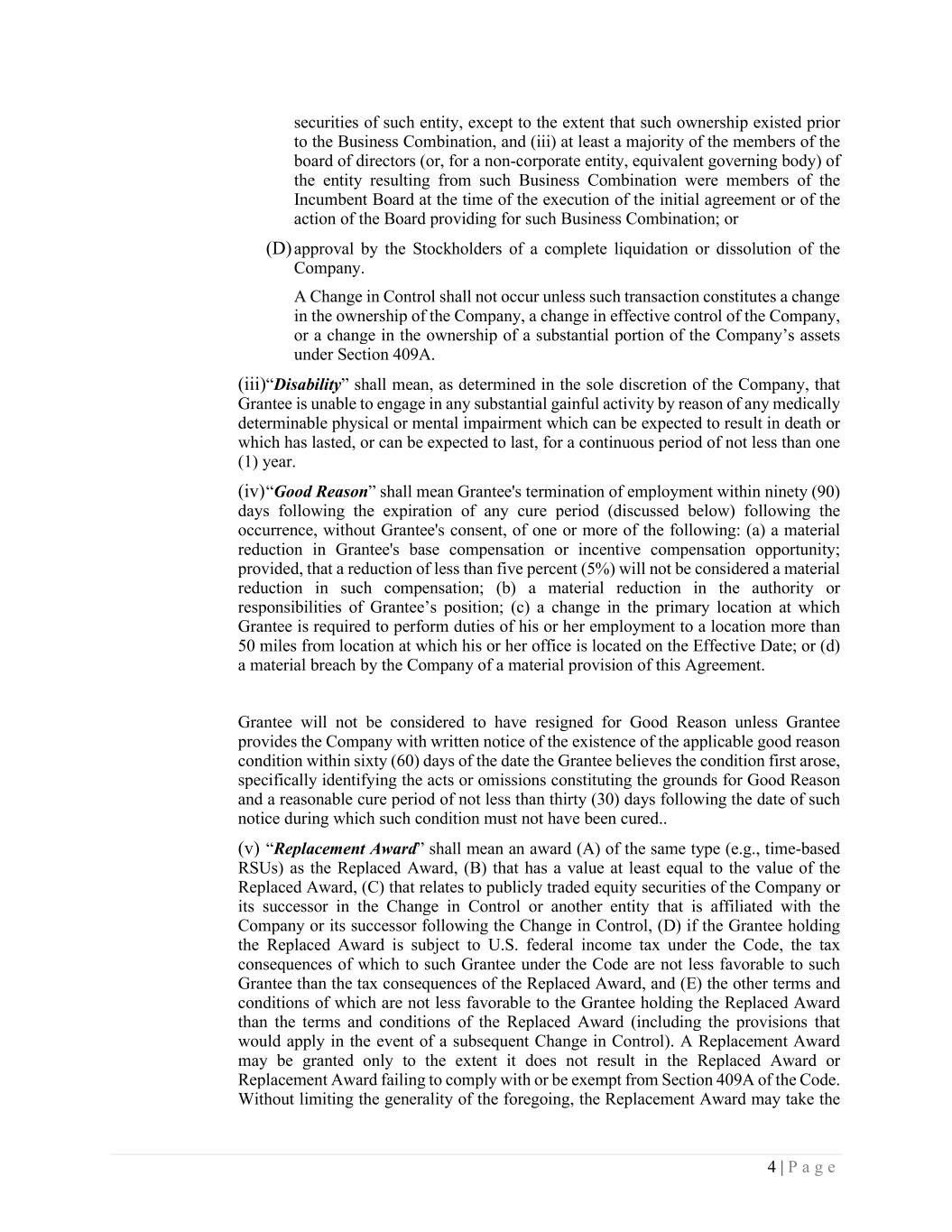 4 | P a g e securities of such entity, except to the extent that such ownership existed prior to the Business Combination, and (iii) at least a majority of the members of the board of directors (or, for a non-corporate entity, equivalent governing body) of the entity resulting from such Business Combination were members of the Incumbent Board at the time of the execution of the initial agreement or of the action of the Board providing for such Business Combination; or (D) approval by the Stockholders of a complete liquidation or dissolution of the Company. A Change in Control shall not occur unless such transaction constitutes a change in the ownership of the Company, a change in effective control of the Company, or a change in the ownership of a substantial portion of the Company’s assets under Section 409A. (iii)“Disability” shall mean, as determined in the sole discretion of the Company, that Grantee is unable to engage in any substantial gainful activity by reason of any medically determinable physical or mental impairment which can be expected to result in death or which has lasted, or can be expected to last, for a continuous period of not less than one (1) year. (iv) “Good Reason” shall mean Grantee's termination of employment within ninety (90) days following the expiration of any cure period (discussed below) following the occurrence, without Grantee's consent, of one or more of the following: (a) a material reduction in Grantee's base compensation or incentive compensation opportunity; provided, that a reduction of less than five percent (5%) will not be considered a material reduction in such compensation; (b) a material reduction in the authority or responsibilities of Grantee’s position; (c) a change in the primary location at which Grantee is required to perform duties of his or her employment to a location more than 50 miles from location at which his or her office is located on the Effective Date; or (d) a material breach by the Company of a material provision of this Agreement. Grantee will not be considered to have resigned for Good Reason unless Grantee provides the Company with written notice of the existence of the applicable good reason condition within sixty (60) days of the date the Grantee believes the condition first arose, specifically identifying the acts or omissions constituting the grounds for Good Reason and a reasonable cure period of not less than thirty (30) days following the date of such notice during which such condition must not have been cured.. (v) “Replacement Award” shall mean an award (A) of the same type (e.g., time-based RSUs) as the Replaced Award, (B) that has a value at least equal to the value of the Replaced Award, (C) that relates to publicly traded equity securities of the Company or its successor in the Change in Control or another entity that is affiliated with the Company or its successor following the Change in Control, (D) if the Grantee holding the Replaced Award is subject to U.S. federal income tax under the Code, the tax consequences of which to such Grantee under the Code are not less favorable to such Grantee than the tax consequences of the Replaced Award, and (E) the other terms and conditions of which are not less favorable to the Grantee holding the Replaced Award than the terms and conditions of the Replaced Award (including the provisions that would apply in the event of a subsequent Change in Control). A Replacement Award may be granted only to the extent it does not result in the Replaced Award or Replacement Award failing to comply with or be exempt from Section 409A of the Code. Without limiting the generality of the foregoing, the Replacement Award may take the