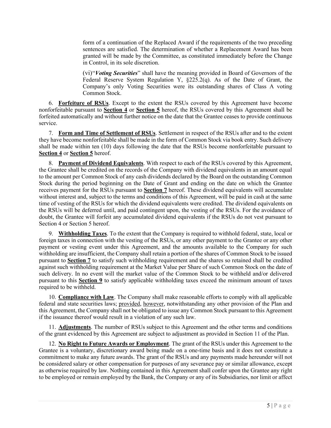 5 | P a g e form of a continuation of the Replaced Award if the requirements of the two preceding sentences are satisfied. The determination of whether a Replacement Award has been granted will be made by the Committee, as constituted immediately before the Change in Control, in its sole discretion. (vi) “Voting Securities” shall have the meaning provided in Board of Governors of the Federal Reserve System Regulation Y, §225.2(q). As of the Date of Grant, the Company’s only Voting Securities were its outstanding shares of Class A voting Common Stock. 6. Forfeiture of RSUs. Except to the extent the RSUs covered by this Agreement have become nonforfeitable pursuant to Section 4 or Section 5 hereof, the RSUs covered by this Agreement shall be forfeited automatically and without further notice on the date that the Grantee ceases to provide continuous service. 7. Form and Time of Settlement of RSUs. Settlement in respect of the RSUs after and to the extent they have become nonforfeitable shall be made in the form of Common Stock via book entry. Such delivery shall be made within ten (10) days following the date that the RSUs become nonforfeitable pursuant to Section 4 or Section 5 hereof. 8. Payment of Dividend Equivalents. With respect to each of the RSUs covered by this Agreement, the Grantee shall be credited on the records of the Company with dividend equivalents in an amount equal to the amount per Common Stock of any cash dividends declared by the Board on the outstanding Common Stock during the period beginning on the Date of Grant and ending on the date on which the Grantee receives payment for the RSUs pursuant to Section 7 hereof. These dividend equivalents will accumulate without interest and, subject to the terms and conditions of this Agreement, will be paid in cash at the same time of vesting of the RSUs for which the dividend equivalents were credited. The dividend equivalents on the RSUs will be deferred until, and paid contingent upon, the vesting of the RSUs. For the avoidance of doubt, the Grantee will forfeit any accumulated dividend equivalents if the RSUs do not vest pursuant to Section 4 or Section 5 hereof. 9. Withholding Taxes. To the extent that the Company is required to withhold federal, state, local or foreign taxes in connection with the vesting of the RSUs, or any other payment to the Grantee or any other payment or vesting event under this Agreement, and the amounts available to the Company for such withholding are insufficient, the Company shall retain a portion of the shares of Common Stock to be issued pursuant to Section 7 to satisfy such withholding requirement and the shares so retained shall be credited against such withholding requirement at the Market Value per Share of such Common Stock on the date of such delivery. In no event will the market value of the Common Stock to be withheld and/or delivered pursuant to this Section 9 to satisfy applicable withholding taxes exceed the minimum amount of taxes required to be withheld. 10. Compliance with Law. The Company shall make reasonable efforts to comply with all applicable federal and state securities laws; provided, however, notwithstanding any other provision of the Plan and this Agreement, the Company shall not be obligated to issue any Common Stock pursuant to this Agreement if the issuance thereof would result in a violation of any such law. 11. Adjustments. The number of RSUs subject to this Agreement and the other terms and conditions of the grant evidenced by this Agreement are subject to adjustment as provided in Section 11 of the Plan. 12. No Right to Future Awards or Employment. The grant of the RSUs under this Agreement to the Grantee is a voluntary, discretionary award being made on a one-time basis and it does not constitute a commitment to make any future awards. The grant of the RSUs and any payments made hereunder will not be considered salary or other compensation for purposes of any severance pay or similar allowance, except as otherwise required by law. Nothing contained in this Agreement shall confer upon the Grantee any right to be employed or remain employed by the Bank, the Company or any of its Subsidiaries, nor limit or affect