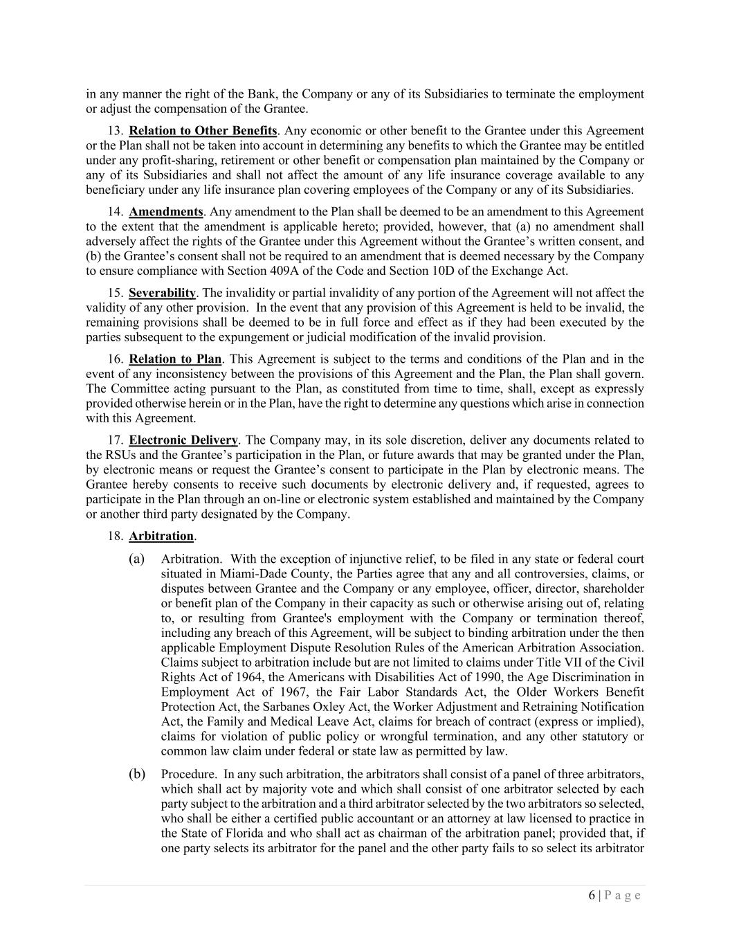 6 | P a g e in any manner the right of the Bank, the Company or any of its Subsidiaries to terminate the employment or adjust the compensation of the Grantee. 13. Relation to Other Benefits. Any economic or other benefit to the Grantee under this Agreement or the Plan shall not be taken into account in determining any benefits to which the Grantee may be entitled under any profit-sharing, retirement or other benefit or compensation plan maintained by the Company or any of its Subsidiaries and shall not affect the amount of any life insurance coverage available to any beneficiary under any life insurance plan covering employees of the Company or any of its Subsidiaries. 14. Amendments. Any amendment to the Plan shall be deemed to be an amendment to this Agreement to the extent that the amendment is applicable hereto; provided, however, that (a) no amendment shall adversely affect the rights of the Grantee under this Agreement without the Grantee’s written consent, and (b) the Grantee’s consent shall not be required to an amendment that is deemed necessary by the Company to ensure compliance with Section 409A of the Code and Section 10D of the Exchange Act. 15. Severability. The invalidity or partial invalidity of any portion of the Agreement will not affect the validity of any other provision. In the event that any provision of this Agreement is held to be invalid, the remaining provisions shall be deemed to be in full force and effect as if they had been executed by the parties subsequent to the expungement or judicial modification of the invalid provision. 16. Relation to Plan. This Agreement is subject to the terms and conditions of the Plan and in the event of any inconsistency between the provisions of this Agreement and the Plan, the Plan shall govern. The Committee acting pursuant to the Plan, as constituted from time to time, shall, except as expressly provided otherwise herein or in the Plan, have the right to determine any questions which arise in connection with this Agreement. 17. Electronic Delivery. The Company may, in its sole discretion, deliver any documents related to the RSUs and the Grantee’s participation in the Plan, or future awards that may be granted under the Plan, by electronic means or request the Grantee’s consent to participate in the Plan by electronic means. The Grantee hereby consents to receive such documents by electronic delivery and, if requested, agrees to participate in the Plan through an on-line or electronic system established and maintained by the Company or another third party designated by the Company. 18. Arbitration. (a) Arbitration. With the exception of injunctive relief, to be filed in any state or federal court situated in Miami-Dade County, the Parties agree that any and all controversies, claims, or disputes between Grantee and the Company or any employee, officer, director, shareholder or benefit plan of the Company in their capacity as such or otherwise arising out of, relating to, or resulting from Grantee's employment with the Company or termination thereof, including any breach of this Agreement, will be subject to binding arbitration under the then applicable Employment Dispute Resolution Rules of the American Arbitration Association. Claims subject to arbitration include but are not limited to claims under Title VII of the Civil Rights Act of 1964, the Americans with Disabilities Act of 1990, the Age Discrimination in Employment Act of 1967, the Fair Labor Standards Act, the Older Workers Benefit Protection Act, the Sarbanes Oxley Act, the Worker Adjustment and Retraining Notification Act, the Family and Medical Leave Act, claims for breach of contract (express or implied), claims for violation of public policy or wrongful termination, and any other statutory or common law claim under federal or state law as permitted by law. (b) Procedure. In any such arbitration, the arbitrators shall consist of a panel of three arbitrators, which shall act by majority vote and which shall consist of one arbitrator selected by each party subject to the arbitration and a third arbitrator selected by the two arbitrators so selected, who shall be either a certified public accountant or an attorney at law licensed to practice in the State of Florida and who shall act as chairman of the arbitration panel; provided that, if one party selects its arbitrator for the panel and the other party fails to so select its arbitrator