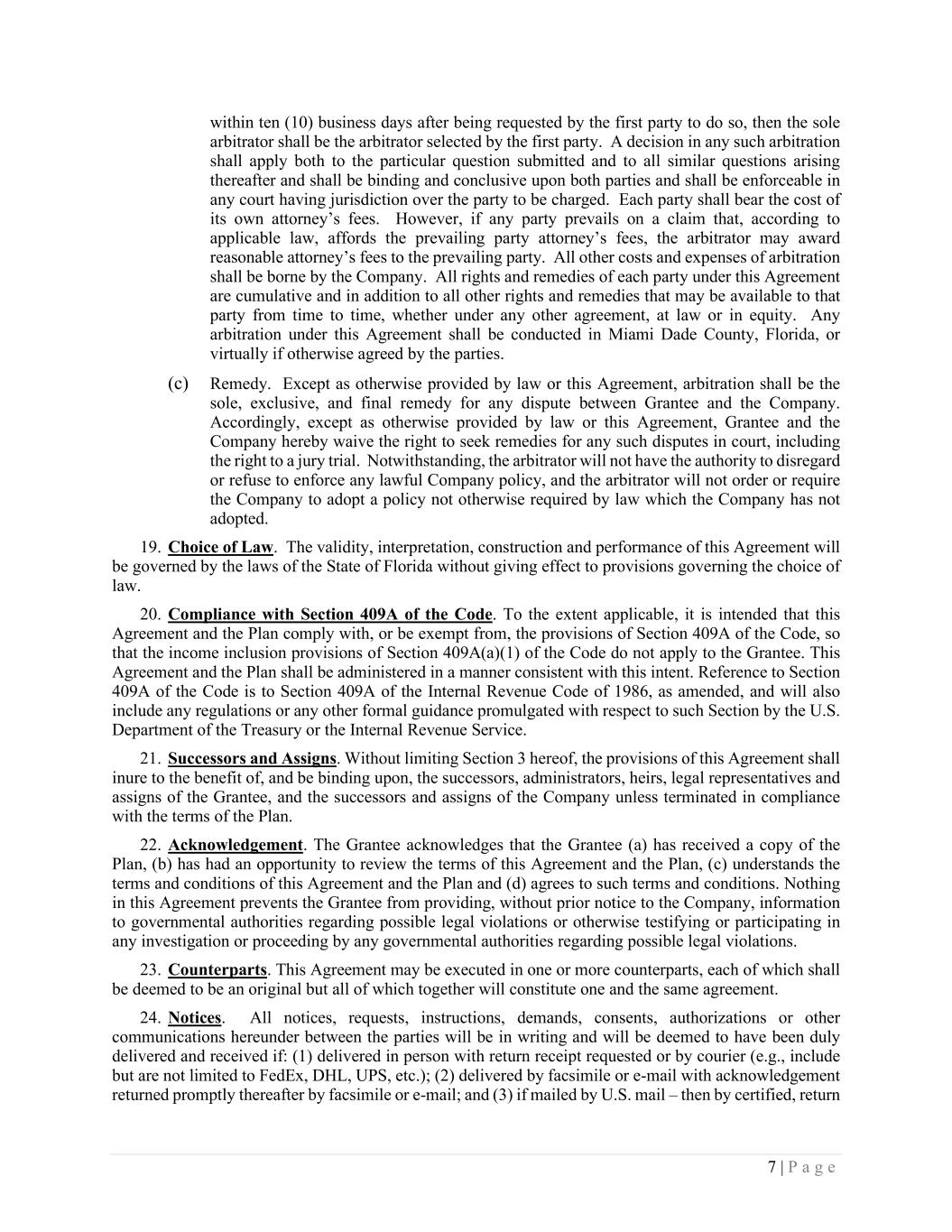 7 | P a g e within ten (10) business days after being requested by the first party to do so, then the sole arbitrator shall be the arbitrator selected by the first party. A decision in any such arbitration shall apply both to the particular question submitted and to all similar questions arising thereafter and shall be binding and conclusive upon both parties and shall be enforceable in any court having jurisdiction over the party to be charged. Each party shall bear the cost of its own attorney’s fees. However, if any party prevails on a claim that, according to applicable law, affords the prevailing party attorney’s fees, the arbitrator may award reasonable attorney’s fees to the prevailing party. All other costs and expenses of arbitration shall be borne by the Company. All rights and remedies of each party under this Agreement are cumulative and in addition to all other rights and remedies that may be available to that party from time to time, whether under any other agreement, at law or in equity. Any arbitration under this Agreement shall be conducted in Miami Dade County, Florida, or virtually if otherwise agreed by the parties. (c) Remedy. Except as otherwise provided by law or this Agreement, arbitration shall be the sole, exclusive, and final remedy for any dispute between Grantee and the Company. Accordingly, except as otherwise provided by law or this Agreement, Grantee and the Company hereby waive the right to seek remedies for any such disputes in court, including the right to a jury trial. Notwithstanding, the arbitrator will not have the authority to disregard or refuse to enforce any lawful Company policy, and the arbitrator will not order or require the Company to adopt a policy not otherwise required by law which the Company has not adopted. 19. Choice of Law. The validity, interpretation, construction and performance of this Agreement will be governed by the laws of the State of Florida without giving effect to provisions governing the choice of law. 20. Compliance with Section 409A of the Code. To the extent applicable, it is intended that this Agreement and the Plan comply with, or be exempt from, the provisions of Section 409A of the Code, so that the income inclusion provisions of Section 409A(a)(1) of the Code do not apply to the Grantee. This Agreement and the Plan shall be administered in a manner consistent with this intent. Reference to Section 409A of the Code is to Section 409A of the Internal Revenue Code of 1986, as amended, and will also include any regulations or any other formal guidance promulgated with respect to such Section by the U.S. Department of the Treasury or the Internal Revenue Service. 21. Successors and Assigns. Without limiting Section 3 hereof, the provisions of this Agreement shall inure to the benefit of, and be binding upon, the successors, administrators, heirs, legal representatives and assigns of the Grantee, and the successors and assigns of the Company unless terminated in compliance with the terms of the Plan. 22. Acknowledgement. The Grantee acknowledges that the Grantee (a) has received a copy of the Plan, (b) has had an opportunity to review the terms of this Agreement and the Plan, (c) understands the terms and conditions of this Agreement and the Plan and (d) agrees to such terms and conditions. Nothing in this Agreement prevents the Grantee from providing, without prior notice to the Company, information to governmental authorities regarding possible legal violations or otherwise testifying or participating in any investigation or proceeding by any governmental authorities regarding possible legal violations. 23. Counterparts. This Agreement may be executed in one or more counterparts, each of which shall be deemed to be an original but all of which together will constitute one and the same agreement. 24. Notices. All notices, requests, instructions, demands, consents, authorizations or other communications hereunder between the parties will be in writing and will be deemed to have been duly delivered and received if: (1) delivered in person with return receipt requested or by courier (e.g., include but are not limited to FedEx, DHL, UPS, etc.); (2) delivered by facsimile or e-mail with acknowledgement returned promptly thereafter by facsimile or e-mail; and (3) if mailed by U.S. mail – then by certified, return