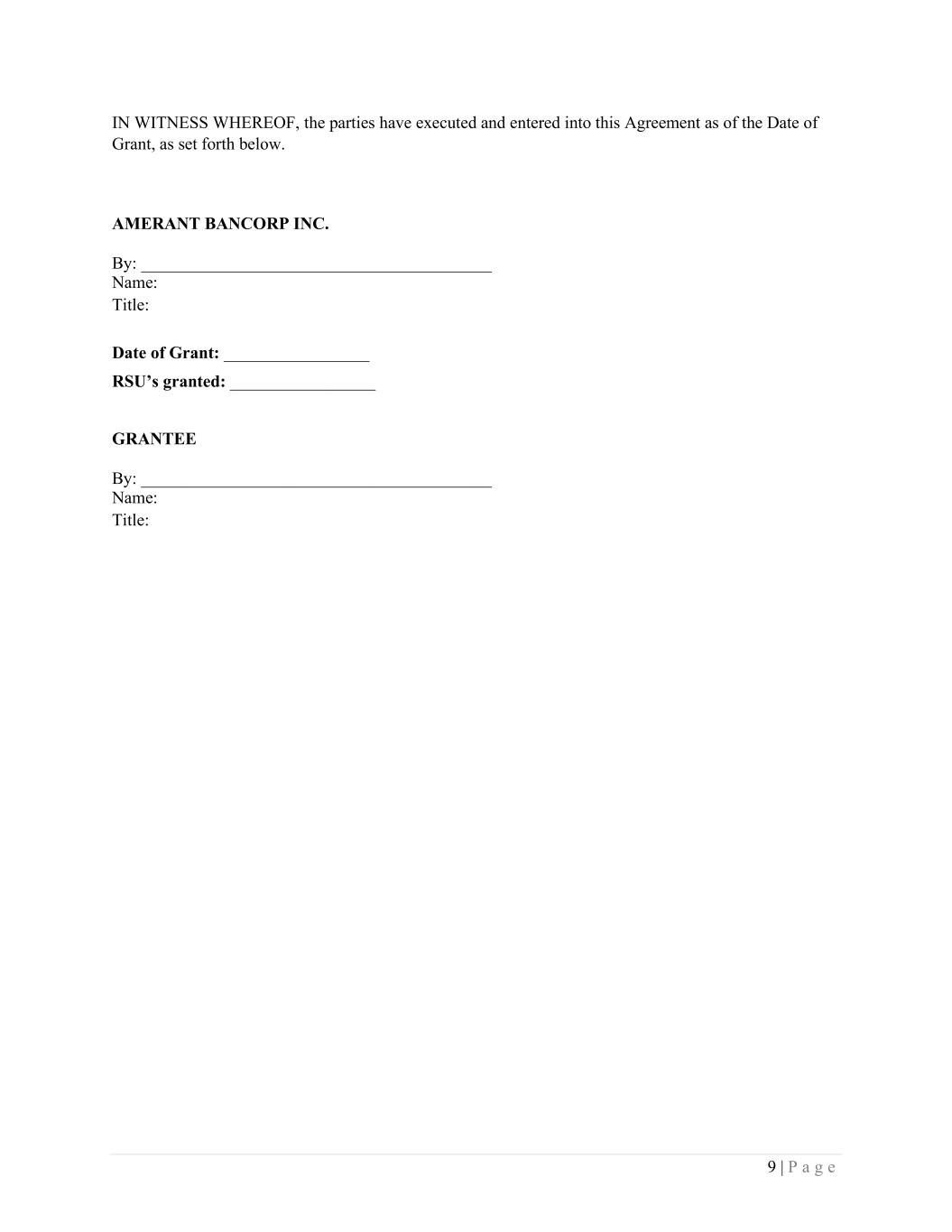 9 | P a g e IN WITNESS WHEREOF, the parties have executed and entered into this Agreement as of the Date of Grant, as set forth below. AMERANT BANCORP INC. By: _________________________________________ Name: Title: Date of Grant: _________________ RSU’s granted: _________________ GRANTEE By: _________________________________________ Name: Title: