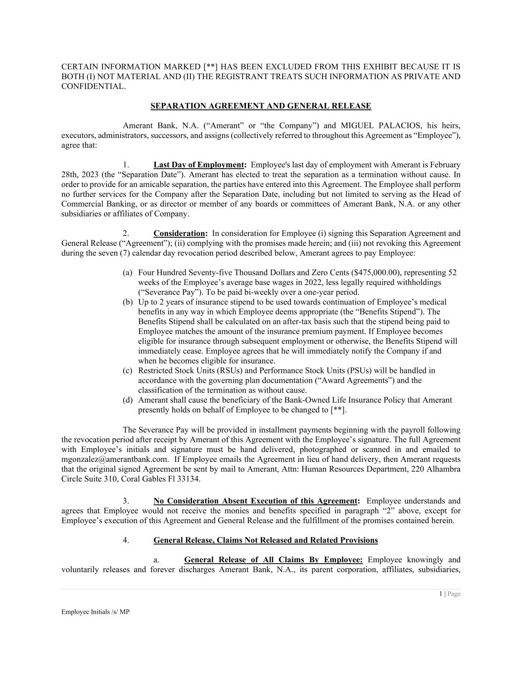 1 | Page Employee Initials /s/ MP CERTAIN INFORMATION MARKED [**] HAS BEEN EXCLUDED FROM THIS EXHIBIT BECAUSE IT IS BOTH (I) NOT MATERIAL AND (II) THE REGISTRANT TREATS SUCH INFORMATION AS PRIVATE AND CONFIDENTIAL. SEPARATION AGREEMENT AND GENERAL RELEASE Amerant Bank, N.A. (“Amerant” or “the Company”) and MIGUEL PALACIOS, his heirs, executors, administrators, successors, and assigns (collectively referred to throughout this Agreement as “Employee”), agree that: 1. Last Day of Employment: Employee's last day of employment with Amerant is February 28th, 2023 (the “Separation Date”). Amerant has elected to treat the separation as a termination without cause. In order to provide for an amicable separation, the parties have entered into this Agreement. The Employee shall perform no further services for the Company after the Separation Date, including but not limited to serving as the Head of Commercial Banking, or as director or member of any boards or committees of Amerant Bank, N.A. or any other subsidiaries or affiliates of Company. 2. Consideration: In consideration for Employee (i) signing this Separation Agreement and General Release (“Agreement”); (ii) complying with the promises made herein; and (iii) not revoking this Agreement during the seven (7) calendar day revocation period described below, Amerant agrees to pay Employee: (a) Four Hundred Seventy-five Thousand Dollars and Zero Cents ($475,000.00), representing 52 weeks of the Employee’s average base wages in 2022, less legally required withholdings (“Severance Pay”). To be paid bi-weekly over a one-year period. (b) Up to 2 years of insurance stipend to be used towards continuation of Employee’s medical benefits in any way in which Employee deems appropriate (the “Benefits Stipend”). The Benefits Stipend shall be calculated on an after-tax basis such that the stipend being paid to Employee matches the amount of the insurance premium payment. If Employee becomes eligible for insurance through subsequent employment or otherwise, the Benefits Stipend will immediately cease. Employee agrees that he will immediately notify the Company if and when he becomes eligible for insurance. (c) Restricted Stock Units (RSUs) and Performance Stock Units (PSUs) will be handled in accordance with the governing plan documentation (“Award Agreements”) and the classification of the termination as without cause. (d) Amerant shall cause the beneficiary of the Bank-Owned Life Insurance Policy that Amerant presently holds on behalf of Employee to be changed to [**]. The Severance Pay will be provided in installment payments beginning with the payroll following the revocation period after receipt by Amerant of this Agreement with the Employee’s signature. The full Agreement with Employee’s initials and signature must be hand delivered, photographed or scanned in and emailed to mgonzalez@amerantbank.com. If Employee emails the Agreement in lieu of hand delivery, then Amerant requests that the original signed Agreement be sent by mail to Amerant, Attn: Human Resources Department, 220 Alhambra Circle Suite 310, Coral Gables Fl 33134. 3. No Consideration Absent Execution of this Agreement: Employee understands and agrees that Employee would not receive the monies and benefits specified in paragraph “2” above, except for Employee’s execution of this Agreement and General Release and the fulfillment of the promises contained herein. 4. General Release, Claims Not Released and Related Provisions a. General Release of All Claims By Employee: Employee knowingly and voluntarily releases and forever discharges Amerant Bank, N.A., its parent corporation, affiliates, subsidiaries,