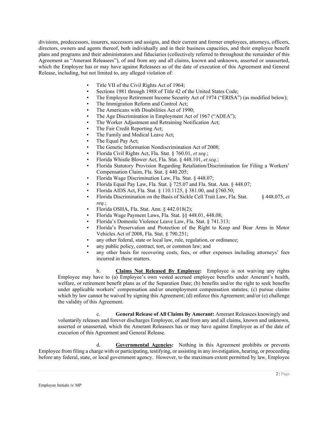 2 | Page Employee Initials /s/ MP divisions, predecessors, insurers, successors and assigns, and their current and former employees, attorneys, officers, directors, owners and agents thereof, both individually and in their business capacities, and their employee benefit plans and programs and their administrators and fiduciaries (collectively referred to throughout the remainder of this Agreement as “Amerant Releasees”), of and from any and all claims, known and unknown, asserted or unasserted, which the Employee has or may have against Releasees as of the date of execution of this Agreement and General Release, including, but not limited to, any alleged violation of: ▪ Title VII of the Civil Rights Act of 1964; ▪ Sections 1981 through 1988 of Title 42 of the United States Code; ▪ The Employee Retirement Income Security Act of 1974 (“ERISA”) (as modified below); ▪ The Immigration Reform and Control Act; ▪ The Americans with Disabilities Act of 1990; ▪ The Age Discrimination in Employment Act of 1967 (“ADEA”); ▪ The Worker Adjustment and Retraining Notification Act; ▪ The Fair Credit Reporting Act; ▪ The Family and Medical Leave Act; ▪ The Equal Pay Act; ▪ The Genetic Information Nondiscrimination Act of 2008; ▪ Florida Civil Rights Act, Fla. Stat. § 760.01, et seq.; ▪ Florida Whistle Blower Act, Fla. Stat. § 448.101, et seq.; ▪ Florida Statutory Provision Regarding Retaliation/Discrimination for Filing a Workers’ Compensation Claim, Fla. Stat. § 440.205; ▪ Florida Wage Discrimination Law, Fla. Stat. § 448.07; ▪ Florida Equal Pay Law, Fla. Stat. § 725.07 and Fla. Stat. Ann. § 448.07; ▪ Florida AIDS Act, Fla. Stat. § 110.1125, § 381.00, and §760.50; ▪ Florida Discrimination on the Basis of Sickle Cell Trait Law, Fla. Stat. § 448.075, et seq.; ▪ Florida OSHA, Fla. Stat. Ann. § 442.018(2); ▪ Florida Wage Payment Laws, Fla. Stat. §§ 448.01, 448.08; ▪ Florida’s Domestic Violence Leave Law, Fla. Stat. § 741.313; ▪ Florida’s Preservation and Protection of the Right to Keep and Bear Arms in Motor Vehicles Act of 2008, Fla. Stat. § 790.251; ▪ any other federal, state or local law, rule, regulation, or ordinance; ▪ any public policy, contract, tort, or common law; and ▪ any other basis for recovering costs, fees, or other expenses including attorneys’ fees incurred in these matters. b. Claims Not Released By Employee: Employee is not waiving any rights Employee may have to (a) Employee’s own vested accrued employee benefits under Amerant’s health, welfare, or retirement benefit plans as of the Separation Date; (b) benefits and/or the right to seek benefits under applicable workers’ compensation and/or unemployment compensation statutes; (c) pursue claims which by law cannot be waived by signing this Agreement; (d) enforce this Agreement; and/or (e) challenge the validity of this Agreement. c. General Release of All Claims By Amerant: Amerant Releasees knowingly and voluntarily releases and forever discharges Employee, of and from any and all claims, known and unknown, asserted or unasserted, which the Amerant Releasees has or may have against Employee as of the date of execution of this Agreement and General Release. d. Governmental Agencies: Nothing in this Agreement prohibits or prevents Employee from filing a charge with or participating, testifying, or assisting in any investigation, hearing, or proceeding before any federal, state, or local government agency. However, to the maximum extent permitted by law, Employee