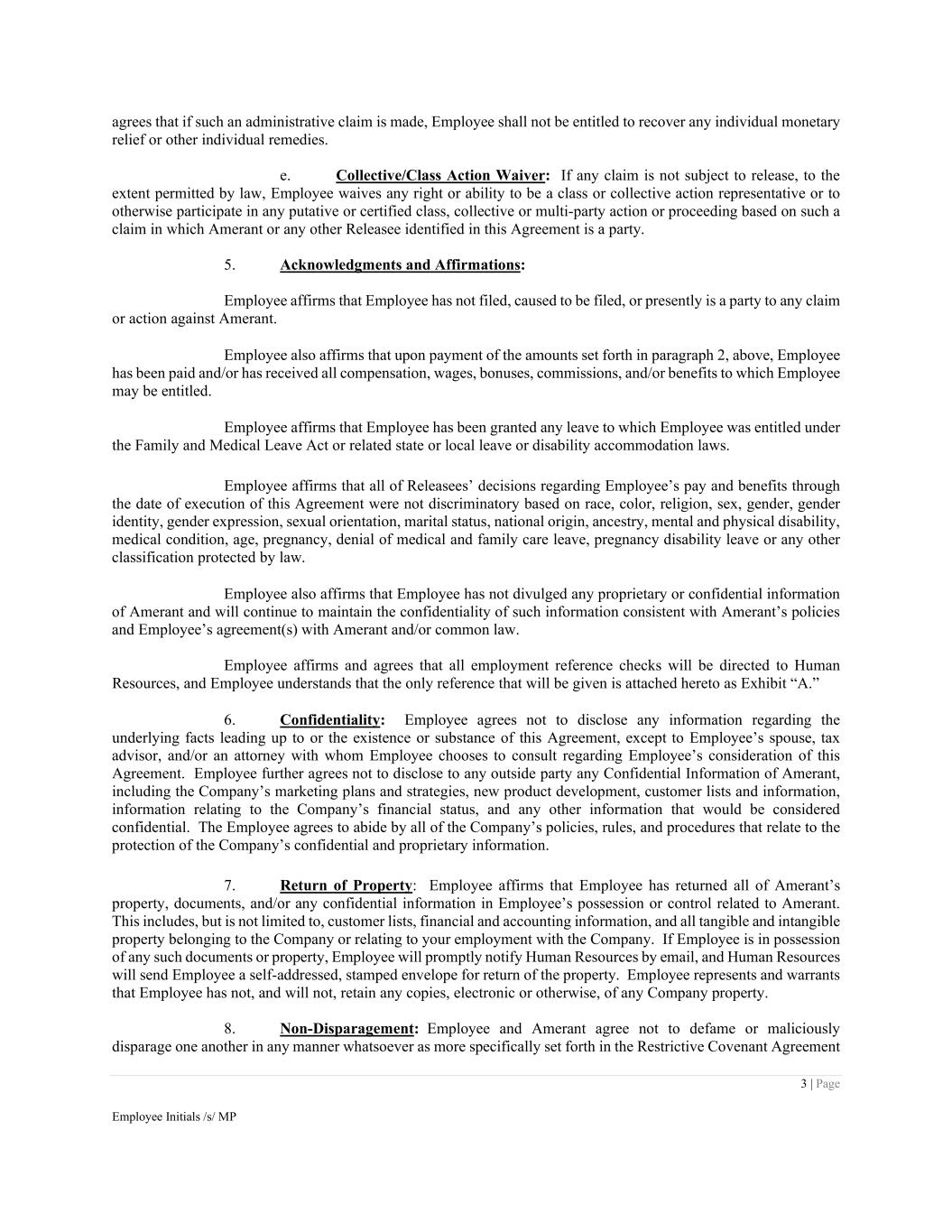 3 | Page Employee Initials /s/ MP agrees that if such an administrative claim is made, Employee shall not be entitled to recover any individual monetary relief or other individual remedies. e. Collective/Class Action Waiver: If any claim is not subject to release, to the extent permitted by law, Employee waives any right or ability to be a class or collective action representative or to otherwise participate in any putative or certified class, collective or multi-party action or proceeding based on such a claim in which Amerant or any other Releasee identified in this Agreement is a party. 5. Acknowledgments and Affirmations: Employee affirms that Employee has not filed, caused to be filed, or presently is a party to any claim or action against Amerant. Employee also affirms that upon payment of the amounts set forth in paragraph 2, above, Employee has been paid and/or has received all compensation, wages, bonuses, commissions, and/or benefits to which Employee may be entitled. Employee affirms that Employee has been granted any leave to which Employee was entitled under the Family and Medical Leave Act or related state or local leave or disability accommodation laws. Employee affirms that all of Releasees’ decisions regarding Employee’s pay and benefits through the date of execution of this Agreement were not discriminatory based on race, color, religion, sex, gender, gender identity, gender expression, sexual orientation, marital status, national origin, ancestry, mental and physical disability, medical condition, age, pregnancy, denial of medical and family care leave, pregnancy disability leave or any other classification protected by law. Employee also affirms that Employee has not divulged any proprietary or confidential information of Amerant and will continue to maintain the confidentiality of such information consistent with Amerant’s policies and Employee’s agreement(s) with Amerant and/or common law. Employee affirms and agrees that all employment reference checks will be directed to Human Resources, and Employee understands that the only reference that will be given is attached hereto as Exhibit “A.” 6. Confidentiality: Employee agrees not to disclose any information regarding the underlying facts leading up to or the existence or substance of this Agreement, except to Employee’s spouse, tax advisor, and/or an attorney with whom Employee chooses to consult regarding Employee’s consideration of this Agreement. Employee further agrees not to disclose to any outside party any Confidential Information of Amerant, including the Company’s marketing plans and strategies, new product development, customer lists and information, information relating to the Company’s financial status, and any other information that would be considered confidential. The Employee agrees to abide by all of the Company’s policies, rules, and procedures that relate to the protection of the Company’s confidential and proprietary information. 7. Return of Property: Employee affirms that Employee has returned all of Amerant’s property, documents, and/or any confidential information in Employee’s possession or control related to Amerant. This includes, but is not limited to, customer lists, financial and accounting information, and all tangible and intangible property belonging to the Company or relating to your employment with the Company. If Employee is in possession of any such documents or property, Employee will promptly notify Human Resources by email, and Human Resources will send Employee a self-addressed, stamped envelope for return of the property. Employee represents and warrants that Employee has not, and will not, retain any copies, electronic or otherwise, of any Company property. 8. Non-Disparagement: Employee and Amerant agree not to defame or maliciously disparage one another in any manner whatsoever as more specifically set forth in the Restrictive Covenant Agreement