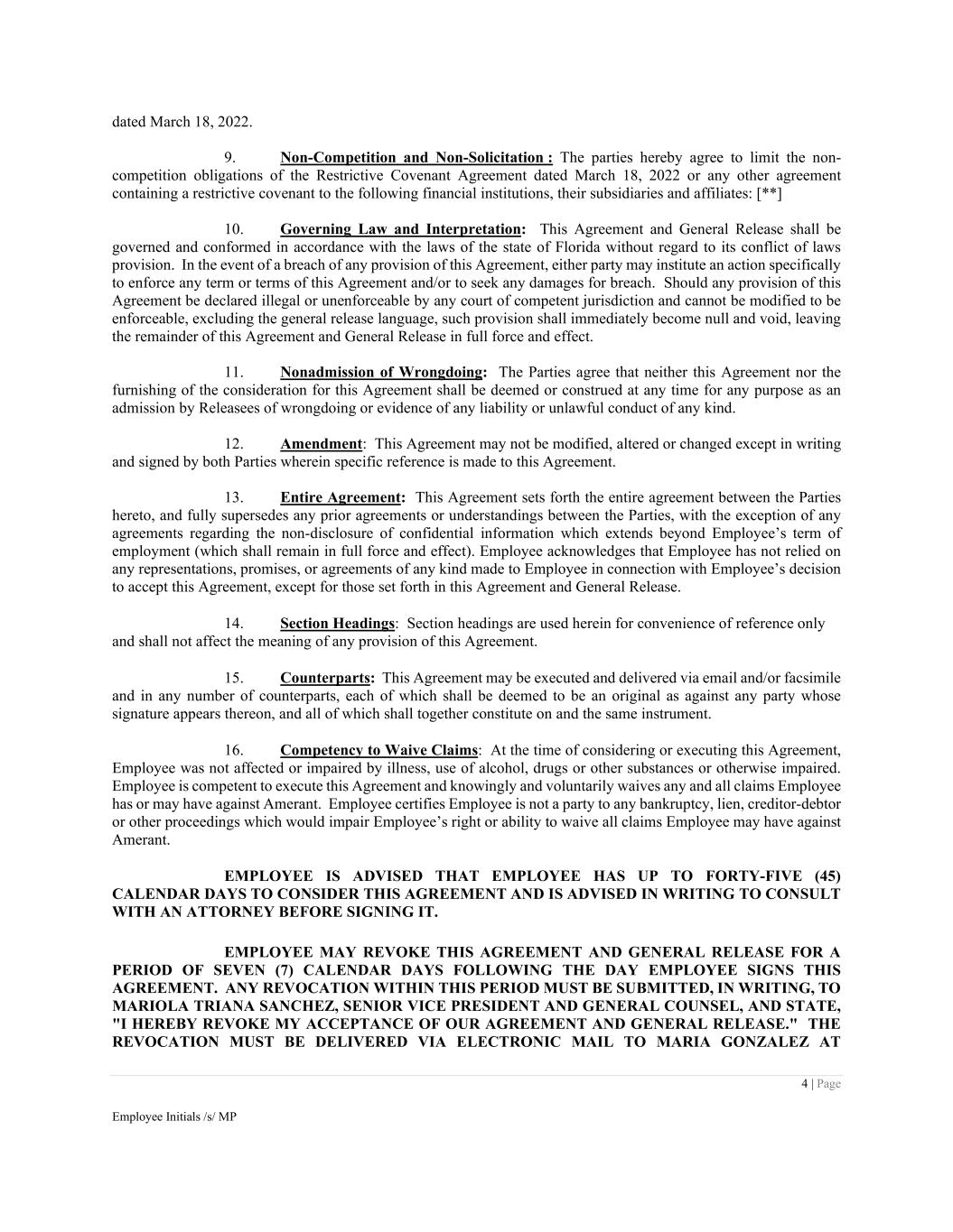4 | Page Employee Initials /s/ MP dated March 18, 2022. 9. Non-Competition and Non-Solicitation : The parties hereby agree to limit the non- competition obligations of the Restrictive Covenant Agreement dated March 18, 2022 or any other agreement containing a restrictive covenant to the following financial institutions, their subsidiaries and affiliates: [**] 10. Governing Law and Interpretation: This Agreement and General Release shall be governed and conformed in accordance with the laws of the state of Florida without regard to its conflict of laws provision. In the event of a breach of any provision of this Agreement, either party may institute an action specifically to enforce any term or terms of this Agreement and/or to seek any damages for breach. Should any provision of this Agreement be declared illegal or unenforceable by any court of competent jurisdiction and cannot be modified to be enforceable, excluding the general release language, such provision shall immediately become null and void, leaving the remainder of this Agreement and General Release in full force and effect. 11. Nonadmission of Wrongdoing: The Parties agree that neither this Agreement nor the furnishing of the consideration for this Agreement shall be deemed or construed at any time for any purpose as an admission by Releasees of wrongdoing or evidence of any liability or unlawful conduct of any kind. 12. Amendment: This Agreement may not be modified, altered or changed except in writing and signed by both Parties wherein specific reference is made to this Agreement. 13. Entire Agreement: This Agreement sets forth the entire agreement between the Parties hereto, and fully supersedes any prior agreements or understandings between the Parties, with the exception of any agreements regarding the non-disclosure of confidential information which extends beyond Employee’s term of employment (which shall remain in full force and effect). Employee acknowledges that Employee has not relied on any representations, promises, or agreements of any kind made to Employee in connection with Employee’s decision to accept this Agreement, except for those set forth in this Agreement and General Release. 14. Section Headings: Section headings are used herein for convenience of reference only and shall not affect the meaning of any provision of this Agreement. 15. Counterparts: This Agreement may be executed and delivered via email and/or facsimile and in any number of counterparts, each of which shall be deemed to be an original as against any party whose signature appears thereon, and all of which shall together constitute on and the same instrument. 16. Competency to Waive Claims: At the time of considering or executing this Agreement, Employee was not affected or impaired by illness, use of alcohol, drugs or other substances or otherwise impaired. Employee is competent to execute this Agreement and knowingly and voluntarily waives any and all claims Employee has or may have against Amerant. Employee certifies Employee is not a party to any bankruptcy, lien, creditor-debtor or other proceedings which would impair Employee’s right or ability to waive all claims Employee may have against Amerant. EMPLOYEE IS ADVISED THAT EMPLOYEE HAS UP TO FORTY-FIVE (45) CALENDAR DAYS TO CONSIDER THIS AGREEMENT AND IS ADVISED IN WRITING TO CONSULT WITH AN ATTORNEY BEFORE SIGNING IT. EMPLOYEE MAY REVOKE THIS AGREEMENT AND GENERAL RELEASE FOR A PERIOD OF SEVEN (7) CALENDAR DAYS FOLLOWING THE DAY EMPLOYEE SIGNS THIS AGREEMENT. ANY REVOCATION WITHIN THIS PERIOD MUST BE SUBMITTED, IN WRITING, TO MARIOLA TRIANA SANCHEZ, SENIOR VICE PRESIDENT AND GENERAL COUNSEL, AND STATE, "I HEREBY REVOKE MY ACCEPTANCE OF OUR AGREEMENT AND GENERAL RELEASE." THE REVOCATION MUST BE DELIVERED VIA ELECTRONIC MAIL TO MARIA GONZALEZ AT
