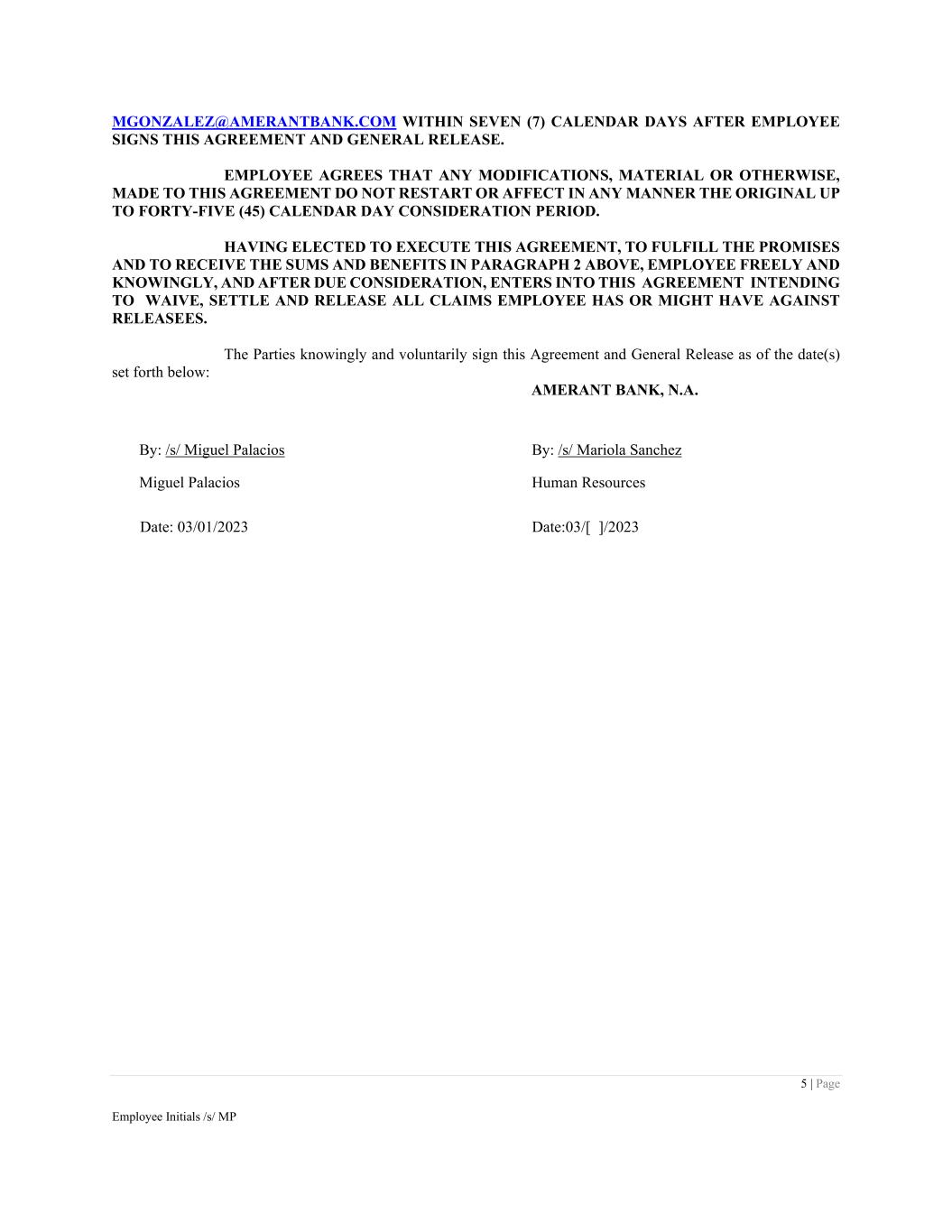5 | Page Employee Initials /s/ MP MGONZALEZ@AMERANTBANK.COM WITHIN SEVEN (7) CALENDAR DAYS AFTER EMPLOYEE SIGNS THIS AGREEMENT AND GENERAL RELEASE. EMPLOYEE AGREES THAT ANY MODIFICATIONS, MATERIAL OR OTHERWISE, MADE TO THIS AGREEMENT DO NOT RESTART OR AFFECT IN ANY MANNER THE ORIGINAL UP TO FORTY-FIVE (45) CALENDAR DAY CONSIDERATION PERIOD. HAVING ELECTED TO EXECUTE THIS AGREEMENT, TO FULFILL THE PROMISES AND TO RECEIVE THE SUMS AND BENEFITS IN PARAGRAPH 2 ABOVE, EMPLOYEE FREELY AND KNOWINGLY, AND AFTER DUE CONSIDERATION, ENTERS INTO THIS AGREEMENT INTENDING TO WAIVE, SETTLE AND RELEASE ALL CLAIMS EMPLOYEE HAS OR MIGHT HAVE AGAINST RELEASEES. The Parties knowingly and voluntarily sign this Agreement and General Release as of the date(s) set forth below: AMERANT BANK, N.A. By: /s/ Miguel Palacios By: /s/ Mariola Sanchez Miguel Palacios Human Resources Date: 03/01/2023 Date:03/[ ]/2023