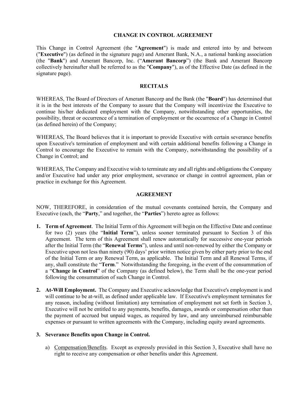 CHANGE IN CONTROL AGREEMENT This Change in Control Agreement (the "Agreement") is made and entered into by and between ("Executive") (as defined in the signature page) and Amerant Bank, N.A., a national banking association (the "Bank") and Amerant Bancorp, Inc. (“Amerant Bancorp”) (the Bank and Amerant Bancorp collectively hereinafter shall be referred to as the "Company"), as of the Effective Date (as defined in the signature page). RECITALS WHEREAS, The Board of Directors of Amerant Bancorp and the Bank (the "Board") has determined that it is in the best interests of the Company to assure that the Company will incentivize the Executive to continue his/her dedicated employment with the Company, notwithstanding other opportunities, the possibility, threat or occurrence of a termination of employment or the occurrence of a Change in Control (as defined herein) of the Company; WHEREAS, The Board believes that it is important to provide Executive with certain severance benefits upon Executive's termination of employment and with certain additional benefits following a Change in Control to encourage the Executive to remain with the Company, notwithstanding the possibility of a Change in Control; and WHEREAS, The Company and Executive wish to terminate any and all rights and obligations the Company and/or Executive had under any prior employment, severance or change in control agreement, plan or practice in exchange for this Agreement. AGREEMENT NOW, THEREFORE, in consideration of the mutual covenants contained herein, the Company and Executive (each, the “Party,” and together, the “Parties”) hereto agree as follows: 1. Term of Agreement. The Initial Term of this Agreement will begin on the Effective Date and continue for two (2) years (the “Initial Term”), unless sooner terminated pursuant to Section 3 of this Agreement. The term of this Agreement shall renew automatically for successive one-year periods after the Initial Term (the “Renewal Terms”), unless and until non-renewed by either the Company or Executive upon not less than ninety (90) days’ prior written notice given by either party prior to the end of the Initial Term or any Renewal Term, as applicable. The Initial Term and all Renewal Terms, if any, shall constitute the “Term.” Notwithstanding the foregoing, in the event of the consummation of a “Change in Control” of the Company (as defined below), the Term shall be the one-year period following the consummation of such Change in Control. 2. At-Will Employment. The Company and Executive acknowledge that Executive's employment is and will continue to be at-will, as defined under applicable law. If Executive's employment terminates for any reason, including (without limitation) any termination of employment not set forth in Section 3, Executive will not be entitled to any payments, benefits, damages, awards or compensation other than the payment of accrued but unpaid wages, as required by law, and any unreimbursed reimbursable expenses or pursuant to written agreements with the Company, including equity award agreements. 3. Severance Benefits upon Change in Control. a) Compensation/Benefits. Except as expressly provided in this Section 3, Executive shall have no right to receive any compensation or other benefits under this Agreement.