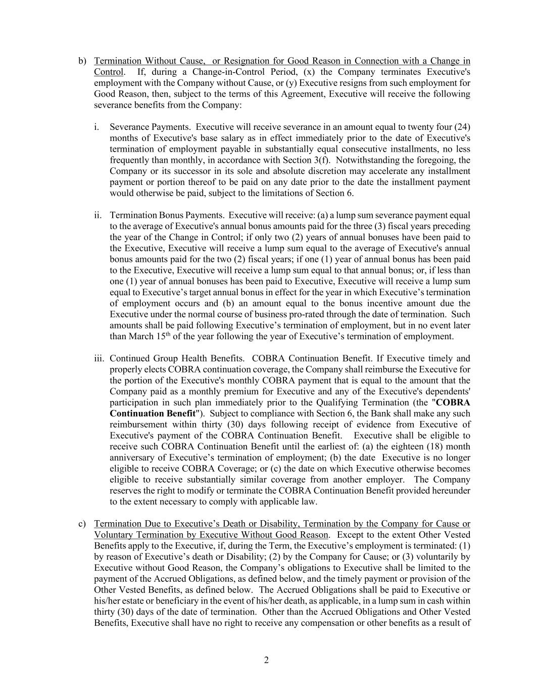 2 b) Termination Without Cause, or Resignation for Good Reason in Connection with a Change in Control. If, during a Change-in-Control Period, (x) the Company terminates Executive's employment with the Company without Cause, or (y) Executive resigns from such employment for Good Reason, then, subject to the terms of this Agreement, Executive will receive the following severance benefits from the Company: i. Severance Payments. Executive will receive severance in an amount equal to twenty four (24) months of Executive's base salary as in effect immediately prior to the date of Executive's termination of employment payable in substantially equal consecutive installments, no less frequently than monthly, in accordance with Section 3(f). Notwithstanding the foregoing, the Company or its successor in its sole and absolute discretion may accelerate any installment payment or portion thereof to be paid on any date prior to the date the installment payment would otherwise be paid, subject to the limitations of Section 6. ii. Termination Bonus Payments. Executive will receive: (a) a lump sum severance payment equal to the average of Executive's annual bonus amounts paid for the three (3) fiscal years preceding the year of the Change in Control; if only two (2) years of annual bonuses have been paid to the Executive, Executive will receive a lump sum equal to the average of Executive's annual bonus amounts paid for the two (2) fiscal years; if one (1) year of annual bonus has been paid to the Executive, Executive will receive a lump sum equal to that annual bonus; or, if less than one (1) year of annual bonuses has been paid to Executive, Executive will receive a lump sum equal to Executive’s target annual bonus in effect for the year in which Executive’s termination of employment occurs and (b) an amount equal to the bonus incentive amount due the Executive under the normal course of business pro-rated through the date of termination. Such amounts shall be paid following Executive’s termination of employment, but in no event later than March 15th of the year following the year of Executive’s termination of employment. iii. Continued Group Health Benefits. COBRA Continuation Benefit. If Executive timely and properly elects COBRA continuation coverage, the Company shall reimburse the Executive for the portion of the Executive's monthly COBRA payment that is equal to the amount that the Company paid as a monthly premium for Executive and any of the Executive's dependents' participation in such plan immediately prior to the Qualifying Termination (the "COBRA Continuation Benefit"). Subject to compliance with Section 6, the Bank shall make any such reimbursement within thirty (30) days following receipt of evidence from Executive of Executive's payment of the COBRA Continuation Benefit. Executive shall be eligible to receive such COBRA Continuation Benefit until the earliest of: (a) the eighteen (18) month anniversary of Executive’s termination of employment; (b) the date Executive is no longer eligible to receive COBRA Coverage; or (c) the date on which Executive otherwise becomes eligible to receive substantially similar coverage from another employer. The Company reserves the right to modify or terminate the COBRA Continuation Benefit provided hereunder to the extent necessary to comply with applicable law. c) Termination Due to Executive’s Death or Disability, Termination by the Company for Cause or Voluntary Termination by Executive Without Good Reason. Except to the extent Other Vested Benefits apply to the Executive, if, during the Term, the Executive’s employment is terminated: (1) by reason of Executive’s death or Disability; (2) by the Company for Cause; or (3) voluntarily by Executive without Good Reason, the Company’s obligations to Executive shall be limited to the payment of the Accrued Obligations, as defined below, and the timely payment or provision of the Other Vested Benefits, as defined below. The Accrued Obligations shall be paid to Executive or his/her estate or beneficiary in the event of his/her death, as applicable, in a lump sum in cash within thirty (30) days of the date of termination. Other than the Accrued Obligations and Other Vested Benefits, Executive shall have no right to receive any compensation or other benefits as a result of