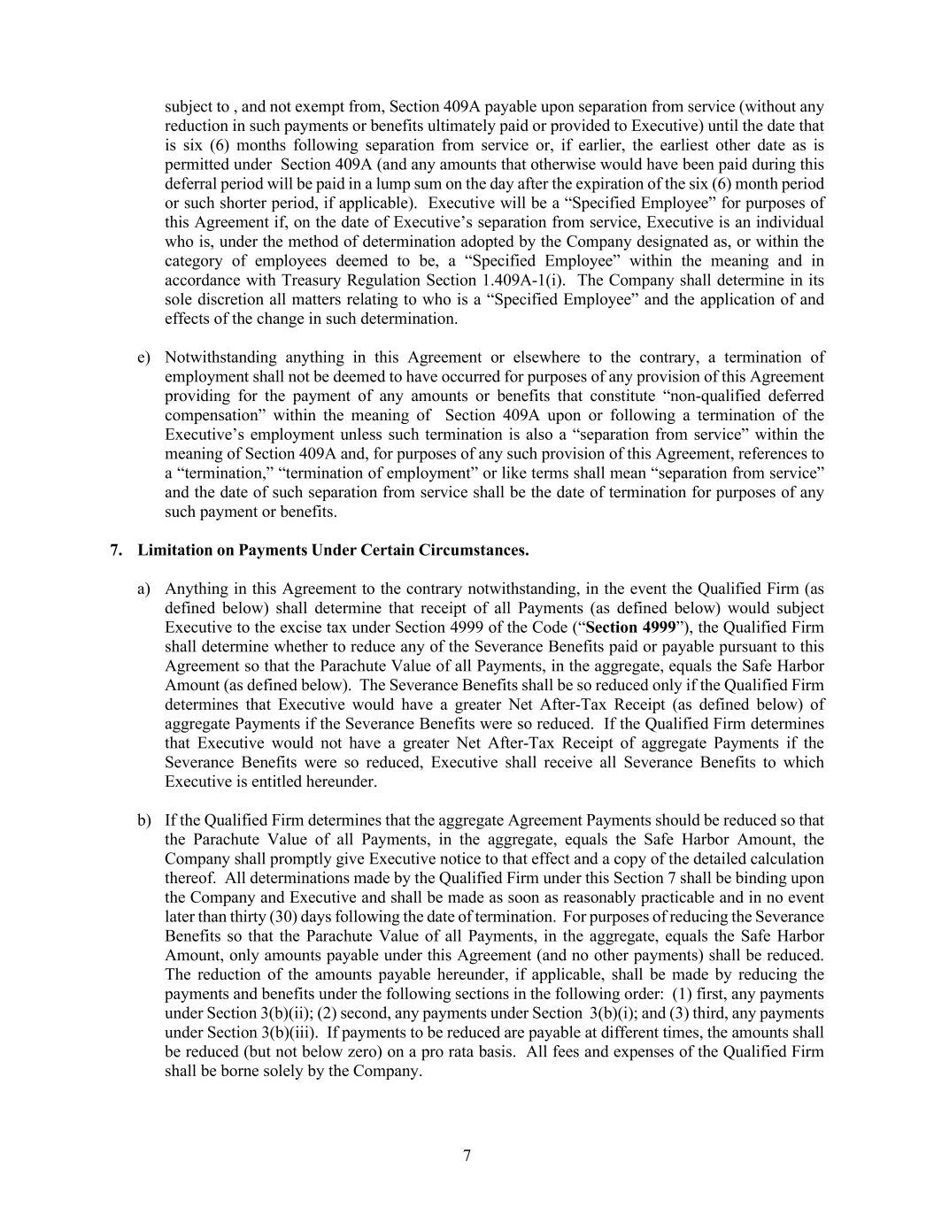 7 subject to , and not exempt from, Section 409A payable upon separation from service (without any reduction in such payments or benefits ultimately paid or provided to Executive) until the date that is six (6) months following separation from service or, if earlier, the earliest other date as is permitted under Section 409A (and any amounts that otherwise would have been paid during this deferral period will be paid in a lump sum on the day after the expiration of the six (6) month period or such shorter period, if applicable). Executive will be a “Specified Employee” for purposes of this Agreement if, on the date of Executive’s separation from service, Executive is an individual who is, under the method of determination adopted by the Company designated as, or within the category of employees deemed to be, a “Specified Employee” within the meaning and in accordance with Treasury Regulation Section 1.409A-1(i). The Company shall determine in its sole discretion all matters relating to who is a “Specified Employee” and the application of and effects of the change in such determination. e) Notwithstanding anything in this Agreement or elsewhere to the contrary, a termination of employment shall not be deemed to have occurred for purposes of any provision of this Agreement providing for the payment of any amounts or benefits that constitute “non-qualified deferred compensation” within the meaning of Section 409A upon or following a termination of the Executive’s employment unless such termination is also a “separation from service” within the meaning of Section 409A and, for purposes of any such provision of this Agreement, references to a “termination,” “termination of employment” or like terms shall mean “separation from service” and the date of such separation from service shall be the date of termination for purposes of any such payment or benefits. 7. Limitation on Payments Under Certain Circumstances. a) Anything in this Agreement to the contrary notwithstanding, in the event the Qualified Firm (as defined below) shall determine that receipt of all Payments (as defined below) would subject Executive to the excise tax under Section 4999 of the Code (“Section 4999”), the Qualified Firm shall determine whether to reduce any of the Severance Benefits paid or payable pursuant to this Agreement so that the Parachute Value of all Payments, in the aggregate, equals the Safe Harbor Amount (as defined below). The Severance Benefits shall be so reduced only if the Qualified Firm determines that Executive would have a greater Net After-Tax Receipt (as defined below) of aggregate Payments if the Severance Benefits were so reduced. If the Qualified Firm determines that Executive would not have a greater Net After-Tax Receipt of aggregate Payments if the Severance Benefits were so reduced, Executive shall receive all Severance Benefits to which Executive is entitled hereunder. b) If the Qualified Firm determines that the aggregate Agreement Payments should be reduced so that the Parachute Value of all Payments, in the aggregate, equals the Safe Harbor Amount, the Company shall promptly give Executive notice to that effect and a copy of the detailed calculation thereof. All determinations made by the Qualified Firm under this Section 7 shall be binding upon the Company and Executive and shall be made as soon as reasonably practicable and in no event later than thirty (30) days following the date of termination. For purposes of reducing the Severance Benefits so that the Parachute Value of all Payments, in the aggregate, equals the Safe Harbor Amount, only amounts payable under this Agreement (and no other payments) shall be reduced. The reduction of the amounts payable hereunder, if applicable, shall be made by reducing the payments and benefits under the following sections in the following order: (1) first, any payments under Section 3(b)(ii); (2) second, any payments under Section 3(b)(i); and (3) third, any payments under Section 3(b)(iii). If payments to be reduced are payable at different times, the amounts shall be reduced (but not below zero) on a pro rata basis. All fees and expenses of the Qualified Firm shall be borne solely by the Company.