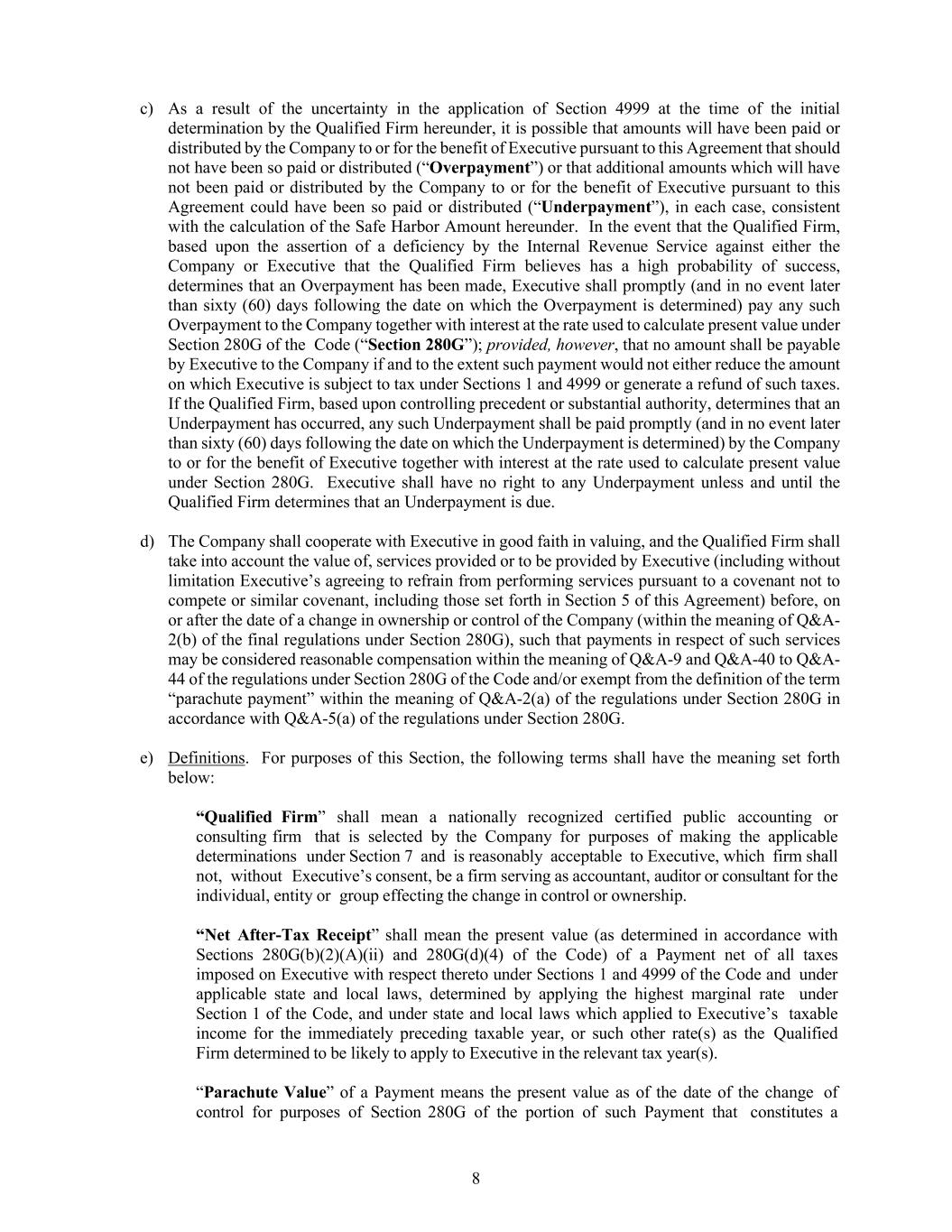 8 c) As a result of the uncertainty in the application of Section 4999 at the time of the initial determination by the Qualified Firm hereunder, it is possible that amounts will have been paid or distributed by the Company to or for the benefit of Executive pursuant to this Agreement that should not have been so paid or distributed (“Overpayment”) or that additional amounts which will have not been paid or distributed by the Company to or for the benefit of Executive pursuant to this Agreement could have been so paid or distributed (“Underpayment”), in each case, consistent with the calculation of the Safe Harbor Amount hereunder. In the event that the Qualified Firm, based upon the assertion of a deficiency by the Internal Revenue Service against either the Company or Executive that the Qualified Firm believes has a high probability of success, determines that an Overpayment has been made, Executive shall promptly (and in no event later than sixty (60) days following the date on which the Overpayment is determined) pay any such Overpayment to the Company together with interest at the rate used to calculate present value under Section 280G of the Code (“Section 280G”); provided, however, that no amount shall be payable by Executive to the Company if and to the extent such payment would not either reduce the amount on which Executive is subject to tax under Sections 1 and 4999 or generate a refund of such taxes. If the Qualified Firm, based upon controlling precedent or substantial authority, determines that an Underpayment has occurred, any such Underpayment shall be paid promptly (and in no event later than sixty (60) days following the date on which the Underpayment is determined) by the Company to or for the benefit of Executive together with interest at the rate used to calculate present value under Section 280G. Executive shall have no right to any Underpayment unless and until the Qualified Firm determines that an Underpayment is due. d) The Company shall cooperate with Executive in good faith in valuing, and the Qualified Firm shall take into account the value of, services provided or to be provided by Executive (including without limitation Executive’s agreeing to refrain from performing services pursuant to a covenant not to compete or similar covenant, including those set forth in Section 5 of this Agreement) before, on or after the date of a change in ownership or control of the Company (within the meaning of Q&A- 2(b) of the final regulations under Section 280G), such that payments in respect of such services may be considered reasonable compensation within the meaning of Q&A-9 and Q&A-40 to Q&A- 44 of the regulations under Section 280G of the Code and/or exempt from the definition of the term “parachute payment” within the meaning of Q&A-2(a) of the regulations under Section 280G in accordance with Q&A-5(a) of the regulations under Section 280G. e) Definitions. For purposes of this Section, the following terms shall have the meaning set forth below: “Qualified Firm” shall mean a nationally recognized certified public accounting or consulting firm that is selected by the Company for purposes of making the applicable determinations under Section 7 and is reasonably acceptable to Executive, which firm shall not, without Executive’s consent, be a firm serving as accountant, auditor or consultant for the individual, entity or group effecting the change in control or ownership. “Net After-Tax Receipt” shall mean the present value (as determined in accordance with Sections 280G(b)(2)(A)(ii) and 280G(d)(4) of the Code) of a Payment net of all taxes imposed on Executive with respect thereto under Sections 1 and 4999 of the Code and under applicable state and local laws, determined by applying the highest marginal rate under Section 1 of the Code, and under state and local laws which applied to Executive’s taxable income for the immediately preceding taxable year, or such other rate(s) as the Qualified Firm determined to be likely to apply to Executive in the relevant tax year(s). “Parachute Value” of a Payment means the present value as of the date of the change of control for purposes of Section 280G of the portion of such Payment that constitutes a