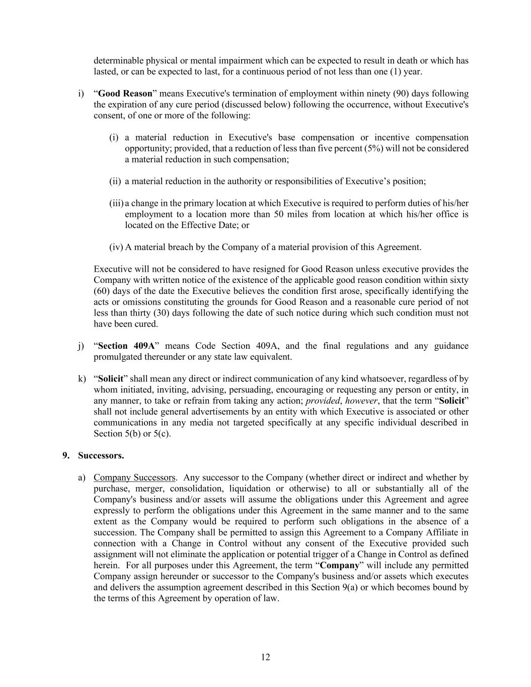 12 determinable physical or mental impairment which can be expected to result in death or which has lasted, or can be expected to last, for a continuous period of not less than one (1) year. i) “Good Reason” means Executive's termination of employment within ninety (90) days following the expiration of any cure period (discussed below) following the occurrence, without Executive's consent, of one or more of the following: (i) a material reduction in Executive's base compensation or incentive compensation opportunity; provided, that a reduction of less than five percent (5%) will not be considered a material reduction in such compensation; (ii) a material reduction in the authority or responsibilities of Executive’s position; (iii) a change in the primary location at which Executive is required to perform duties of his/her employment to a location more than 50 miles from location at which his/her office is located on the Effective Date; or (iv) A material breach by the Company of a material provision of this Agreement. Executive will not be considered to have resigned for Good Reason unless executive provides the Company with written notice of the existence of the applicable good reason condition within sixty (60) days of the date the Executive believes the condition first arose, specifically identifying the acts or omissions constituting the grounds for Good Reason and a reasonable cure period of not less than thirty (30) days following the date of such notice during which such condition must not have been cured. j) “Section 409A” means Code Section 409A, and the final regulations and any guidance promulgated thereunder or any state law equivalent. k) “Solicit” shall mean any direct or indirect communication of any kind whatsoever, regardless of by whom initiated, inviting, advising, persuading, encouraging or requesting any person or entity, in any manner, to take or refrain from taking any action; provided, however, that the term “Solicit” shall not include general advertisements by an entity with which Executive is associated or other communications in any media not targeted specifically at any specific individual described in Section 5(b) or 5(c). 9. Successors. a) Company Successors. Any successor to the Company (whether direct or indirect and whether by purchase, merger, consolidation, liquidation or otherwise) to all or substantially all of the Company's business and/or assets will assume the obligations under this Agreement and agree expressly to perform the obligations under this Agreement in the same manner and to the same extent as the Company would be required to perform such obligations in the absence of a succession. The Company shall be permitted to assign this Agreement to a Company Affiliate in connection with a Change in Control without any consent of the Executive provided such assignment will not eliminate the application or potential trigger of a Change in Control as defined herein. For all purposes under this Agreement, the term “Company” will include any permitted Company assign hereunder or successor to the Company's business and/or assets which executes and delivers the assumption agreement described in this Section 9(a) or which becomes bound by the terms of this Agreement by operation of law.