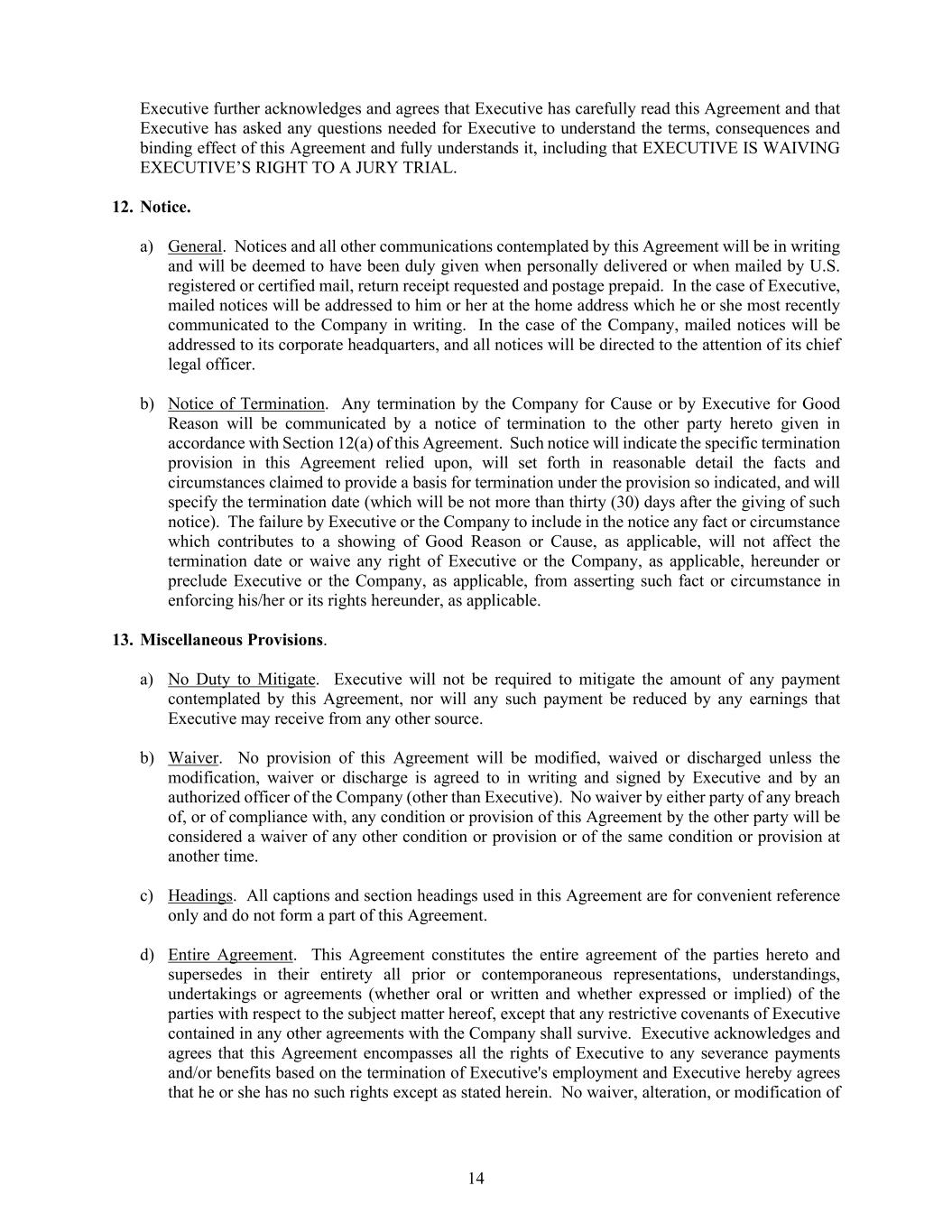 14 Executive further acknowledges and agrees that Executive has carefully read this Agreement and that Executive has asked any questions needed for Executive to understand the terms, consequences and binding effect of this Agreement and fully understands it, including that EXECUTIVE IS WAIVING EXECUTIVE’S RIGHT TO A JURY TRIAL. 12. Notice. a) General. Notices and all other communications contemplated by this Agreement will be in writing and will be deemed to have been duly given when personally delivered or when mailed by U.S. registered or certified mail, return receipt requested and postage prepaid. In the case of Executive, mailed notices will be addressed to him or her at the home address which he or she most recently communicated to the Company in writing. In the case of the Company, mailed notices will be addressed to its corporate headquarters, and all notices will be directed to the attention of its chief legal officer. b) Notice of Termination. Any termination by the Company for Cause or by Executive for Good Reason will be communicated by a notice of termination to the other party hereto given in accordance with Section 12(a) of this Agreement. Such notice will indicate the specific termination provision in this Agreement relied upon, will set forth in reasonable detail the facts and circumstances claimed to provide a basis for termination under the provision so indicated, and will specify the termination date (which will be not more than thirty (30) days after the giving of such notice). The failure by Executive or the Company to include in the notice any fact or circumstance which contributes to a showing of Good Reason or Cause, as applicable, will not affect the termination date or waive any right of Executive or the Company, as applicable, hereunder or preclude Executive or the Company, as applicable, from asserting such fact or circumstance in enforcing his/her or its rights hereunder, as applicable. 13. Miscellaneous Provisions. a) No Duty to Mitigate. Executive will not be required to mitigate the amount of any payment contemplated by this Agreement, nor will any such payment be reduced by any earnings that Executive may receive from any other source. b) Waiver. No provision of this Agreement will be modified, waived or discharged unless the modification, waiver or discharge is agreed to in writing and signed by Executive and by an authorized officer of the Company (other than Executive). No waiver by either party of any breach of, or of compliance with, any condition or provision of this Agreement by the other party will be considered a waiver of any other condition or provision or of the same condition or provision at another time. c) Headings. All captions and section headings used in this Agreement are for convenient reference only and do not form a part of this Agreement. d) Entire Agreement. This Agreement constitutes the entire agreement of the parties hereto and supersedes in their entirety all prior or contemporaneous representations, understandings, undertakings or agreements (whether oral or written and whether expressed or implied) of the parties with respect to the subject matter hereof, except that any restrictive covenants of Executive contained in any other agreements with the Company shall survive. Executive acknowledges and agrees that this Agreement encompasses all the rights of Executive to any severance payments and/or benefits based on the termination of Executive's employment and Executive hereby agrees that he or she has no such rights except as stated herein. No waiver, alteration, or modification of
