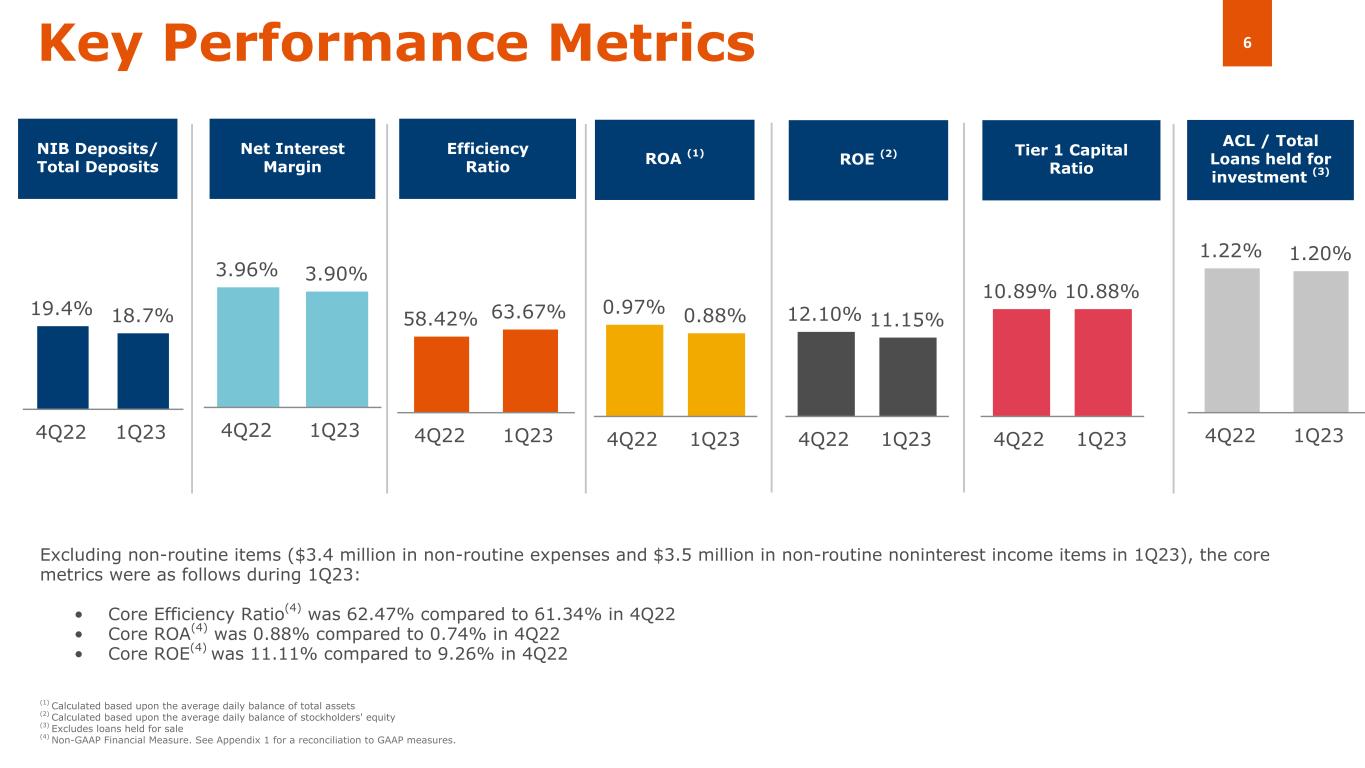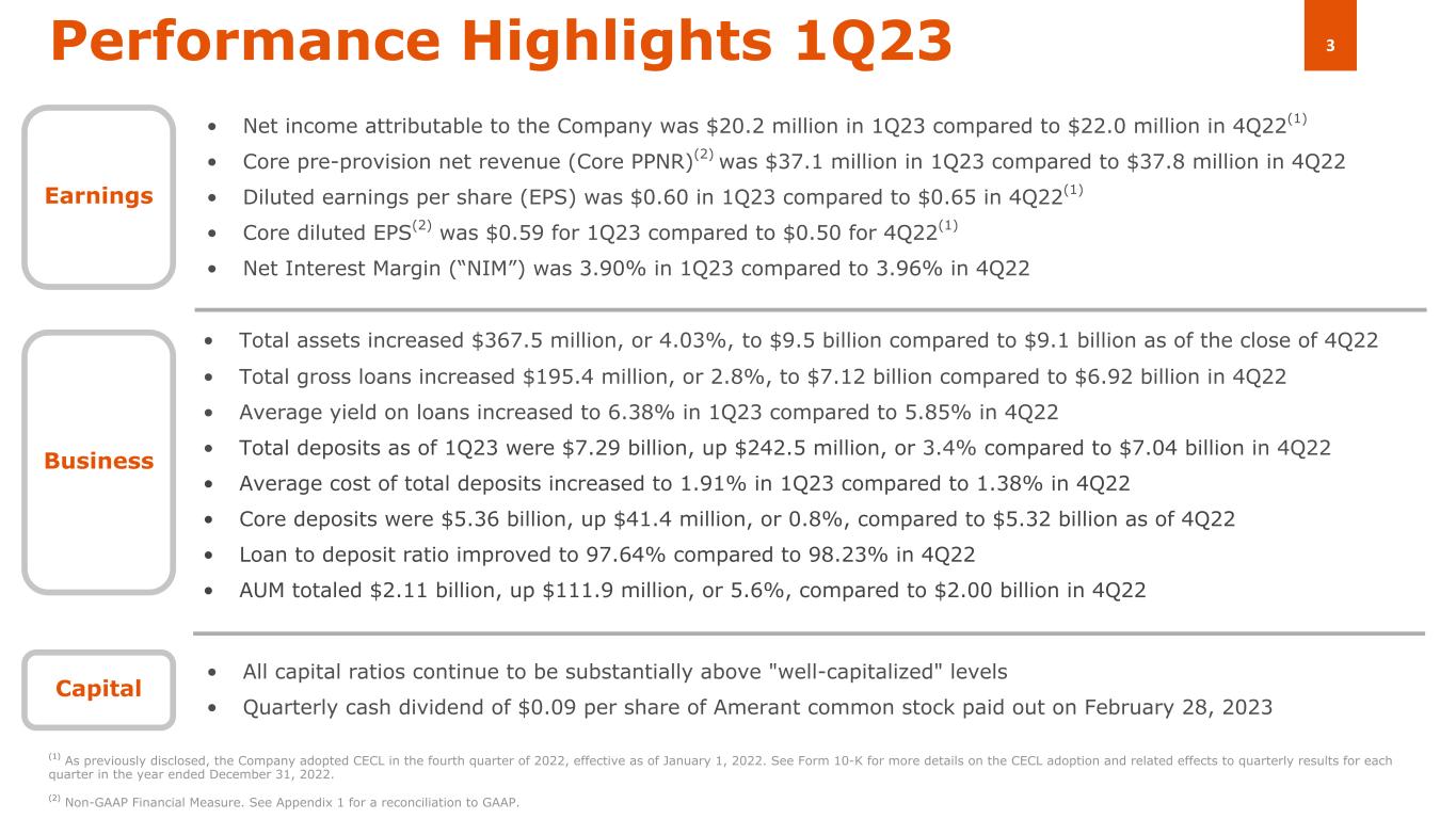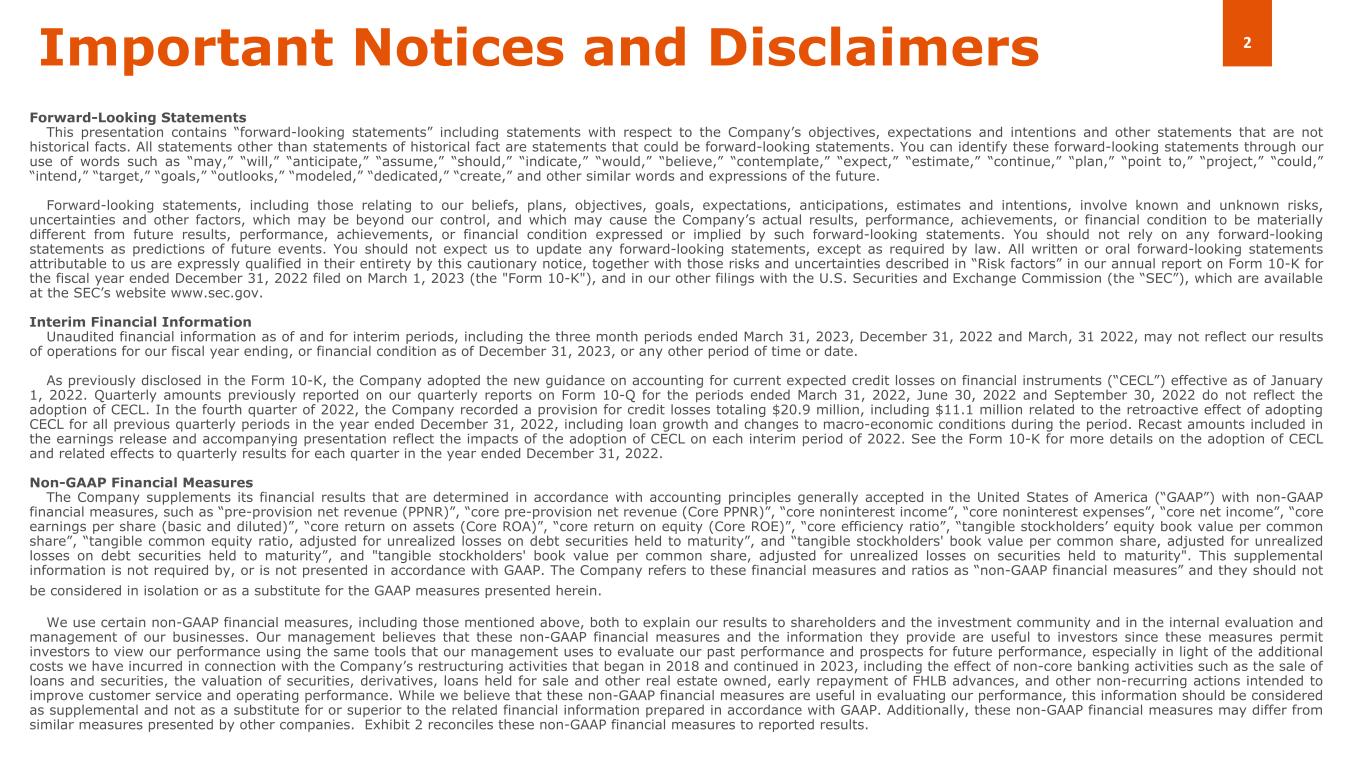 2 Forward-Looking Statements This presentation contains “forward-looking statements” including statements with respect to the Company’s objectives, expectations and intentions and other statements that are not historical facts. All statements other than statements of historical fact are statements that could be forward-looking statements. You can identify these forward-looking statements through our use of words such as “may,” “will,” “anticipate,” “assume,” “should,” “indicate,” “would,” “believe,” “contemplate,” “expect,” “estimate,” “continue,” “plan,” “point to,” “project,” “could,” “intend,” “target,” “goals,” “outlooks,” “modeled,” “dedicated,” “create,” and other similar words and expressions of the future. Forward-looking statements, including those relating to our beliefs, plans, objectives, goals, expectations, anticipations, estimates and intentions, involve known and unknown risks, uncertainties and other factors, which may be beyond our control, and which may cause the Company’s actual results, performance, achievements, or financial condition to be materially different from future results, performance, achievements, or financial condition expressed or implied by such forward-looking statements. You should not rely on any forward-looking statements as predictions of future events. You should not expect us to update any forward-looking statements, except as required by law. All written or oral forward-looking statements attributable to us are expressly qualified in their entirety by this cautionary notice, together with those risks and uncertainties described in “Risk factors” in our annual report on Form 10-K for the fiscal year ended December 31, 2022 filed on March 1, 2023 (the "Form 10-K"), and in our other filings with the U.S. Securities and Exchange Commission (the “SEC”), which are available at the SEC’s website www.sec.gov. Interim Financial Information Unaudited financial information as of and for interim periods, including the three month periods ended March 31, 2023, December 31, 2022 and March, 31 2022, may not reflect our results of operations for our fiscal year ending, or financial condition as of December 31, 2023, or any other period of time or date. As previously disclosed in the Form 10-K, the Company adopted the new guidance on accounting for current expected credit losses on financial instruments (“CECL”) effective as of January 1, 2022. Quarterly amounts previously reported on our quarterly reports on Form 10-Q for the periods ended March 31, 2022, June 30, 2022 and September 30, 2022 do not reflect the adoption of CECL. In the fourth quarter of 2022, the Company recorded a provision for credit losses totaling $20.9 million, including $11.1 million related to the retroactive effect of adopting CECL for all previous quarterly periods in the year ended December 31, 2022, including loan growth and changes to macro-economic conditions during the period. Recast amounts included in the earnings release and accompanying presentation reflect the impacts of the adoption of CECL on each interim period of 2022. See the Form 10-K for more details on the adoption of CECL and related effects to quarterly results for each quarter in the year ended December 31, 2022. Non-GAAP Financial Measures The Company supplements its financial results that are determined in accordance with accounting principles generally accepted in the United States of America (“GAAP”) with non-GAAP financial measures, such as “pre-provision net revenue (PPNR)”, “core pre-provision net revenue (Core PPNR)”, “core noninterest income”, “core noninterest expenses”, “core net income”, “core earnings per share (basic and diluted)”, “core return on assets (Core ROA)”, “core return on equity (Core ROE)”, “core efficiency ratio”, “tangible stockholders’ equity book value per common share”, “tangible common equity ratio, adjusted for unrealized losses on debt securities held to maturity”, and “tangible stockholders' book value per common share, adjusted for unrealized losses on debt securities held to maturity”, and "tangible stockholders' book value per common share, adjusted for unrealized losses on securities held to maturity". This supplemental information is not required by, or is not presented in accordance with GAAP. The Company refers to these financial measures and ratios as “non-GAAP financial measures” and they should not be considered in isolation or as a substitute for the GAAP measures presented herein. We use certain non-GAAP financial measures, including those mentioned above, both to explain our results to shareholders and the investment community and in the internal evaluation and management of our businesses. Our management believes that these non-GAAP financial measures and the information they provide are useful to investors since these measures permit investors to view our performance using the same tools that our management uses to evaluate our past performance and prospects for future performance, especially in light of the additional costs we have incurred in connection with the Company’s restructuring activities that began in 2018 and continued in 2023, including the effect of non-core banking activities such as the sale of loans and securities, the valuation of securities, derivatives, loans held for sale and other real estate owned, early repayment of FHLB advances, and other non-recurring actions intended to improve customer service and operating performance. While we believe that these non-GAAP financial measures are useful in evaluating our performance, this information should be considered as supplemental and not as a substitute for or superior to the related financial information prepared in accordance with GAAP. Additionally, these non-GAAP financial measures may differ from similar measures presented