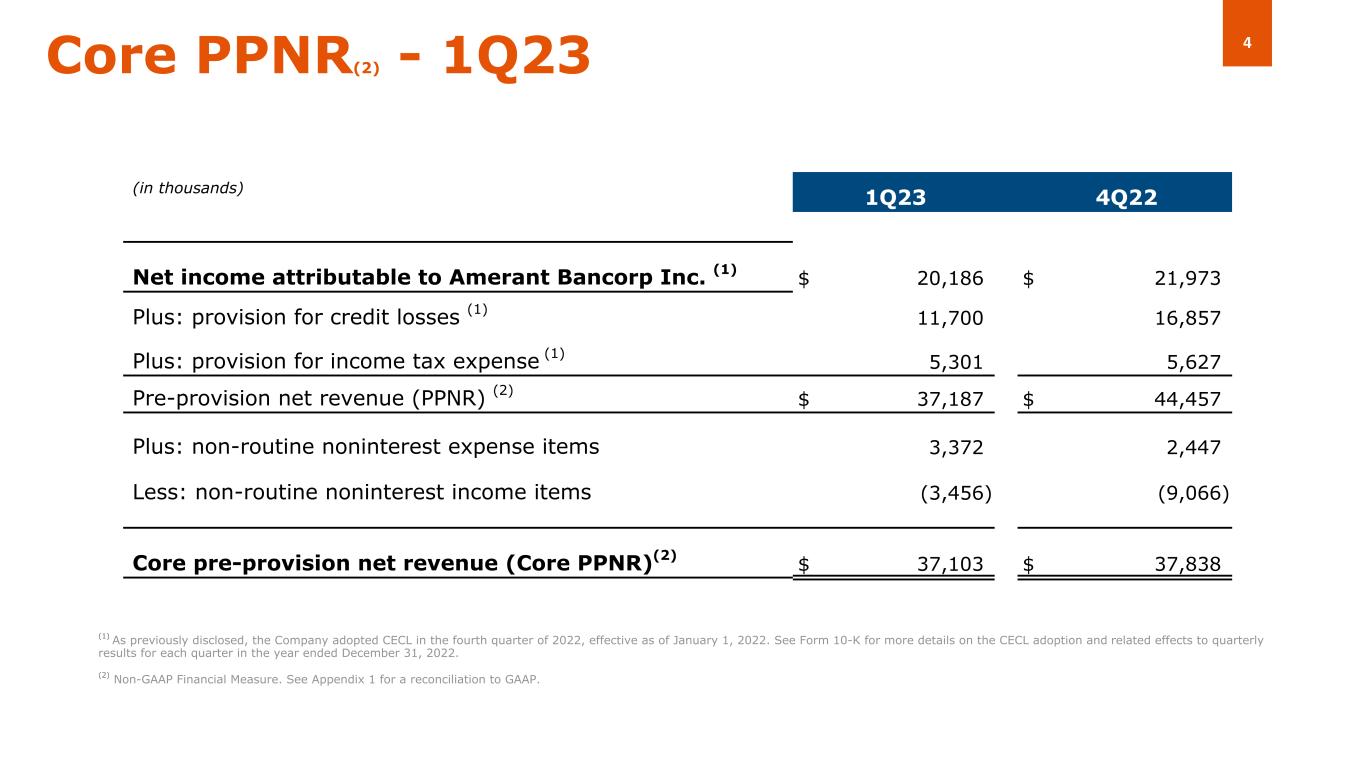 3Performance Highlights 1Q23 Business • Net income attributable to the Company was $20.2 million in 1Q23 compared to $22.0 million in 4Q22(1) • Core pre-provision net revenue (Core PPNR)(2) was $37.1 million in 1Q23 compared to $37.8 million in 4Q22 • Diluted earnings per share (EPS) was $0.60 in 1Q23 compared to $0.65 in 4Q22(1) • Core diluted EPS(2) was $0.59 for 1Q23 compared to $0.50 for 4Q22(1) • Net Interest Margin (“NIM”) was 3.90% in 1Q23 compared to 3.96% in 4Q22 • Total assets increased $367.5 million, or 4.03%, to $9.5 billion compared to $9.1 billion as of the close of 4Q22 • Total gross loans increased $195.4 million, or 2.8%, to $7.12 billion compared to $6.92 billion in 4Q22 • Average yield on loans increased to 6.38% in 1Q23 compared to 5.85% in 4Q22 • Total deposits as of 1Q23 were $7.29 billion, up $242.5 million, or 3.4% compared to $7.04 billion in 4Q22 • Average cost of total deposits increased to 1.91% in 1Q23 compared to 1.38% in 4Q22 • Core deposits were $5.36 billion, up $41.4 million, or 0.8%, compared to $5.32 billion as of 4Q22 • Loan to deposit ratio improved to 97.64% compared to 98.23% in 4Q22 • AUM totaled $2.11 billion, up $111.9 million, or 5.6%, compared to $2.00 billion in 4Q22 Earnings Capital • All capital ratios continue to be substantially above "well-capitalized" levels • Quarterly cash dividend of $0.09 per share of Amerant common stock paid out on February 28, 2023 (1) As previously disclosed, the Company adopted CECL in the fourth quarter of 2022, effective as of January 1, 2022. See Form 10-K for more details on the CECL adoption and related effects to quarterly results for each quarter in the year ended December 31, 2022. (2) Non-GAAP Financial Measure. See Appendix 1 for a reconciliation to GAAP.