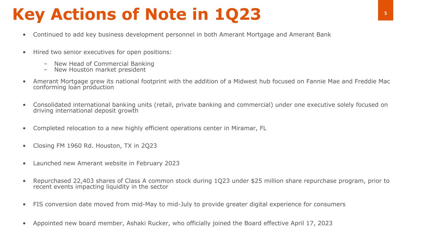 4Core PPNR(2) - 1Q23 (1) As previously disclosed, the Company adopted CECL in the fourth quarter of 2022, effective as of January 1, 2022. See Form 10-K for more details on the CECL adoption and related effects to quarterly results for each quarter in the year ended December 31, 2022. (2) Non-GAAP Financial Measure. See Appendix 1 for a reconciliation to GAAP. (in 1Q23 4Q22 Net income attributable to Amerant Bancorp Inc. (1) $ 20,186 $ 21,973 Plus: provision for credit losses (1) 11,700 16,857 Plus: provision for income tax expense (1) 5,301 5,627 Pre-provision net revenue (PPNR) (2) $ 37,187 $ 44,457 Plus: non-routine noninterest expense items 3,372 2,447 Less: non-routine noninterest income items (3,456) (9,066) Core pre-provision net revenue (Core PPNR)(2) $ 37,103 $ 37,838 (in thousands)