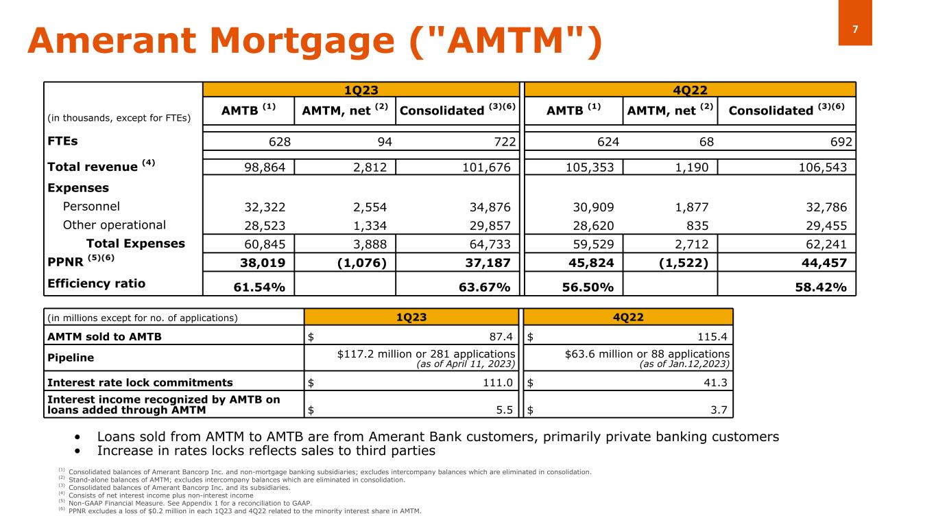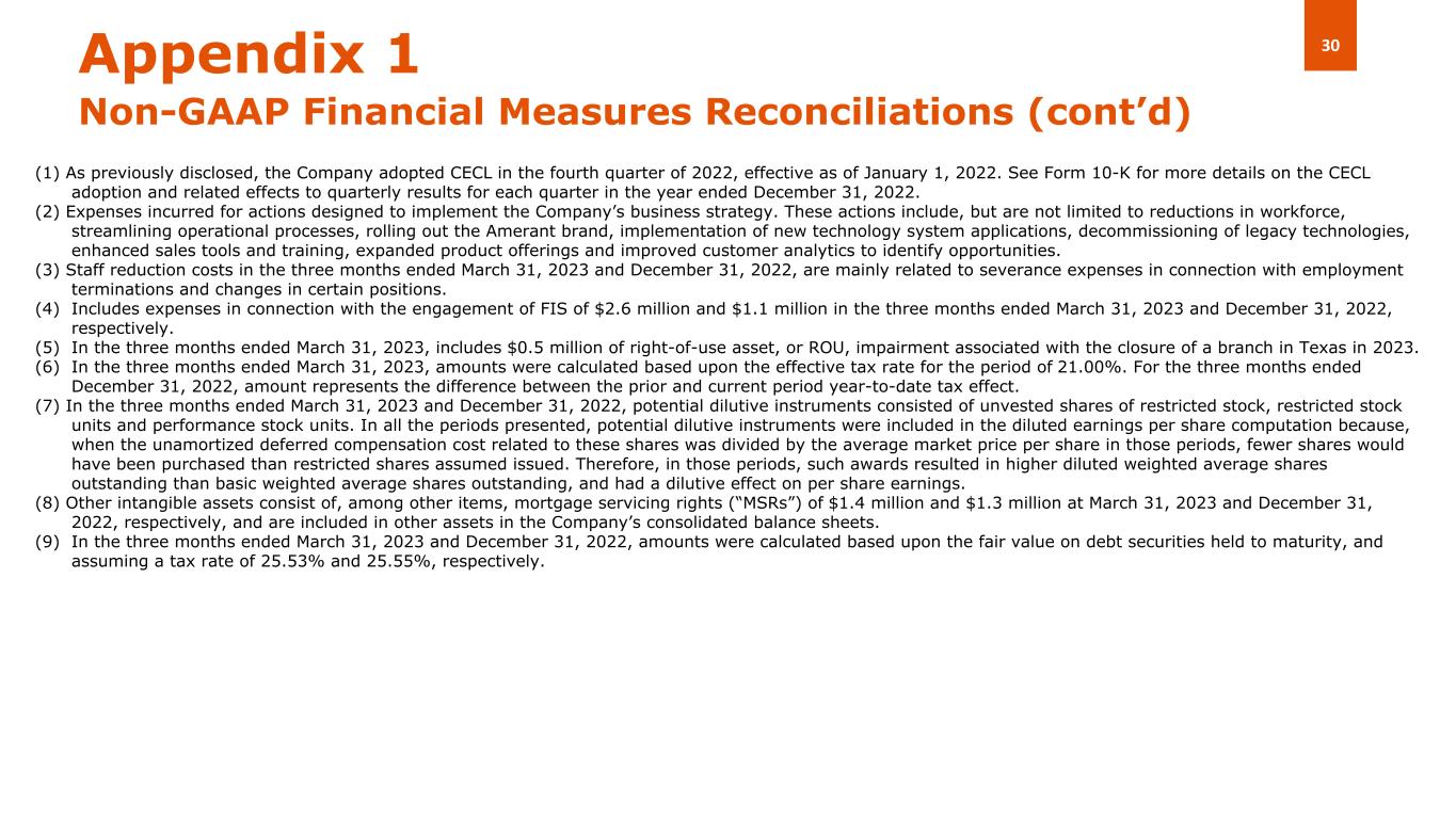 30Appendix 1 Non-GAAP Financial Measures Reconciliations (cont’d) (1) As previously disclosed, the Company adopted CECL in the fourth quarter of 2022, effective as of January 1, 2022. See Form 10-K for more details on the CECL adoption and related effects to quarterly results for each quarter in the year ended December 31, 2022. (2) Expenses incurred for actions designed to implement the Company’s business strategy. These actions include, but are not limited to reductions in workforce, streamlining operational processes, rolling out the Amerant brand, implementation of new technology system applications, decommissioning of legacy technologies, enhanced sales tools and training, expanded product offerings and improved customer analytics to identify opportunities. (3) Staff reduction costs in the three months ended March 31, 2023 and December 31, 2022, are mainly related to severance expenses in connection with employment terminations and changes in certain positions. (4) Includes expenses in connection with the engagement of FIS of $2.6 million and $1.1 million in the three months ended March 31, 2023 and December 31, 2022, respectively. (5) In the three months ended March 31, 2023, includes $0.5 million of right-of-use asset, or ROU, impairment associated with the closure of a branch in Texas in 2023. (6) In the three months ended March 31, 2023, amounts were calculated based upon the effective tax rate for the period of 21.00%. For the three months ended December 31, 2022, amount represents the difference between the prior and current period year-to-date tax effect. (7) In the three months ended March 31, 2023 and December 31, 2022, potential dilutive instruments consisted of unvested shares of restricted stock, restricted stock units and performance stock units. In all the periods presented, potential dilutive instruments were included in the diluted earnings per share computation because, when the unamortized deferred compensation cost related to these shares was divided by the average market price per share in those periods, fewer shares would have been purchased than restricted shares assumed issued. Therefore, in those periods, such awards resulted in higher diluted weighted average shares outstanding than basic weighted average shares outstanding, and had a dilutive effect on per share earnings. (8) Other intangible assets consist of, among other items, mortgage servicing rights (“MSRs”) of $1.4 million and $1.3 million at March 31, 2023 and December 31, 2022, respectively, and are included in other assets in the Company’s consolidated balance sheets. (9) In the three months ended March 31, 2023 and December 31, 2022, amounts were calculated based upon the fair value on debt securities held to maturity, and assuming a tax rate of 25.53% and 25.55%, respectively.