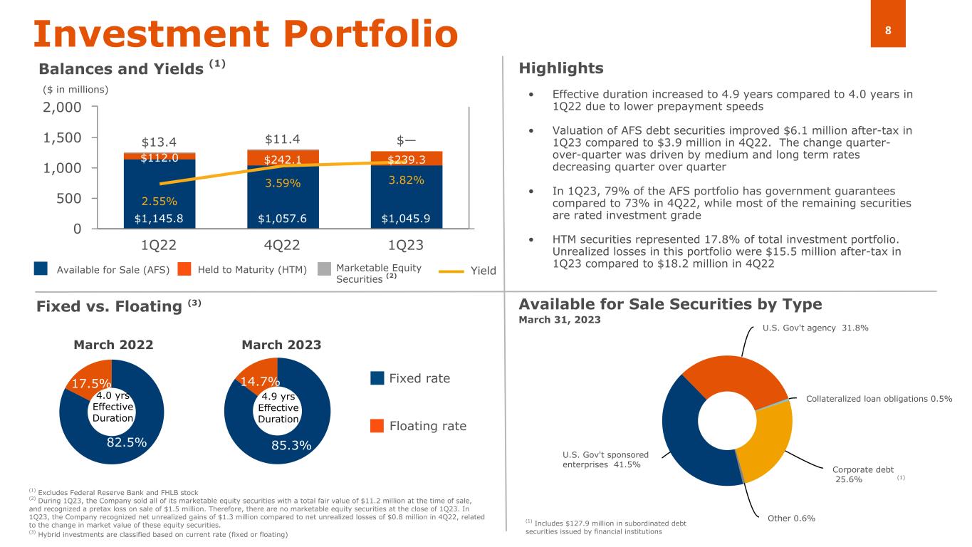 7Amerant Mortgage ("AMTM") 1Q23 4Q22 (in thousands, except for FTEs) AMTB (1) AMTM, net (2) Consolidated (3)(6) AMTB (1) AMTM, net (2) Consolidated (3)(6) FTEs 628 94 722 624 68 692 Total revenue (4) 98,864 2,812 101,676 105,353 1,190 106,543 Expenses Personnel 32,322 2,554 34,876 30,909 1,877 32,786 Other operational 28,523 1,334 29,857 28,620 835 29,455 Total Expenses 60,845 3,888 64,733 59,529 2,712 62,241 PPNR (5)(6) 38,019 (1,076) 37,187 45,824 (1,522) 44,457 Efficiency ratio 61.54 % 63.67 % 56.50 % 58.42 % (1) Consolidated balances of Amerant Bancorp Inc. and non-mortgage banking subsidiaries; excludes intercompany balances which are eliminated in consolidation. (2) Stand-alone balances of AMTM; excludes intercompany balances which are eliminated in consolidation. (3) Consolidated balances of Amerant Bancorp Inc. and its subsidiaries. (4) Consists of net interest income plus non-interest income (5) Non-GAAP Financial Measure. See Appendix 1 for a reconciliation to GAAP. (6) PPNR excludes a loss of $0.2 million in each 1Q23 and 4Q22 related to the minority interest share in AMTM. (in millions except for no. of applications) 1Q23 4Q22 AMTM sold to AMTB $ 87.4 $ 115.4 Pipeline $117.2 million or 281 applications (as of April 11, 2023) $63.6 million or 88 applications (as of Jan.12,2023) Interest rate lock commitments $ 111.0 $ 41.3 Interest income recognized by AMTB on loans added through AMTM $ 5.5 $ 3.7 • Loans sold from AMTM to AMTB are from Amerant Bank customers, primarily private banking customers • Increase in rates locks reflects sales to third parties