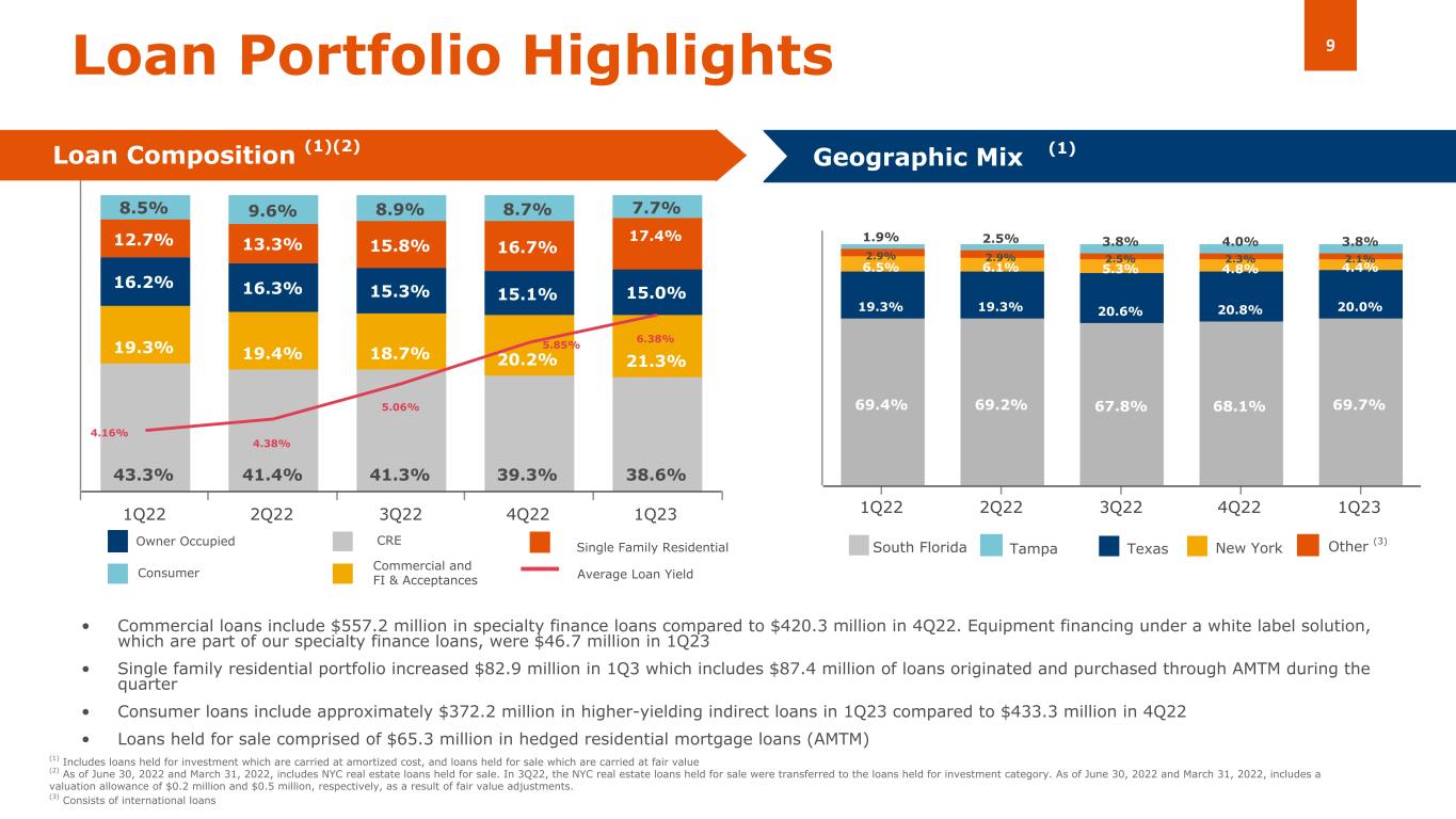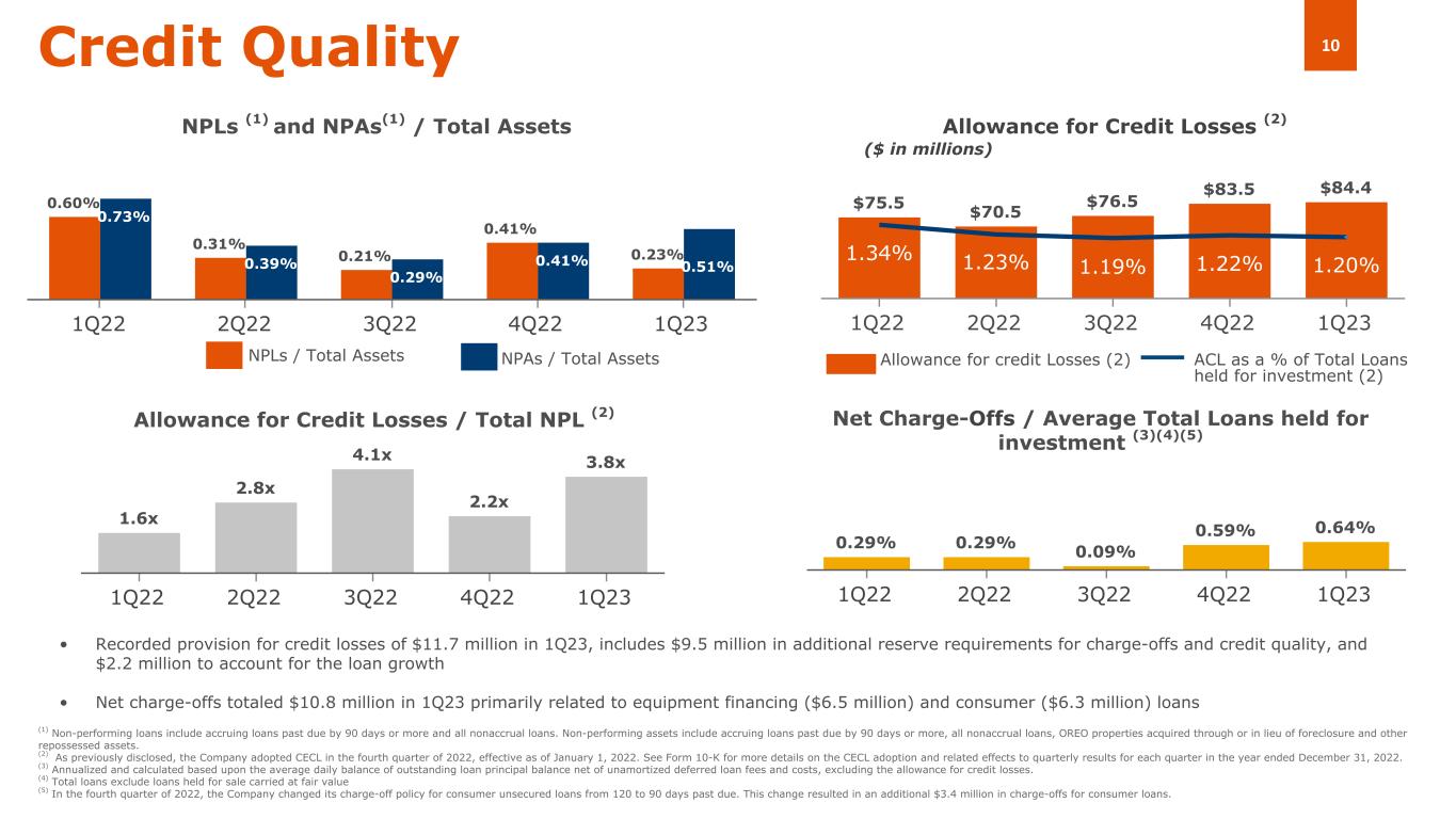 9 43.3% 41.4% 41.3% 39.3% 38.6% 19.3% 19.4% 18.7% 20.2% 21.3% 16.2% 16.3% 15.3% 15.1% 15.0% 12.7% 13.3% 15.8% 16.7% 17.4% 8.5% 9.6% 8.9% 8.7% 7.7% 4.16% 4.38% 5.06% 5.85% 6.38% 1Q22 2Q22 3Q22 4Q22 1Q23 69.4% 69.2% 67.8% 68.1% 69.7% 19.3% 19.3% 20.6% 20.8% 20.0% 6.5% 6.1% 5.3% 4.8% 4.4% 2.9% 2.9% 2.5% 2.3% 2.1% 1.9% 2.5% 3.8% 4.0% 3.8% 1Q22 2Q22 3Q22 4Q22 1Q23 Consumer CRE Commercial and FI & Acceptances Owner Occupied Single Family Residential Loan Portfolio Highlights Loan Composition (1)(2) Geographic Mix (Domestic) • Commercial loans include $557.2 million in specialty finance loans compared to $420.3 million in 4Q22. Equipment financing under a white label solution, which are part of our specialty finance loans, were $46.7 million in 1Q23 • Single family residential portfolio increased $82.9 million in 1Q3 which includes $87.4 million of loans originated and purchased through AMTM during the quarter • Consumer loans include approximately $372.2 million in higher-yielding indirect loans in 1Q23 compared to $433.3 million in 4Q22 • Loans held for sale comprised of $65.3 million in hedged residential mortgage loans (AMTM) (1) South Florida Texas New York Average Loan Yield Other (3) (1) Includes loans held for investment which are carried at amortized cost, and loans held for sale which are carried at fair value (2) As of June 30, 2022 and March 31, 2022, includes NYC real estate loans held for sale. In 3Q22, the NYC real estate loans held for sale were transferred to the loans held for investment category. As of June 30, 2022 and March 31, 2022, includes a valuation allowance of $0.2 million and $0.5 million, respectively, as a result of fair value adjustments. (3) Consists of international loans Tampa