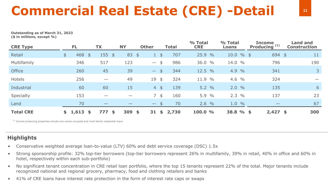 10 0.60% 0.31% 0.21% 0.41% 0.23% 0.73% 0.39% 0.29% 0.41% 0.51% 1Q22 2Q22 3Q22 4Q22 1Q23 1.6x 2.8x 4.1x 2.2x 3.8x 1Q22 2Q22 3Q22 4Q22 1Q23 $75.5 $70.5 $76.5 $83.5 $84.4 1.34% 1.23% 1.19% 1.22% 1.20% 1Q22 2Q22 3Q22 4Q22 1Q23 0.29% 0.29% 0.09% 0.59% 0.64% 1Q22 2Q22 3Q22 4Q22 1Q23 • Recorded provision for credit losses of $11.7 million in 1Q23, includes $9.5 million in additional reserve requirements for charge-offs and credit quality, and $2.2 million to account for the loan growth • Net charge-offs totaled $10.8 million in 1Q23 primarily related to equipment financing ($6.5 million) and consumer ($6.3 million) loans Net Charge-Offs / Average Total Loans held for investment (3)(4)(5) Credit Quality Allowance for Credit Losses (2) ($ in millions) NPLs (1) and NPAs(1) / Total Assets Allowance for Credit Losses / Total NPL (2) Allowance for credit Losses (2) ACL as a % of Total Loans held for investment (2) (1) Non-performing loans include accruing loans past due by 90 days or more and all nonaccrual loans. Non-performing assets include accruing loans past due by 90 days or more, all nonaccrual loans, OREO properties acquired through or in lieu of foreclosure and other repossessed assets. (2) As previously disclosed, the Company adopted CECL in the fourth quarter of 2022, effective as of January 1, 2022. See Form 10-K for more details on the CECL adoption and related effects to quarterly results for each quarter in the year ended December 31, 2022. (3) Annualized and calculated based upon the average daily balance of outstanding loan principal balance net of unamortized deferred loan fees and costs, excluding the allowance for credit losses. (4) Total loans exclude loans held for sale carried at fair value (5) In the fourth quarter of 2022, the Company changed its charge-off policy for consumer unsecured loans from 120 to 90 days past due. This change resulted in an additional $3.4 million in charge-offs for consumer loans. NPLs / Total Assets NPAs / Total Assets