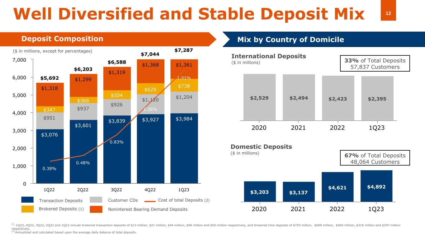 12 $5,692 $6,203 $6,588 $7,044 $7,287 $3,076 $3,601 $3,839 $3,927 $3,984$951 $937 $926 $1,120 $1,204 $347 $366 $504 $629 $738$1,318 $1,299 $1,319 $1,368 $1,361 0.38% 0.48% 0.83% 1.38% 1.91% 1Q22 2Q22 3Q22 4Q22 1Q23 0 1,000 2,000 3,000 4,000 5,000 6,000 7,000 $2,529 $2,494 $2,423 $2,395 2020 2021 2022 1Q23 $3,203 $3,137 $4,621 $4,892 2020 2021 2022 1Q23 Domestic Deposits ($ in millions) Well Diversified and Stable Deposit Mix Deposit Composition International Deposits ($ in millions) Mix by Country of Domicile Transaction Deposits Customer CDs Brokered Deposits (1) Cost of total Deposits (2) ($ in millions, except for percentages) (1) 1Q23, 4Q22, 3Q22, 2Q22 and 1Q22 include brokered transaction deposits of $13 million, $21 million, $44 million, $48 million and $50 million respectively, and brokered time deposits of $725 million, $609 million, $460 million, $318 million and $297 million respectively. (2) Annualized and calculated based upon the average daily balance of total deposits. Noninterest Bearing Demand Deposits 33% of Total Deposits 57,837 Customers 67% of Total Deposits 48,064 Customers
