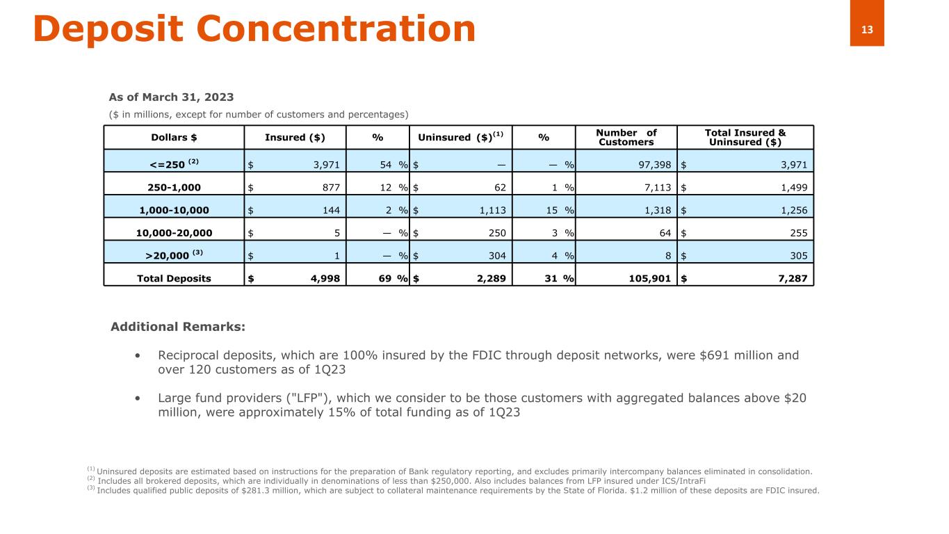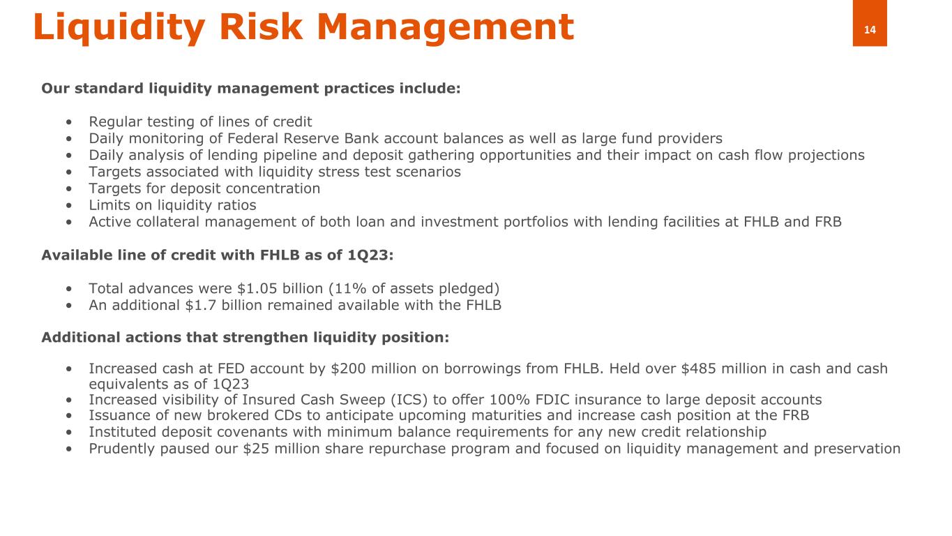 13Deposit Concentration Dollars $ Insured ($) % Uninsured ($)(1) % Number of Customers Total Insured & Uninsured ($) <=250 (2) $ 3,971 54 % $ — — % 97,398 $ 3,971 250-1,000 $ 877 12 % $ 62 1 % 7,113 $ 1,499 1,000-10,000 $ 144 2 % $ 1,113 15 % 1,318 $ 1,256 10,000-20,000 $ 5 — % $ 250 3 % 64 $ 255 >20,000 (3) $ 1 — % $ 304 4 % 8 $ 305 Total Deposits $ 4,998 69 % $ 2,289 31 % 105,901 $ 7,287 As of March 31, 2023 (1) Uninsured deposits are estimated based on instructions for the preparation of Bank regulatory reporting, and excludes primarily intercompany balances eliminated in consolidation. (2) Includes all brokered deposits, which are individually in denominations of less than $250,000. Also includes balances from LFP insured under ICS/IntraFi (3) Includes qualified public deposits of $281.3 million, which are subject to collateral maintenance requirements by the State of Florida. $1.2 million of these deposits are FDIC insured. Additional Remarks: • Reciprocal deposits, which are 100% insured by the FDIC through deposit networks, were $691 million and over 120 customers as of 1Q23 • Large fund providers ("LFP"), which we consider to be those customers with aggregated balances above $20 million, were approximately 15% of total funding as of 1Q23 ($ in millions, except for number of customers and percentages)