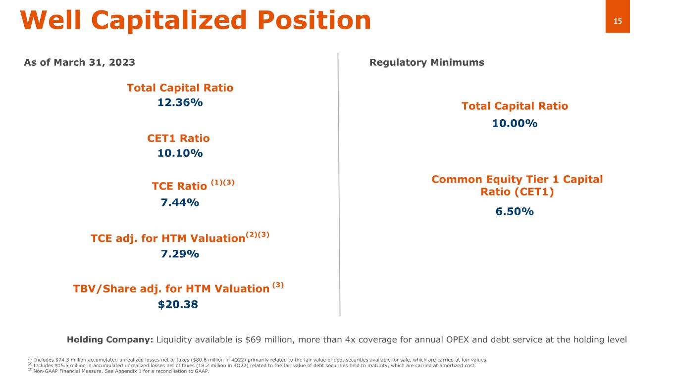 14Liquidity Risk Management Our standard liquidity management practices include: • Regular testing of lines of credit • Daily monitoring of Federal Reserve Bank account balances as well as large fund providers • Daily analysis of lending pipeline and deposit gathering opportunities and their impact on cash flow projections • Targets associated with liquidity stress test scenarios • Targets for deposit concentration • Limits on liquidity ratios • Active collateral management of both loan and investment portfolios with lending facilities at FHLB and FRB Available line of credit with FHLB as of 1Q23: • Total advances were $1.05 billion (11% of assets pledged) • An additional $1.7 billion remained available with the FHLB Additional actions that strengthen liquidity position: • Increased cash at FED account by $200 million on borrowings from FHLB. Held over $485 million in cash and cash equivalents as of 1Q23 • Increased visibility of Insured Cash Sweep (ICS) to offer 100% FDIC insurance to large deposit accounts • Issuance of new brokered CDs to anticipate upcoming maturities and increase cash position at the FRB • Instituted deposit covenants with minimum balance requirements for any new credit relationship • Prudently paused our $25 million share repurchase program and focused on liquidity management and preservation