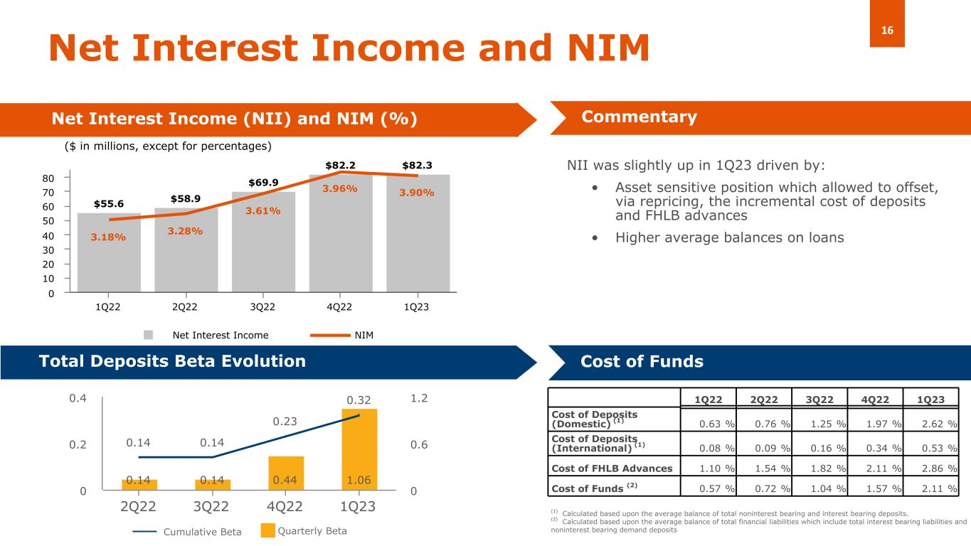 15Well Capitalized Position Holding Company: Liquidity available is $69 million, more than 4x coverage for annual OPEX and debt service at the holding level (1) Includes $74.3 million accumulated unrealized losses net of taxes ($80.6 million in 4Q22) primarily related to the fair value of debt securities available for sale, which are carried at fair values. (2) Includes $15.5 million in accumulated unrealized losses net of taxes (18.2 million in 4Q22) related to the fair value of debt securities held to maturity, which are carried at amortized cost. (3) Non-GAAP Financial Measure. See Appendix 1 for a reconciliation to GAAP. As of March 31, 2023 Total Capital Ratio 12.36% TCE Ratio (1)(3) TCE adj. for HTM Valuation(2)(3) TBV/Share adj. for HTM Valuation (3) CET1 Ratio 7.44% 10.10% 7.29% $20.38 Regulatory Minimums Total Capital Ratio 10.00% Common Equity Tier 1 Capital Ratio (CET1) 6.50%
