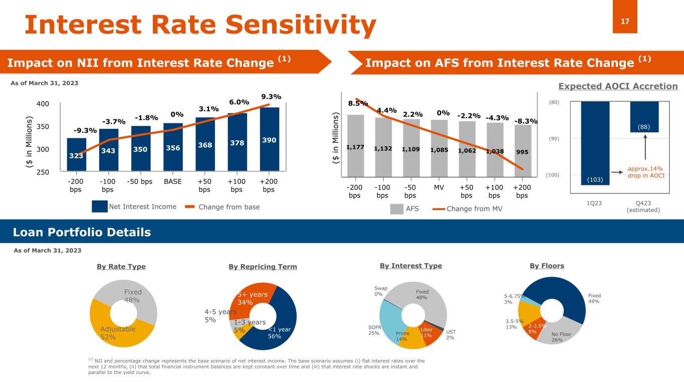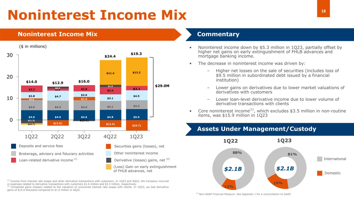 17 323 343 350 356 368 378 390 -200 bps -100 bps -50 bps BASE +50 bps +100 bps +200 bps 250 300 350 400 As of March 31, 2023 Fixed 48% Adjustable 52% Interest Rate Sensitivity By Interest TypeBy Rate Type By Repricing Term (1) NII and percentage change represents the base scenario of net interest income. The base scenario assumes (i) flat interest rates over the next 12 months, (ii) that total financial instrument balances are kept constant over time and (iii) that interest rate shocks are instant and parallel to the yield curve. Loan Portfolio Details Impact on NII from Interest Rate Change (1) AFSChange from base <1 year 56% 1-3 years 5% 4-5 years 5% 5+ years 34% ($ in M ill io ns ) As of March 31, 2023 Swap 0% Fixed 48% UST 2% Libor 11%Prime 14% SOFR 25% Impact on AFS from Interest Rate Change (1) -9.3% -3.7% 0% 6.0% 3.1% -1.8% 9.3% Fixed 49% No Floor 26% 2-3.5% 9% 3.5-5% 13% 5-6.75% 3% By Floors 1,177 1,132 1,109 1,085 1,062 1,038 995 -200 bps -100 bps -50 bps MV +50 bps +100 bps +200 bps ($ in M ill io ns ) 8.5% 4.4% 2.2% 0% -2.2% -4.3% -8.3% Expected AOCI Accretion Change from MVNet Interest Income (103) (88) 1Q23 Q423 (estimated) (100) (90) (80) approx.14% drop in AOCI