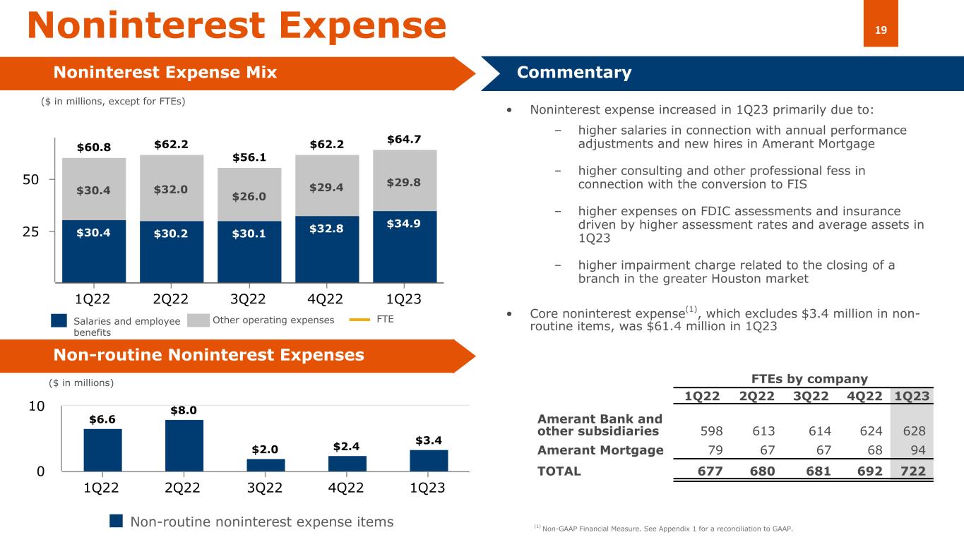 18 $14.0 $12.9 $16.0 $24.4 $19.3 $4.6 $4.6 $4.6 $4.8 $5.0 $4.6 $4.3 $4.6 $4.1 $4.2 $0.8 $(2.6) $1.5 $(3.4) $(9.7) $2.8 $4.7 $2.6 $3.1 $4.5 $3.2 $1.0 $2.8 $3.4 $2.1 $(1.3) $0.9 $(0.1) $1.0 $(0.7) $11.4 $13.2 1Q22 2Q22 3Q22 4Q22 1Q23 0 10 20 30 12% 88% 19% 81% Noninterest Income Mix Noninterest Income Mix Commentary Assets Under Management/Custody Deposits and service fees Brokerage, advisory and fiduciary activities Other noninterest income $2.1B Domestic International 1Q231Q22 $2.1B ($ in millions) Securities gains (losses), net (1) Income from interest rate swaps and other derivative transactions with customers. In 1Q23 and 4Q22, the Company incurred in expenses related to derivative transactions with customers $1.6 million and $3.3 million, respectively. (2) Unrealized gains (losses) related to the valuation of uncovered interest rate swaps with clients. In 1Q23, we had derivative gains of $14.0 thousand compared to $1.0 million in 4Q22. Loan-related derivative income (1) Derivative (losses) gains, net (2) $62.4 (Loss) Gain on early extinguishment of FHLB advances, net $29.0M • Noninterest income down by $5.3 million in 1Q23, partially offset by higher net gains on early extinguishment of FHLB advances and mortgage banking income. • The decrease in noninterest income was driven by: – Higher net losses on the sale of securities (includes loss of $9.5 million in subordinated debt issued by a financial institution) – Lower gains on derivatives due to lower market valuations of derivatives with customers – Lower loan-level derivative income due to lower volume of derivative transactions with clients • Core noninterest income(1), which excludes $3.5 million in non-routine items, was $15.9 million in 1Q23 (1) Non-GAAP Financial Measure. See Appendix 1 for a reconciliation to GAAP.
