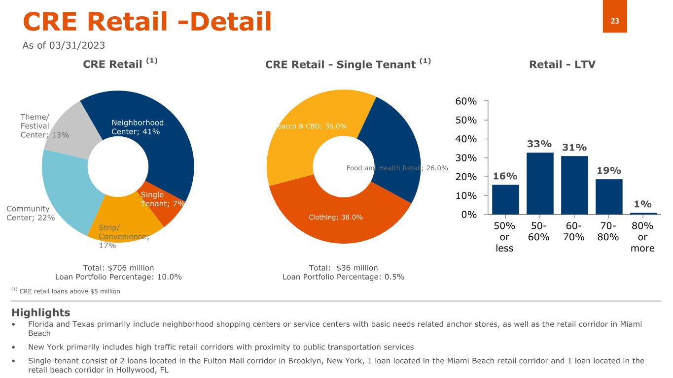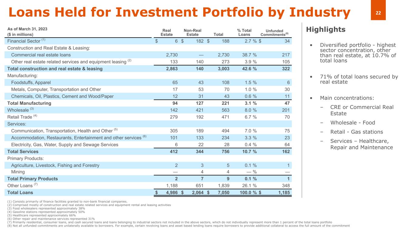 22Loans Held for Investment Portfolio by Industry • Diversified portfolio - highest sector concentration, other than real estate, at 10.7% of total loans • 71% of total loans secured by real estate • Main concentrations: – CRE or Commercial Real Estate – Wholesale - Food – Retail - Gas stations – Services – Healthcare, Repair and Maintenance Highlights (1) Consists primarily of finance facilities granted to non-bank financial companies. (2) Comprised mostly of construction and real estate related services and equipment rental and leasing activities (3) Food wholesalers represented approximately 38% (4) Gasoline stations represented approximately 50% (5) Healthcare represented approximately 66% (6) Other repair and maintenance services represented 31% (7) Primarily residential, consumer loans, and cash secured loans and loans belonging to industrial sectors not included in the above sectors, which do not individually represent more than 1 percent of the total loans portfolio (8) Not all unfunded commitments are unilaterally available to borrowers. For example, certain revolving loans and asset based lending loans require borrowers to provide additional collateral to access the full amount of the commitment ($ in millions) Real Estate Non-Real Estate Total % Total Loans Unfunded Commitments(8) Financial Sector (1) $ 6 $ 182 $ 188 2.7 % $ 34 Construction and Real Estate & Leasing: Commercial real estate loans 2,730 — 2,730 38.7 % 217 Other real estate related services and equipment leasing (2) 133 140 273 3.9 % 105 Total construction and real estate & leasing 2,863 140 3,003 42.6 % 322 Manufacturing: Foodstuffs, Apparel 65 43 108 1.5 % 6 Metals, Computer, Transportation and Other 17 53 70 1.0 % 30 Chemicals, Oil, Plastics, Cement and Wood/Paper 12 31 43 0.6 % 11 Total Manufacturing 94 127 221 3.1 % 47 Wholesale (3) 142 421 563 8.0 % 201 Retail Trade (4) 279 192 471 6.7 % 70 Services: Communication, Transportation, Health and Other (5) 305 189 494 7.0 % 75 Accommodation, Restaurants, Entertainment and other services (6) 101 133 234 3.3 % 23 Electricity, Gas, Water, Supply and Sewage Services 6 22 28 0.4 % 64 Total Services 412 344 756 10.7 % 162 Primary Products: Agriculture, Livestock, Fishing and Forestry 2 3 5 0.1 % 1 Mining — 4 4 — % — Total Primary Products 2 7 9 0.1 % 1 Other Loans (7) 1,188 651 1,839 26.1 % 348 Total Loans $ 4,986 $ 2,064 $ 7,050 100.0 % $ 1,185 As of March 31, 2023