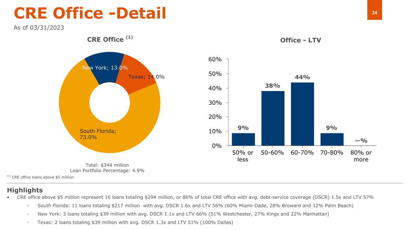 23 16% 33% 31% 19% 1% 50% or less 50- 60% 60- 70% 70- 80% 80% or more 0% 10% 20% 30% 40% 50% 60% CRE Retail -Detail As of 03/31/2023 • Florida and Texas primarily include neighborhood shopping centers or service centers with basic needs related anchor stores, as well as the retail corridor in Miami Beach • New York primarily includes high traffic retail corridors with proximity to public transportation services • Single-tenant consist of 2 loans located in the Fulton Mall corridor in Brooklyn, New York, 1 loan located in the Miami Beach retail corridor and 1 loan located in the retail beach corridor in Hollywood, FL Highlights CRE Retail (1) Retail - LTV Food and Health Retail; 26.0% Clothing; 38.0% Tobacco & CBD; 36.0% CRE Retail - Single Tenant (1) (1) CRE retail loans above $5 million Total: $706 million Loan Portfolio Percentage: 10.0% Total: $36 million Loan Portfolio Percentage: 0.5% Neighborhood Center; 41% Single Tenant; 7% Strip/ Convenience; 17% Community Center; 22% Theme/ Festival Center; 13%