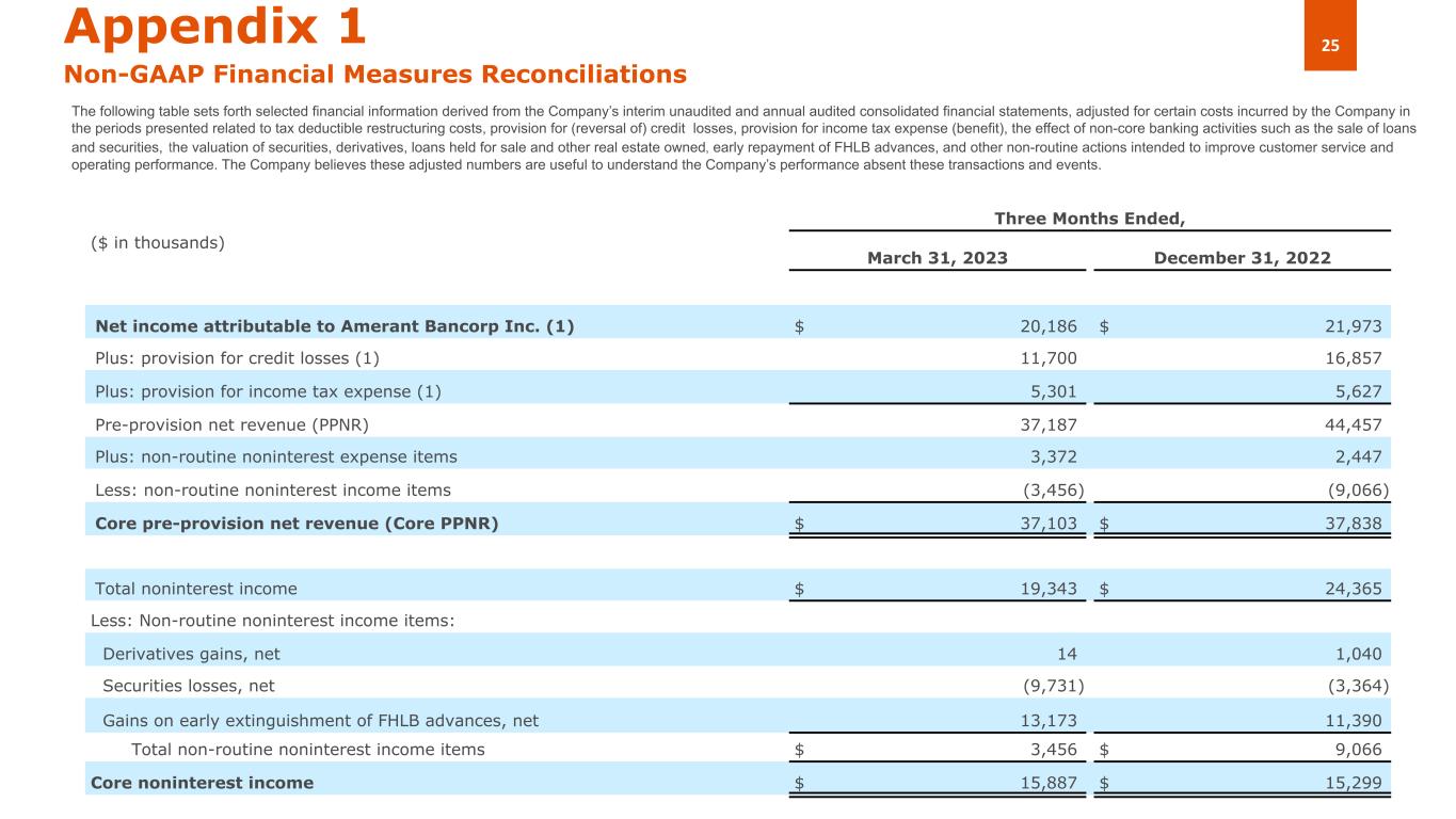 25Appendix 1 Non-GAAP Financial Measures Reconciliations The following table sets forth selected financial information derived from the Company’s interim unaudited and annual audited consolidated financial statements, adjusted for certain costs incurred by the Company in the periods presented related to tax deductible restructuring costs, provision for (reversal of) credit losses, provision for income tax expense (benefit), the effect of non-core banking activities such as the sale of loans and securities, the valuation of securities, derivatives, loans held for sale and other real estate owned, early repayment of FHLB advances, and other non-routine actions intended to improve customer service and operating performance. The Company believes these adjusted numbers are useful to understand the Company’s performance absent these transactions and events. Three Months Ended, ($ in thousands) March 31, 2023 December 31, 2022 Net income attributable to Amerant Bancorp Inc. (1) $ 20,186 $ 21,973 Plus: provision for credit losses (1) 11,700 16,857 Plus: provision for income tax expense (1) 5,301 5,627 Pre-provision net revenue (PPNR) 37,187 44,457 Plus: non-routine noninterest expense items 3,372 2,447 Less: non-routine noninterest income items (3,456) (9,066) Core pre-provision net revenue (Core PPNR) $ 37,103 $ 37,838 Total noninterest income $ 19,343 $ 24,365 Less: Non-routine noninterest income items: Derivatives gains, net 14 1,040 Securities losses, net (9,731) (3,364) Gains on early extinguishment of FHLB advances, net 13,173 11,390 Total non-routine noninterest income items $ 3,456 $ 9,066 Core noninterest income $ 15,887 $ 15,299