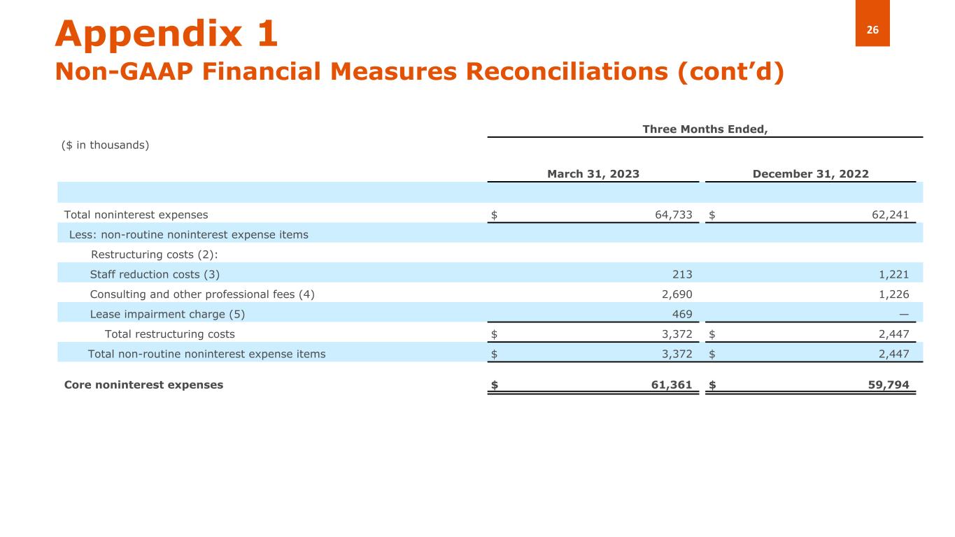 26 Three Months Ended, ($ in thousands) March 31, 2023 December 31, 2022 Total noninterest expenses $ 64,733 $ 62,241 Less: non-routine noninterest expense items Restructuring costs (2): Staff reduction costs (3) 213 1,221 Consulting and other professional fees (4) 2,690 1,226 Lease impairment charge (5) 469 — Total restructuring costs $ 3,372 $ 2,447 Total non-routine noninterest expense items $ 3,372 $ 2,447 Core noninterest expenses $ 61,361 $ 59,794 Appendix 1 Non-GAAP Financial Measures Reconciliations (cont’d)