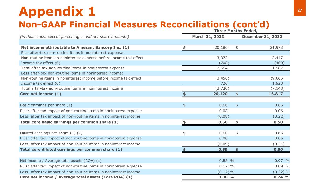 27Appendix 1 Non-GAAP Financial Measures Reconciliations (cont’d) Three Months Ended, (in thousands, except percentages and per share amounts) March 31, 2023 December 31, 2022 Net income attributable to Amerant Bancorp Inc. (1) $ 20,186 $ 21,973 Plus after-tax non-routine items in noninterest expense: Non-routine items in noninterest expense before income tax effect 3,372 2,447 Income tax effect (6) (708) (460) Total after-tax non-routine items in noninterest expense 2,664 1,987 Less after-tax non-routine items in noninterest income: Non-routine items in noninterest income before income tax effect (3,456) (9,066) Income tax effect (6) 726 1,923 Total after-tax non-routine items in noninterest income (2,730) (7,143) Core net income (1) $ 20,120 $ 16,817 Basic earnings per share (1) $ 0.60 $ 0.66 Plus: after tax impact of non-routine items in noninterest expense 0.08 0.06 Less: after tax impact of non-routine items in noninterest income (0.08) (0.22) Total core basic earnings per common share (1) $ 0.60 $ 0.50 Diluted earnings per share (1) (7) $ 0.60 $ 0.65 Plus: after tax impact of non-routine items in noninterest expense 0.08 0.06 Less: after tax impact of non-routine items in noninterest income (0.09) (0.21) Total core diluted earnings per common share (1) $ 0.59 $ 0.50 Net income / Average total assets (ROA) (1) 0.88 % 0.97 % Plus: after tax impact of non-routine items in noninterest expense 0.12 % 0.09 % Less: after tax impact of non-routine items in noninterest income (0.12) % (0.32) % Core net income / Average total assets (Core ROA) (1) 0.88 % 0.74 %
