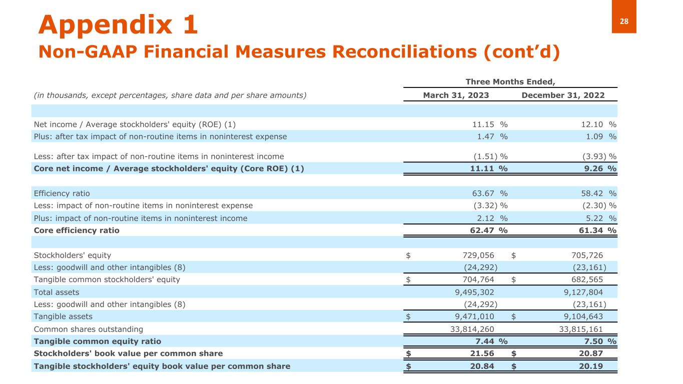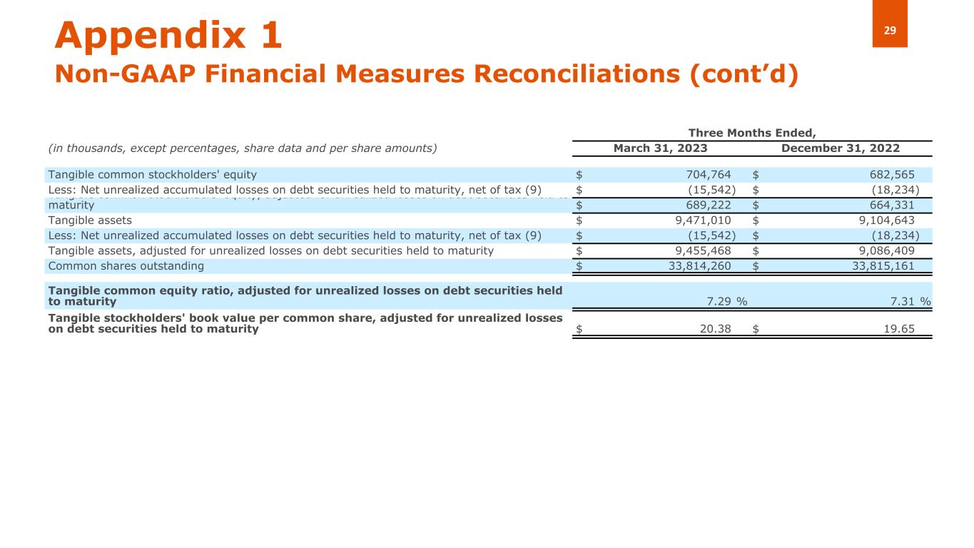 28Appendix 1 Non-GAAP Financial Measures Reconciliations (cont’d) Three Months Ended, (in thousands, except percentages, share data and per share amounts) March 31, 2023 December 31, 2022 Net income / Average stockholders' equity (ROE) (1) 11.15 % 12.10 % Plus: after tax impact of non-routine items in noninterest expense 1.47 % 1.09 % Less: after tax impact of non-routine items in noninterest income (1.51) % (3.93) % Core net income / Average stockholders' equity (Core ROE) (1) 11.11 % 9.26 % Efficiency ratio 63.67 % 58.42 % Less: impact of non-routine items in noninterest expense (3.32) % (2.30) % Plus: impact of non-routine items in noninterest income 2.12 % 5.22 % Core efficiency ratio 62.47 % 61.34 % Stockholders' equity $ 729,056 $ 705,726 Less: goodwill and other intangibles (8) (24,292) (23,161) Tangible common stockholders' equity $ 704,764 $ 682,565 Total assets 9,495,302 9,127,804 Less: goodwill and other intangibles (8) (24,292) (23,161) Tangible assets $ 9,471,010 $ 9,104,643 Common shares outstanding 33,814,260 33,815,161 Tangible common equity ratio 7.44 % 7.50 % Stockholders' book value per common share $ 21.56 $ 20.87 Tangible stockholders' equity book value per common share $ 20.84 $ 20.19