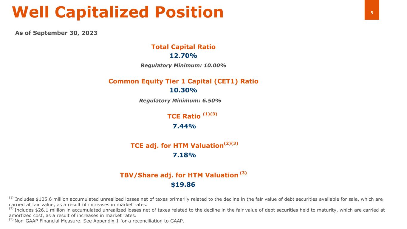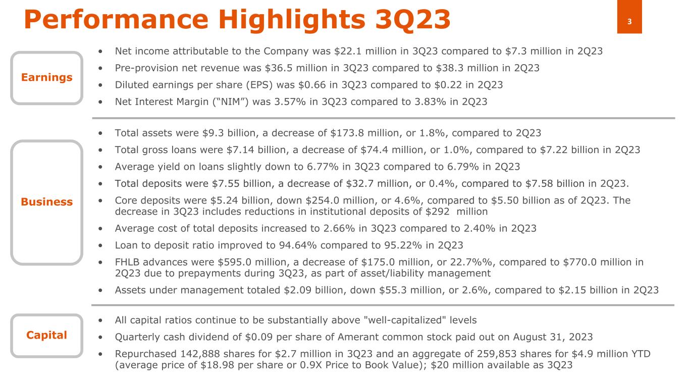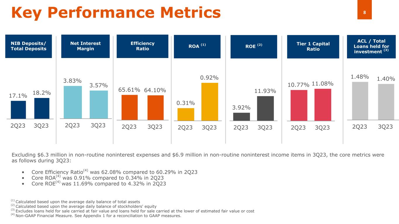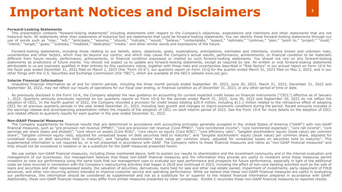 2 Forward-Looking Statements This presentation contains “forward-looking statements” including statements with respect to the Company’s objectives, expectations and intentions and other statements that are not historical facts. All statements other than statements of historical fact are statements that could be forward-looking statements. You can identify these forward-looking statements through our use of words such as “may,” “will,” “anticipate,” “assume,” “should,” “indicate,” “would,” “believe,” “contemplate,” “expect,” “estimate,” “continue,” “plan,” “point to,” “project,” “could,” “intend,” “target,” “goals,” “outlooks,” “modeled,” “dedicated,” “create,” and other similar words and expressions of the future. Forward-looking statements, including those relating to our beliefs, plans, objectives, goals, expectations, anticipations, estimates and intentions, involve known and unknown risks, uncertainties and other factors, which may be beyond our control, and which may cause the Company’s actual results, performance, achievements, or financial condition to be materially different from future results, performance, achievements, or financial condition expressed or implied by such forward-looking statements. You should not rely on any forward-looking statements as predictions of future events. You should not expect us to update any forward-looking statements, except as required by law. All written or oral forward-looking statements attributable to us are expressly qualified in their entirety by this cautionary notice, together with those risks and uncertainties described in “Risk factors” in our annual report on Form 10-K for the fiscal year ended December 31, 2022 filed on March 1, 2023 (the "Form 10-K"), our quarterly report on Form 10-Q for the quarter ended March 31, 2023 filed on May 2, 2023, and in our other filings with the U.S. Securities and Exchange Commission (the “SEC”), which are available at the SEC’s website www.sec.gov. Interim Financial Information Unaudited financial information as of and for interim periods, including the three month periods ended September 30, 2023, June 30, 2023, March 31, 2023, December 31, 2022 and September 30, 2022, may not reflect our results of operations for our fiscal year ending, or financial condition as of December 31, 2023, or any other period of time or date. As previously disclosed in the Form 10-K, the Company adopted the new guidance on accounting for current expected credit losses on financial instruments (“CECL”) effective as of January 1, 2022. Quarterly amounts previously reported on our quarterly reports on Form 10-Q for the periods ended March 31, 2022, June 30, 2022 and September 30, 2022 do not reflect the adoption of CECL. In the fourth quarter of 2022, the Company recorded a provision for credit losses totaling $20.9 million, including $11.1 million related to the retroactive effect of adopting CECL for all previous quarterly periods in the year ended December 31, 2022, including loan growth and changes to macro-economic conditions during the period. Recast amounts included in the earnings release and accompanying presentation reflect the impacts of the adoption of CECL on each interim period of 2022. See the Form 10-K for more details on the adoption of CECL and related effects to quarterly results for each quarter in the year ended December 31, 2022. Non-GAAP Financial Measures The Company supplements its financial results that are determined in accordance with accounting principles generally accepted in the United States of America (“GAAP”) with non-GAAP financial measures, such as “pre-provision net revenue (PPNR)”, “core pre-provision net revenue (Core PPNR)”, “core noninterest income”, “core noninterest expenses”, “core net income”, “core earnings per share (basic and diluted)”, “core return on assets (Core ROA)”, “core return on equity (Core ROE)”, “core efficiency ratio”, “tangible stockholders’ equity (book value) per common share”, “tangible common equity ratio, adjusted for unrealized losses on debt securities held to maturity”, and “tangible stockholders' equity (book value) per common share, adjusted for unrealized losses on debt securities held to maturity”, and "tangible stockholders' book value per common share, adjusted for unrealized losses on securities held to maturity". This supplemental information is not required by, or is not presented in accordance with GAAP. The Company refers to these financial measures and ratios as “non-GAAP financial measures” and they should not be considered in isolation or as a substitute for the GAAP measures presented herein. We use certain non-GAAP financial measures, including those mentioned above, both to explain our results to shareholders and the investment community and in the internal evaluation and management of our businesses. Our management believes that these non-GAAP financial measures and the information they provide are useful to investors since these measures permit investors to view our performance using the same tools that our management uses to evaluate our past performance and prospects for future performance, especially in light of the additional costs we have incurred in connection with the Company’s restructuring activities that began in 2018 and continued in 2023, including the effect of non-core banking activities such as the sale of loans and securities and other repossessed assets, the valuation of securities, derivatives, loans held for sale and other real estate owned, impairment of investments, early repayment of FHLB advances, and other non-recurring actions intended to improve customer service and operating performance. While we believe that these non-GAAP financial measures are useful in evaluating our performance, this information should be considered as supplemental an
