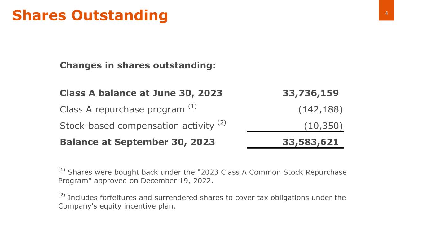 4 (1) Shares were bought back under the "2023 Class A Common Stock Repurchase Program" approved on December 19, 2022. (2) Includes forfeitures and surrendered shares to cover tax obligations under the Company's equity incentive plan. Shares Outstanding Changes in shares outstanding: Class A balance at June 30, 2023 33,736,159 Class A repurchase program (1) (142,188) Stock-based compensation activity (2) (10,350) Balance at September 30, 2023 33,583,621