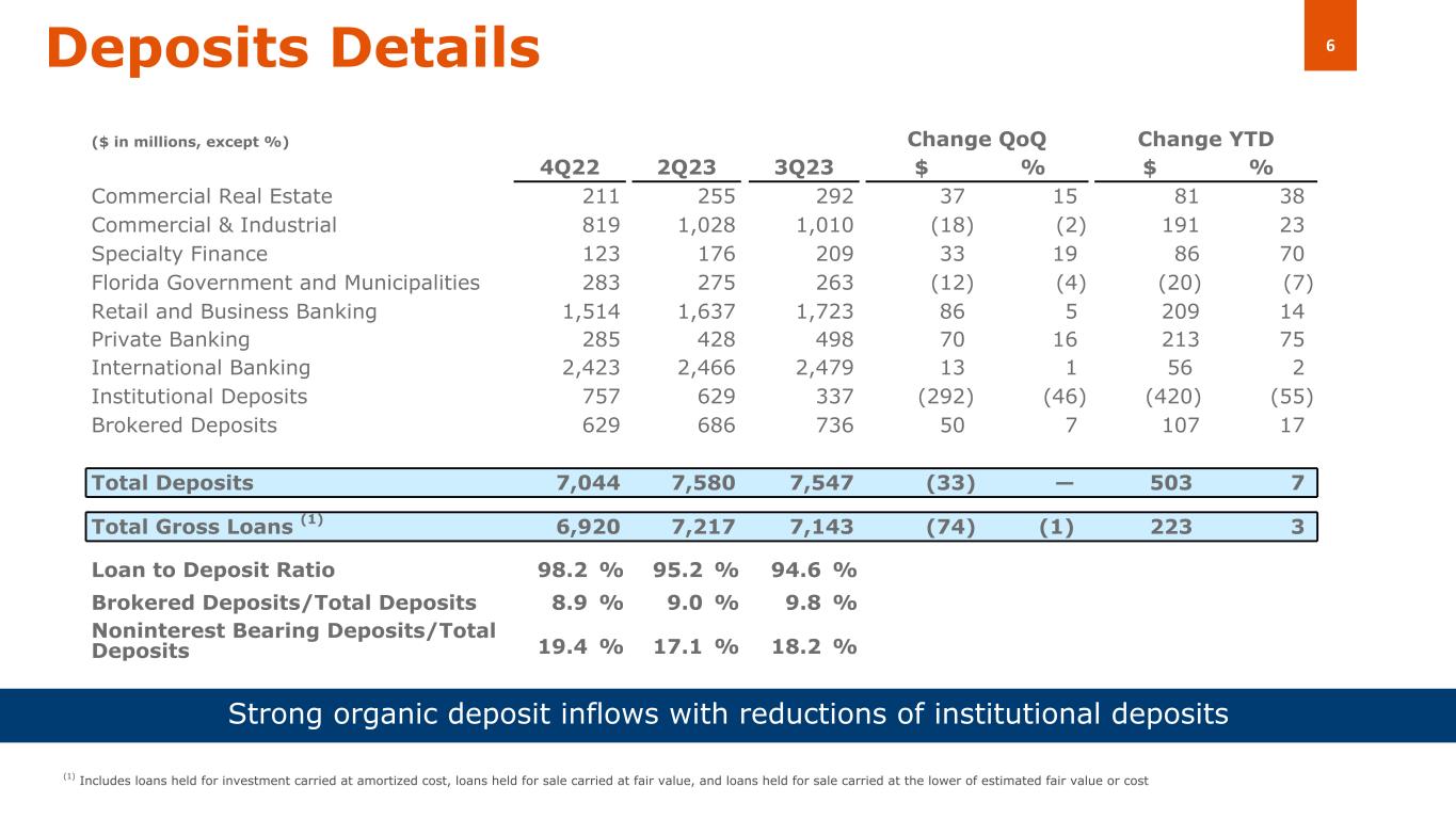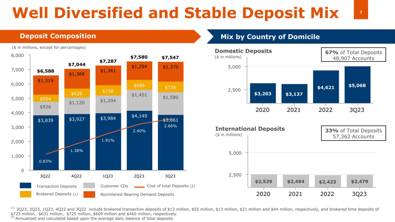 6 ($ in millions, except %) Change QoQ Change YTD 4Q22 2Q23 3Q23 $ % $ % Commercial Real Estate 211 255 292 37 15 81 38 Commercial & Industrial 819 1,028 1,010 (18) (2) 191 23 Specialty Finance 123 176 209 33 19 86 70 Florida Government and Municipalities 283 275 263 (12) (4) (20) (7) Retail and Business Banking 1,514 1,637 1,723 86 5 209 14 Private Banking 285 428 498 70 16 213 75 International Banking 2,423 2,466 2,479 13 1 56 2 Institutional Deposits 757 629 337 (292) (46) (420) (55) Brokered Deposits 629 686 736 50 7 107 17 Total Deposits 7,044 7,580 7,547 (33) — 503 7 Total Gross Loans (1) 6,920 7,217 7,143 (74) (1) 223 3 Loan to Deposit Ratio 98.2 % 95.2 % 94.6 % Brokered Deposits/Total Deposits 8.9 % 9.0 % 9.8 % Noninterest Bearing Deposits/Total Deposits 19.4 % 17.1 % 18.2 % Strong organic deposit inflows with reductions of institutional deposits Deposits Details (1) Includes loans held for investment carried at amortized cost, loans held for sale carried at fair value, and loans held for sale carried at the lower of estimated fair value or cost