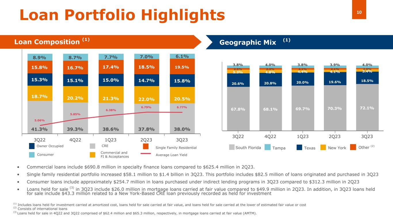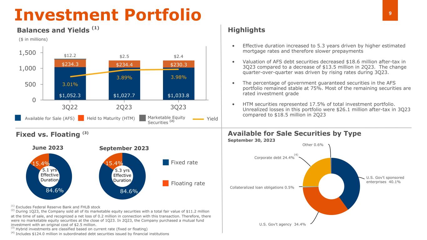 9 84.6% 15.4% U.S. Gov't sponsored enterprises 40.1% U.S. Gov't agency 34.4% Collateralized loan obligations 0.5% Corporate debt 24.4% Other 0.6% $1,052.3 $1,027.7 $1,033.8 $234.3 $234.4 $230.3 $12.2 $2.5 $2.4 3.01% 3.89% 3.98% 3Q22 2Q23 3Q23 0 500 1,000 1,500 84.6% 15.4% Investment Portfolio Balances and Yields (1) Available for Sale (AFS) Held to Maturity (HTM) Highlights Fixed vs. Floating (3) June 2023 September 2023 Floating rate Fixed rate Available for Sale Securities by Type September 30, 2023 5.1 yrs Effective Duration ($ in millions) Marketable Equity Securities (2) (1) Excludes Federal Reserve Bank and FHLB stock (2) During 1Q23, the Company sold all of its marketable equity securities with a total fair value of $11.2 million at the time of sale, and recognized a net loss of 0.2 million in connection with this transaction. Therefore, there were no marketable equity securities at the close of 1Q23. In 2Q23, the Company purchased a mutual fund investment with an original cost of $2.5 million. (3) Hybrid investments are classified based on current rate (fixed or floating) (4) Includes $124.0 million in subordinated debt securities issued by financial institutions Yield 5.3 yrs Effective Duration • Effective duration increased to 5.3 years driven by higher estimated mortgage rates and therefore slower prepayments • Valuation of AFS debt securities decreased $18.6 million after-tax in 3Q23 compared to a decrease of $13.5 million in 2Q23. The change quarter-over-quarter was driven by rising rates during 3Q23. • The percentage of government guaranteed securities in the AFS portfolio remained stable at 75%. Most of the remaining securities are rated investment grade • HTM securities represented 17.5% of total investment portfolio. Unrealized losses in this portfolio were $26.1 million after-tax in 3Q23 compared to $18.5 million in 2Q23 (4)