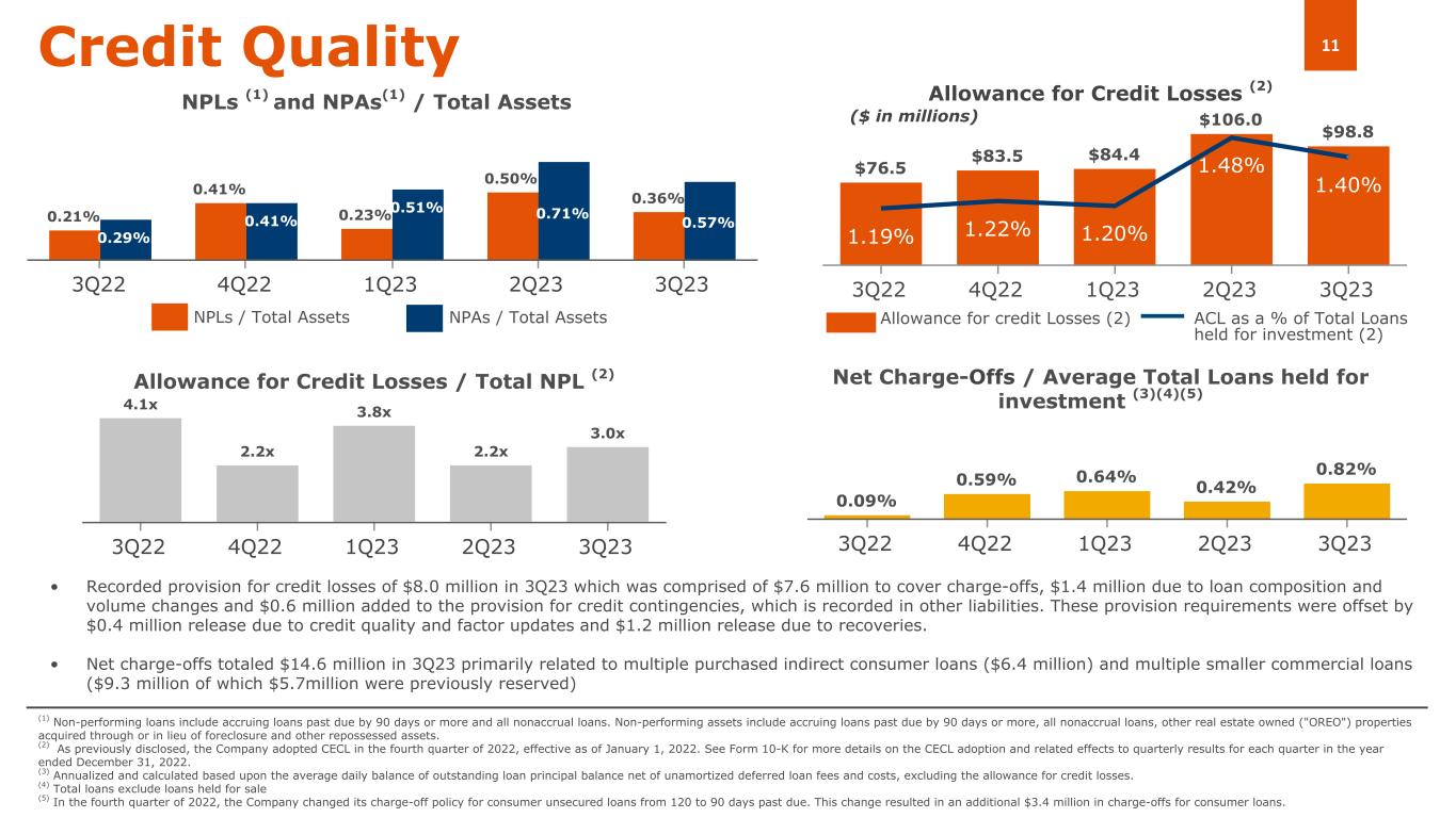 10 41.3% 39.3% 38.6% 37.8% 38.0% 18.7% 20.2% 21.3% 22.0% 20.5% 15.3% 15.1% 15.0% 14.7% 15.8% 15.8% 16.7% 17.4% 18.5% 19.5% 8.9% 8.7% 7.7% 7.0% 6.1% 5.06% 5.85% 6.38% 6.79% 6.77% 3Q22 4Q22 1Q23 2Q23 3Q23 67.8% 68.1% 69.7% 70.3% 72.1% 20.6% 20.8% 20.0% 19.6% 18.5% 5.3% 4.8% 4.4% 4.1% 3.4% 2.5% 2.3% 2.1% 2.1% 2.0% 3.8% 4.0% 3.8% 3.9% 4.0% 3Q22 4Q22 1Q23 2Q23 3Q23 Consumer CRE Commercial and FI & Acceptances Owner Occupied Single Family Residential Loan Portfolio Highlights Loan Composition (1) Geographic Mix (Domestic) • Commercial loans include $690.8 million in specialty finance loans compared to $625.4 million in 2Q23. • Single family residential portfolio increased $58.1 million to $1.4 billion in 3Q23. This portfolio includes $82.5 million of loans originated and purchased in 3Q23 • Consumer loans include approximately $254.7 million in loans purchased under indirect lending programs in 3Q23 compared to $312.3 million in 2Q23 • Loans held for sale (3) in 3Q23 include $26.0 million in mortgage loans carried at fair value compared to $49.9 million in 2Q23. In addition, in 3Q23 loans held for sale include $43.3 million related to a New York-Based CRE loan previously recorded as held for investment (1) South Florida Texas New York Average Loan Yield Other (2) (1) Includes loans held for investment carried at amortized cost, loans held for sale carried at fair value, and loans held for sale carried at the lower of estimated fair value or cost (2) Consists of international loans (3) Loans held for sale in 4Q22 and 3Q22 comprised of $62.4 million and $65.3 million, respectively, in mortgage loans carried at fair value (AMTM). Tampa