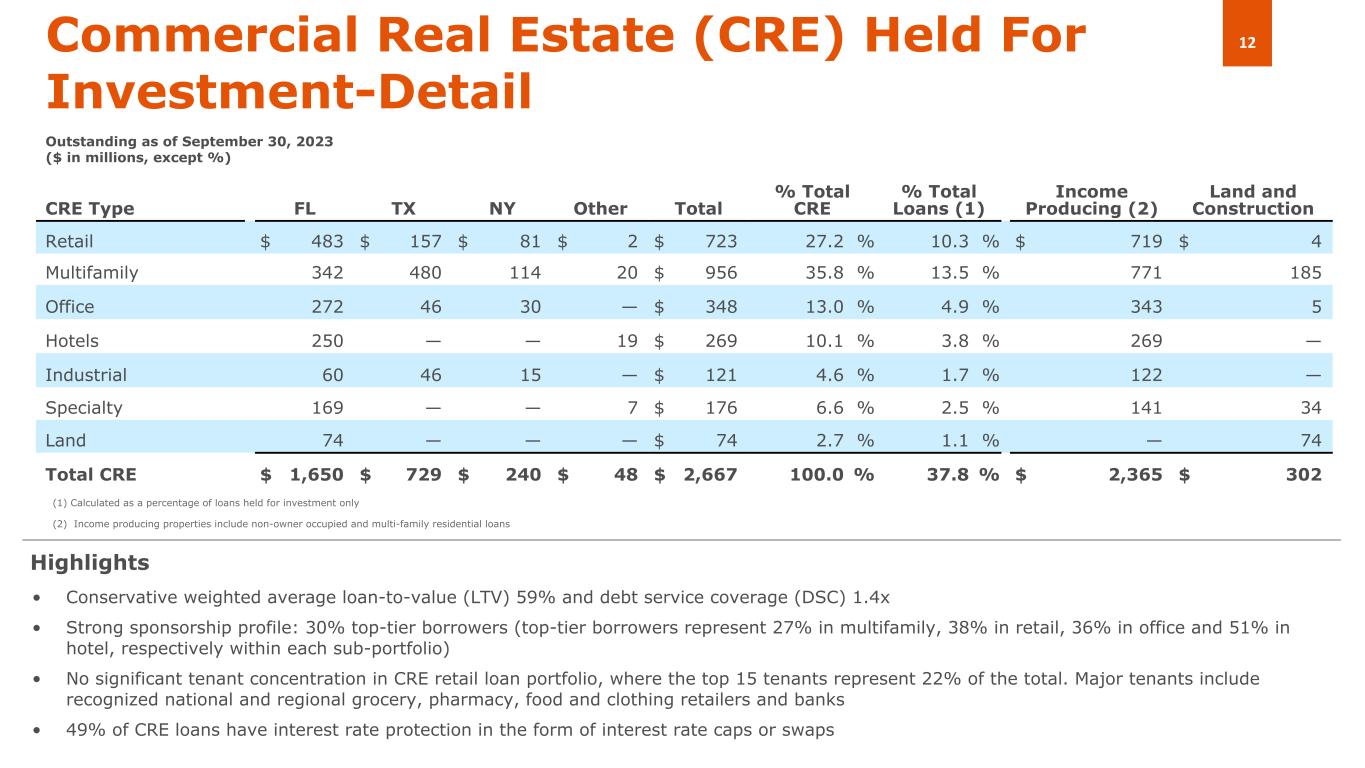 12Commercial Real Estate (CRE) Held For Investment-Detail CRE Type FL TX NY Other Total % Total CRE % Total Loans (1) Income Producing (2) Land and Construction Retail $ 483 $ 157 $ 81 $ 2 $ 723 27.2 % 10.3 % $ 719 $ 4 Multifamily 342 480 114 20 $ 956 35.8 % 13.5 % 771 185 Office 272 46 30 — $ 348 13.0 % 4.9 % 343 5 Hotels 250 — — 19 $ 269 10.1 % 3.8 % 269 — Industrial 60 46 15 — $ 121 4.6 % 1.7 % 122 — Specialty 169 — — 7 $ 176 6.6 % 2.5 % 141 34 Land 74 — — — $ 74 2.7 % 1.1 % — 74 Total CRE $ 1,650 $ 729 $ 240 $ 48 $ 2,667 100.0 % 37.8 % $ 2,365 $ 302 • Conservative weighted average loan-to-value (LTV) 59% and debt service coverage (DSC) 1.4x • Strong sponsorship profile: 30% top-tier borrowers (top-tier borrowers represent 27% in multifamily, 38% in retail, 36% in office and 51% in hotel, respectively within each sub-portfolio) • No significant tenant concentration in CRE retail loan portfolio, where the top 15 tenants represent 22% of the total. Major tenants include recognized national and regional grocery, pharmacy, food and clothing retailers and banks • 49% of CRE loans have interest rate protection in the form of interest rate caps or swaps Highlights Outstanding as of September 30, 2023 ($ in millions, except %) (1) Calculated as a percentage of loans held for investment only (2) Income producing properties include non-owner occupied and multi-family residential loans