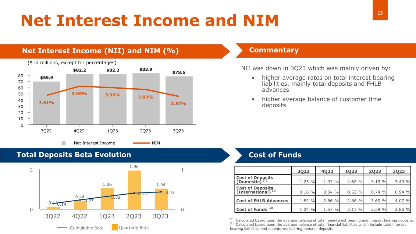 13 $69.9 $82.2 $82.3 $83.9 $78.6 3.61% 3.96% 3.90% 3.83% 3.57% Net Interest Income NIM 3Q22 4Q22 1Q23 2Q23 3Q23 0 10 20 30 40 50 60 70 80 NII was down in 3Q23 which was mainly driven by: • higher average rates on total interest bearing liabilities, mainly total deposits and FHLB advances • higher average balance of customer time deposits Net Interest Income and NIM Net Interest Income (NII) and NIM (%) Total Deposits Beta Evolution ($ in millions, except for percentages) Commentary 3Q22 4Q22 1Q23 2Q23 3Q23 Cost of Deposits (Domestic) (1) 1.25 % 1.97 % 2.62 % 3.19 % 3.49 % Cost of Deposits (International) (1) 0.16 % 0.34 % 0.53 % 0.74 % 0.94 % Cost of FHLB Advances 1.82 % 2.86 % 2.86 % 3.69 % 4.07 % Cost of Funds (2) 1.04 % 1.57 % 2.11 % 2.59 % 2.86 % Cost of Funds 0.14 0.44 1.06 1.96 1.04 0.14 0.23 0.32 0.40 0.43 3Q22 4Q22 1Q23 2Q23 3Q23 0 2 0 1 (1) Calculated based upon the average balance of total noninterest bearing and interest bearing deposits. (2) Calculated based upon the average balance of total financial liabilities which include total interest bearing liabilities and noninterest bearing demand depositsQuarterly BetaCumulative Beta