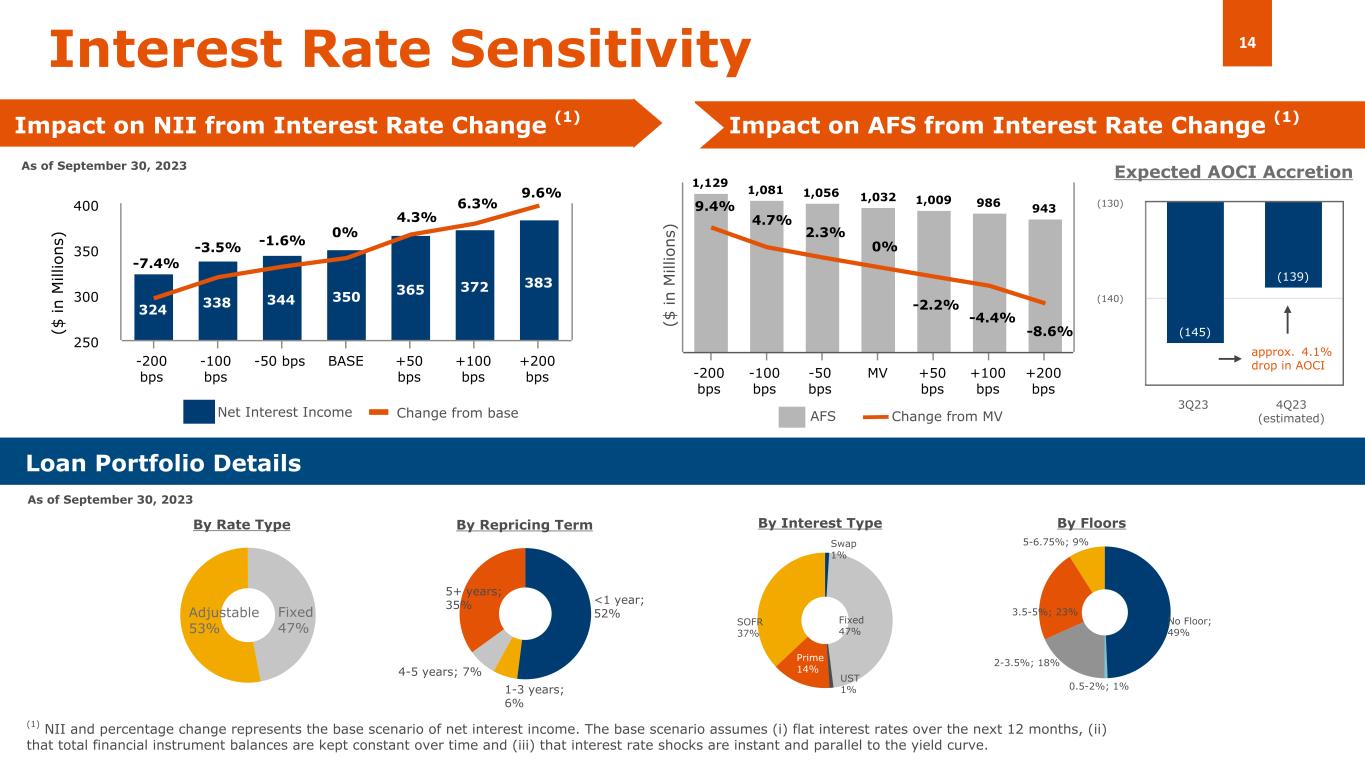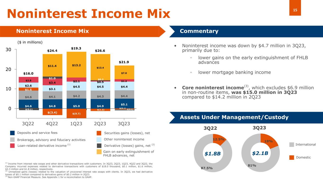 14 <1 year; 52% 1-3 years; 6% 4-5 years; 7% 5+ years; 35% 324 338 344 350 365 372 383 -200 bps -100 bps -50 bps BASE +50 bps +100 bps +200 bps 250 300 350 400 As of September 30, 2023 Fixed 47% Adjustable 53% Interest Rate Sensitivity By Interest TypeBy Rate Type By Repricing Term (1) NII and percentage change represents the base scenario of net interest income. The base scenario assumes (i) flat interest rates over the next 12 months, (ii) that total financial instrument balances are kept constant over time and (iii) that interest rate shocks are instant and parallel to the yield curve. Loan Portfolio Details Impact on NII from Interest Rate Change (1) AFSChange from base ($ in M ill io ns ) Swap 1% Fixed 47% UST 1% Prime 14% SOFR 37% As of September 30, 2023 Impact on AFS from Interest Rate Change (1) -7.4% -3.5% 0% 6.3% 4.3% -1.6% 9.6% No Floor; 49% 0.5-2%; 1% 2-3.5%; 18% 3.5-5%; 23% 5-6.75%; 9% By Floors 1,129 1,081 1,056 1,032 1,009 986 943 -200 bps -100 bps -50 bps MV +50 bps +100 bps +200 bps ($ in M ill io ns ) 9.4% 4.7% 2.3% 0% -2.2% -4.4% -8.6% Expected AOCI Accretion Change from MVNet Interest Income (145) (139) 3Q23 4Q23 (estimated) (140) (130) approx. 4.1% drop in AOCI