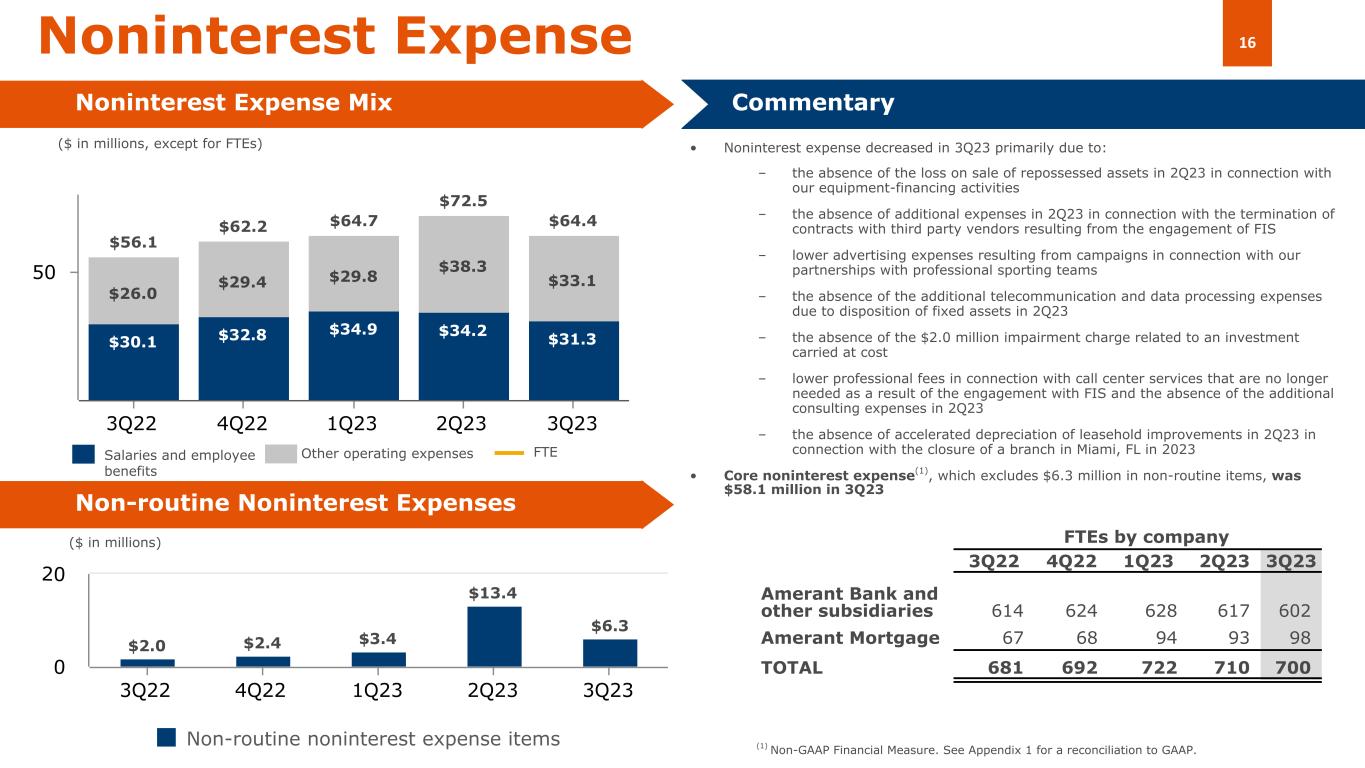 15 $16.0 $24.4 $19.3 $26.6 $21.9 $4.6 $4.8 $5.0 $4.9 $5.1 $4.6 $4.1 $4.2 $4.3 $4.4 $1.5 $(3.4) $(9.7) $2.6 $3.1 $4.5 $4.5 $4.4 $2.8 $3.4 $2.1 $0.5 $1.2 $1.0 $11.4 $13.2 $13.4 $7.0 3Q22 4Q22 1Q23 2Q23 3Q23 0 10 20 30 12.5% 87.5% 19% 81% Noninterest Income Mix Noninterest Income Mix Commentary Assets Under Management/Custody Deposits and service fees Brokerage, advisory and fiduciary activities Other noninterest income $2.1B Domestic International 3Q233Q22 $1.8B ($ in millions) Securities gains (losses), net (1) Income from interest rate swaps and other derivative transactions with customers. In 3Q23, 2Q23, 1Q23, 4Q22 and 3Q22, the Company incurred expenses related to derivative transactions with customers of $18.0 thousand, $0.1 million, $1.6 million, $3.3 million and $1.8 million, respectively. (2) Unrealized gains (losses) related to the valuation of uncovered interest rate swaps with clients. In 3Q23, we had derivative losses of $0.1 million compared to derivative gains of $0.2 million in 2Q23. (3) Non-GAAP Financial Measure. See Appendix 1 for a reconciliation to GAAP. Loan-related derivative income (1) Derivative (losses) gains, net (2) $62.4 Gain on early extinguishment of FHLB advances, net • Noninterest income was down by $4.7 million in 3Q23, primarily due to: ◦ lower gains on the early extinguishment of FHLB advances ◦ lower mortgage banking income • Core noninterest income(3), which excludes $6.9 million in non-routine items, was $15.0 million in 3Q23 compared to $14.2 million in 2Q23 $(0.1) $0.2 $(1.2) $(0.1) $(0.1)